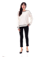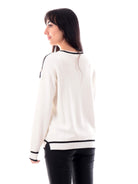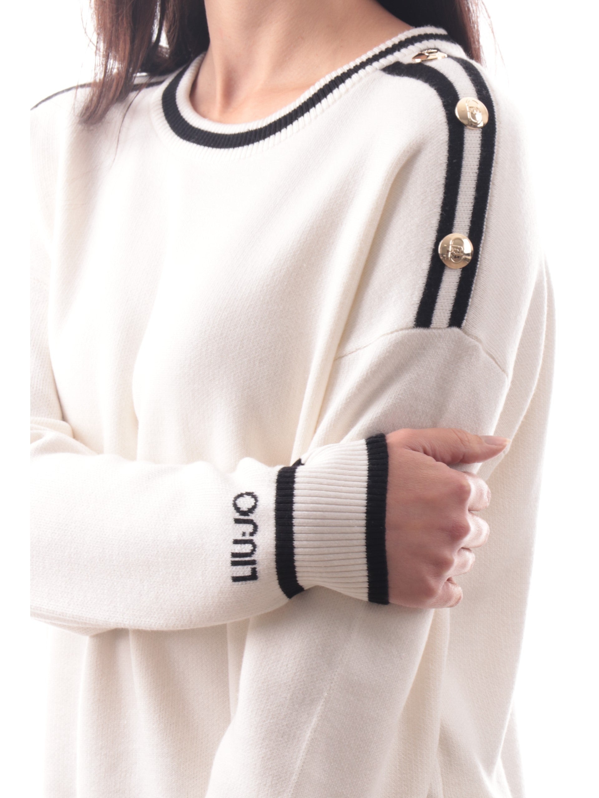 Maglione bianco Liu Jo da donna. Questo maglione Liu Jo bianco realizzato in viscosa è caratterizzato dal girocollo, righe a contrasto, bottoni decorativi dorati applicati sulla spalla sinistra, polsini e fondo elasticizzati a costine. scritta Liu Jo nera applicata sulla manica destra in basso. Questa maglia Bianca Liu Jo da donna è perfetta sopra un jeans e su un look casual