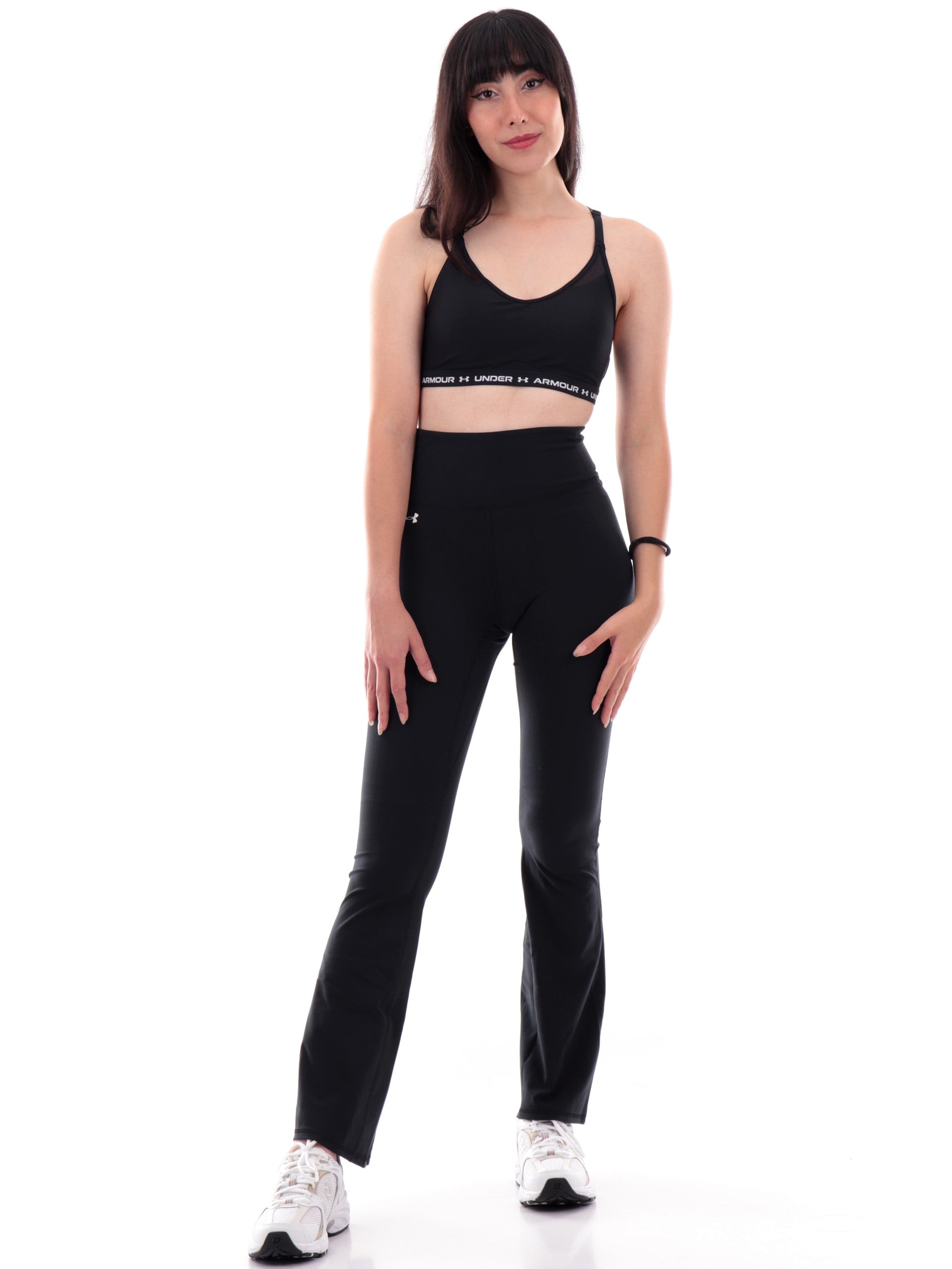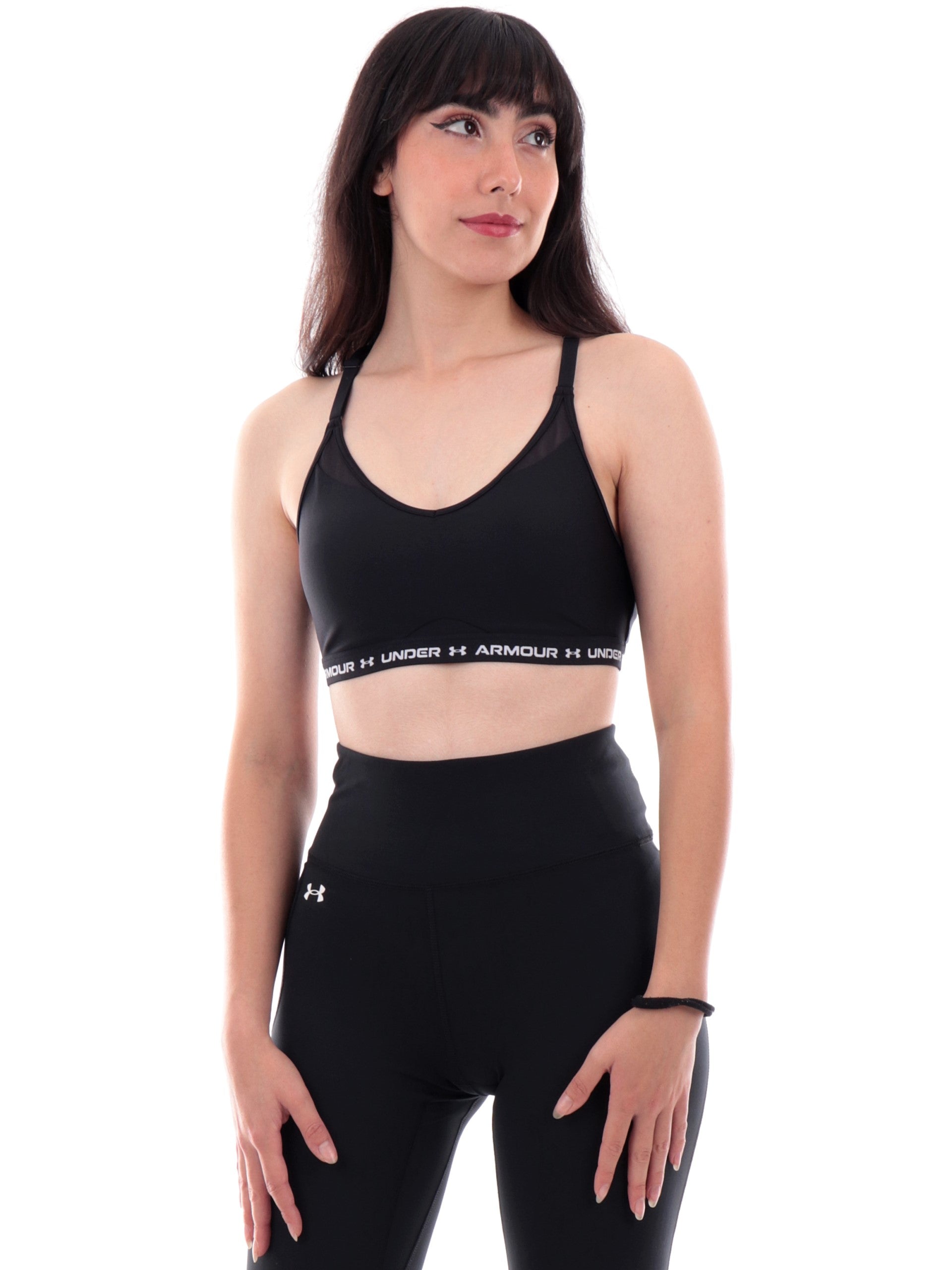 Top sport Under Armour nero da donna Crossback Low 13864240, realizzato in tessuto tecnico traspirante. Questo reggiseno sport Under Armour nero ha le bretelle intrecciate regolabili e il fondo elasticizzato con banda logata.