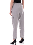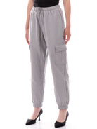Pantaloni cargo Calvin Klein grigi da donna Archive Logo LV047B269G, realizzati in cotone. Questi cargo Calvin Klein grigi hanno la banda elastica sul punto vita regolabile con laccetti, due tasche laterali aperte, una tasca posteriore, due tasconi altezza ginocchio e polsini elasticizzati.