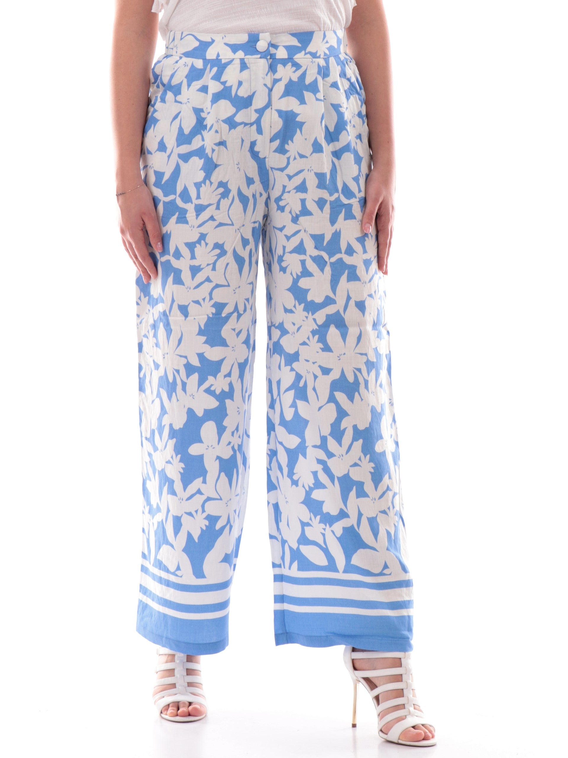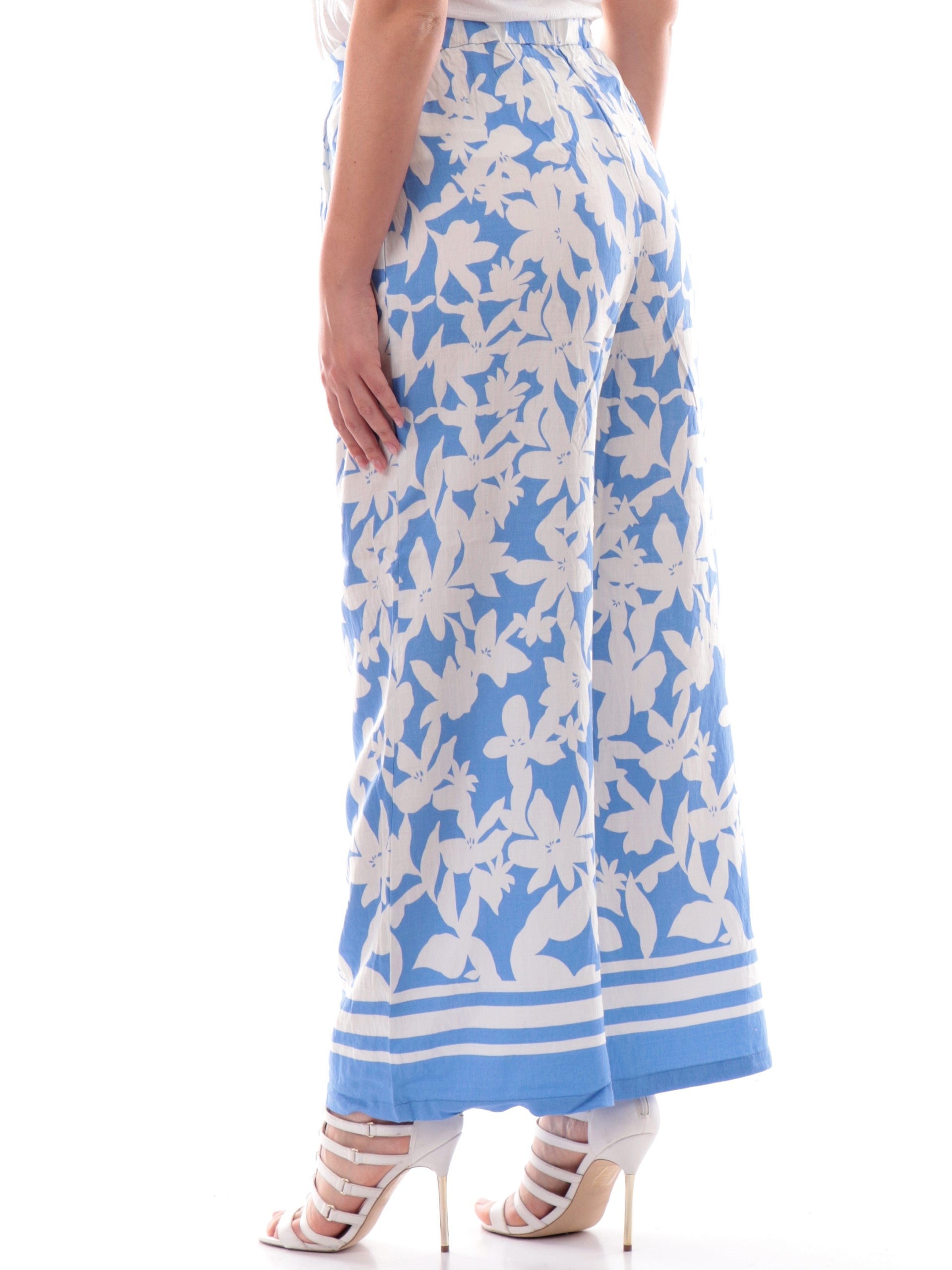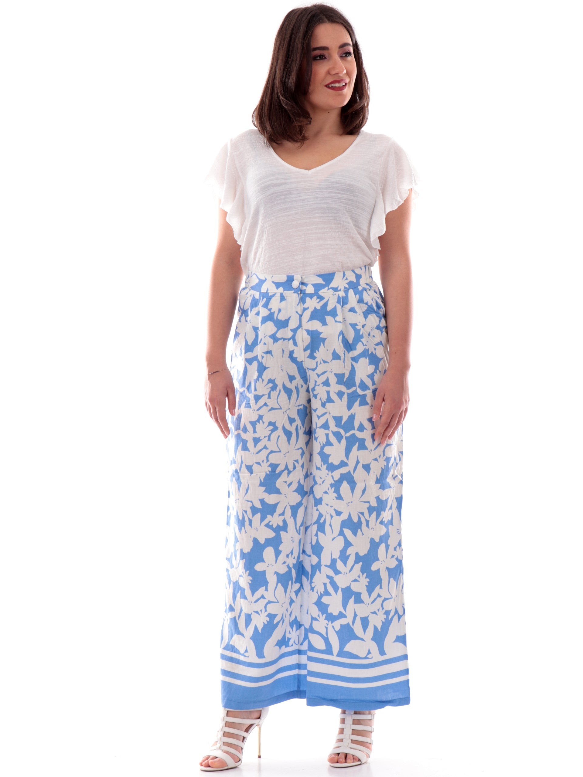 Pantaloni palazzo Molly Bracken blu da donna stampa floreale TL316DE, realizzati in viscosa. Questi pantaloni Molly blu hanno la chiusura con bottone più zip, la banda elastica sul lato posteriore, due tasche laterali aperte con taglio obliquo e la stampa floreale all over.