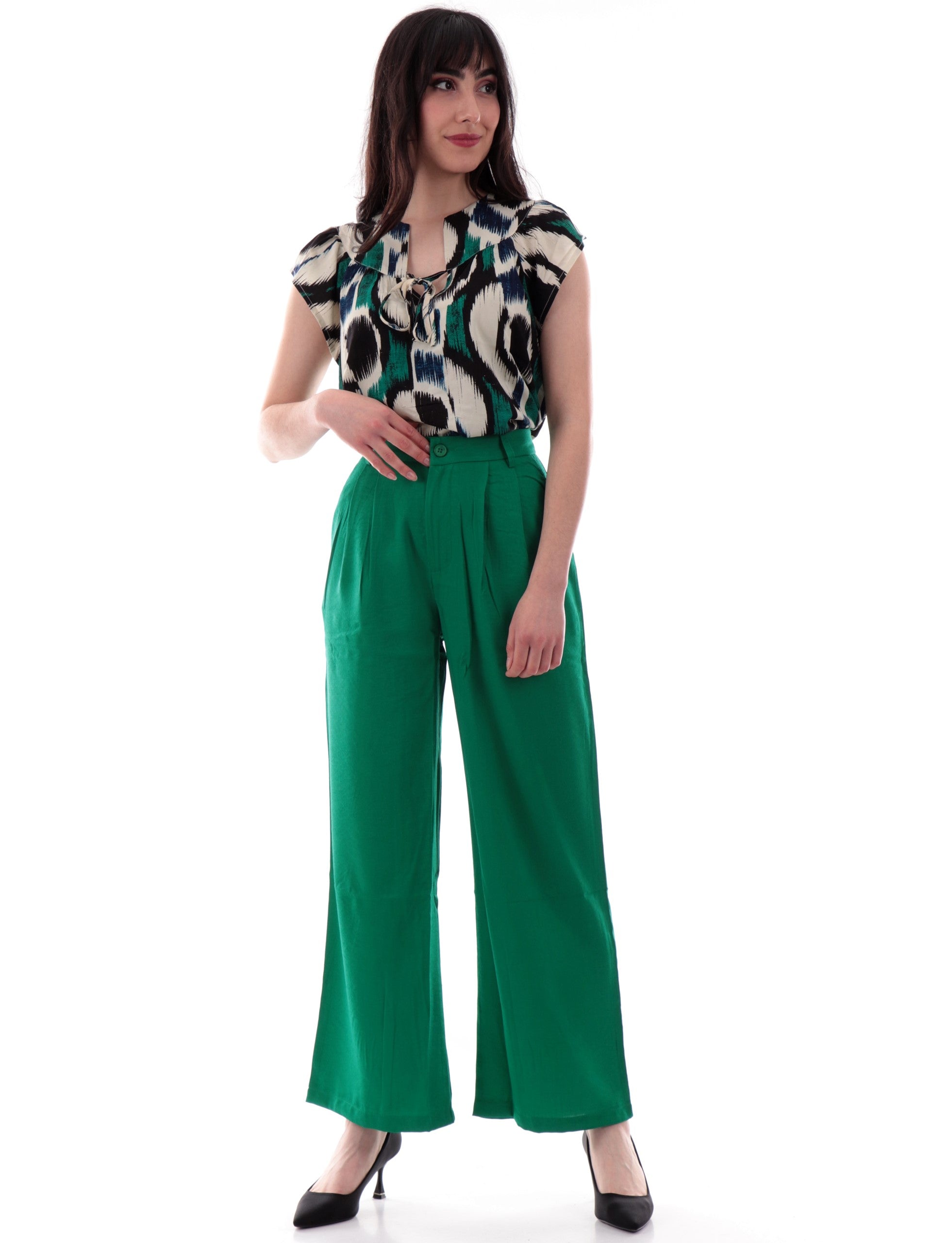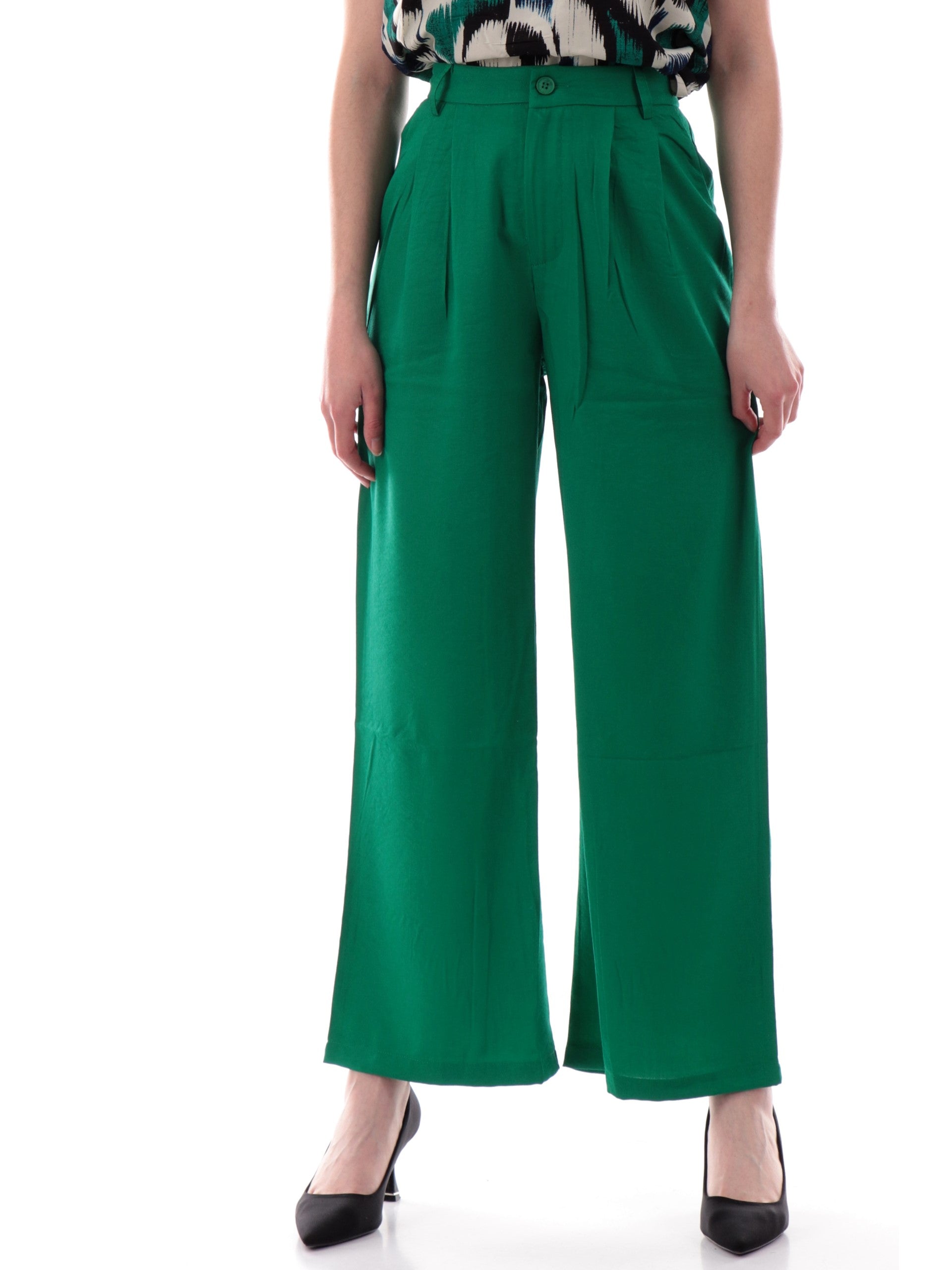 Pantaloni palazzo Molly Bracken verdi da donna Woven LA1695DE, realizzati in viscosa. Questi pantaloni Molly verdi hanno la chiusura con bottone più zip, due tasche laterali aperte con taglio obliquo, una tasca posteriore a filo e la vestibilità morbida.