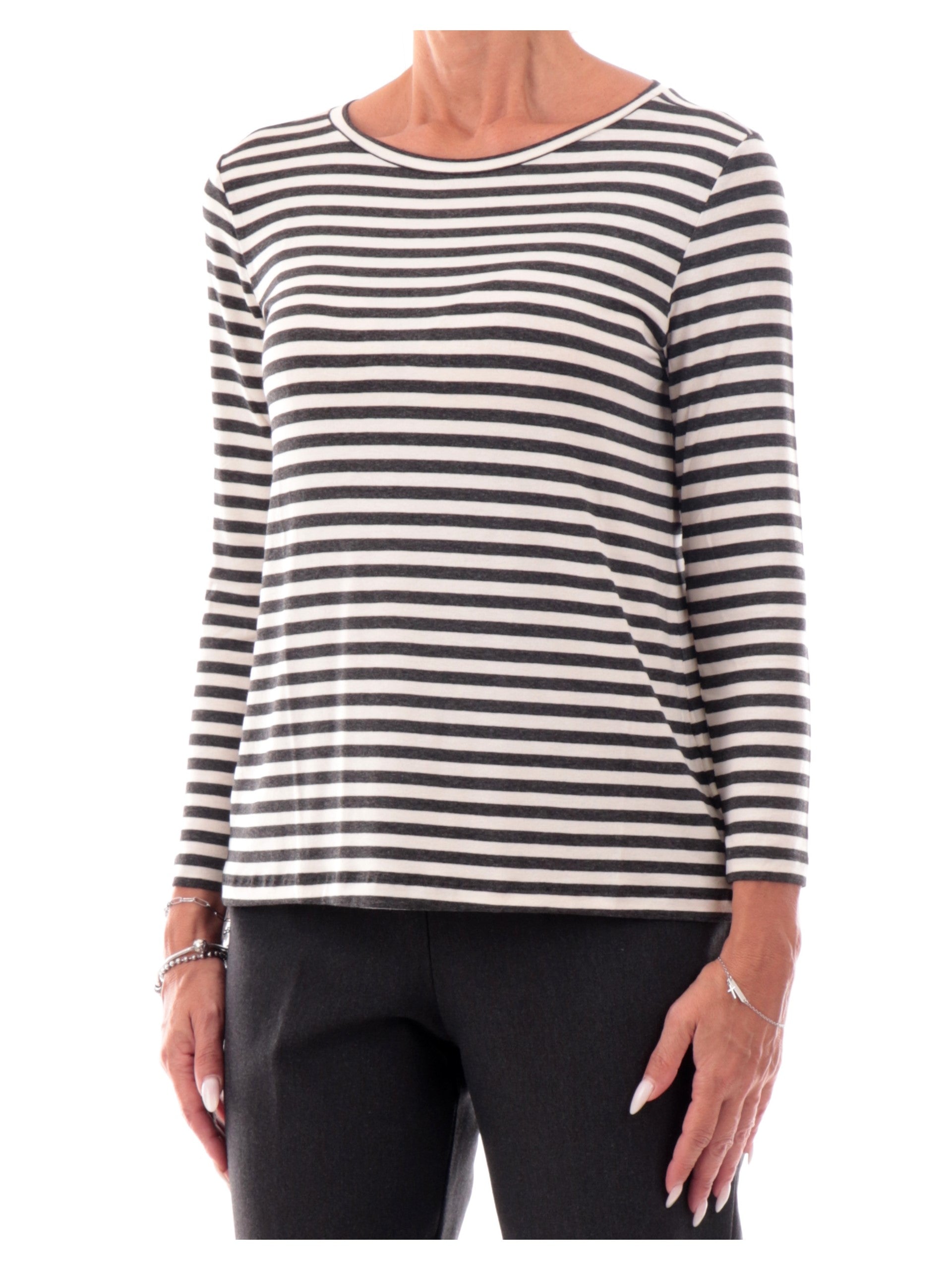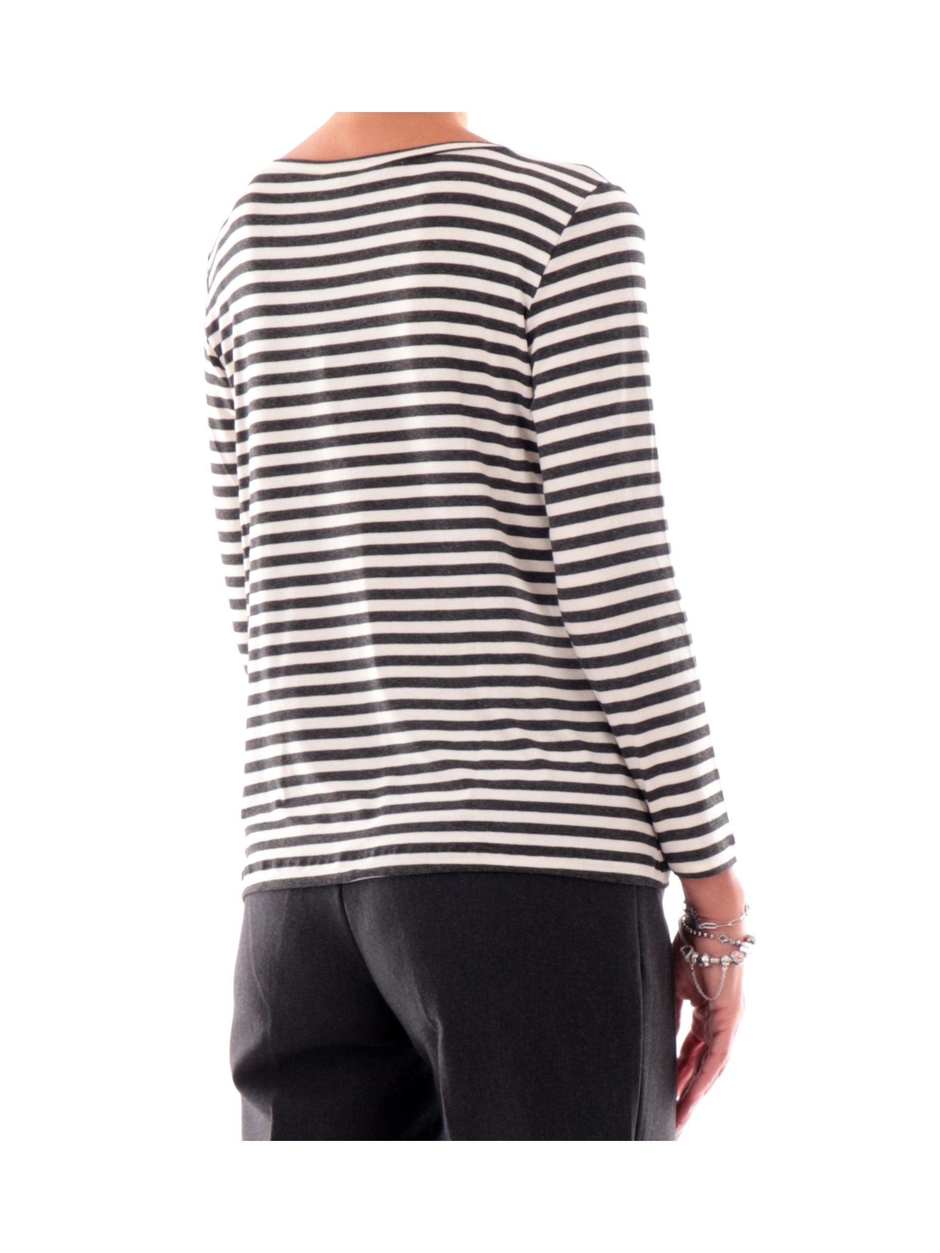 Maglia Emme Marella bianca a righe da donna girocollo POLPO, realizzata in viscosa. Questa t-shirt Marella bianca girocollo ha le maniche lunghe e la fantasia a righe.