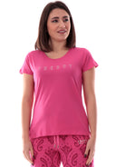 Maglia Freddy fucsia da donna logo Freddy con glitter S25WCYLT1, realizzata in 100% cotone. Questa t-shirt Freddy fuxia girocollo ha le maniche corte e il logo Freddy sul davanti con glitter.