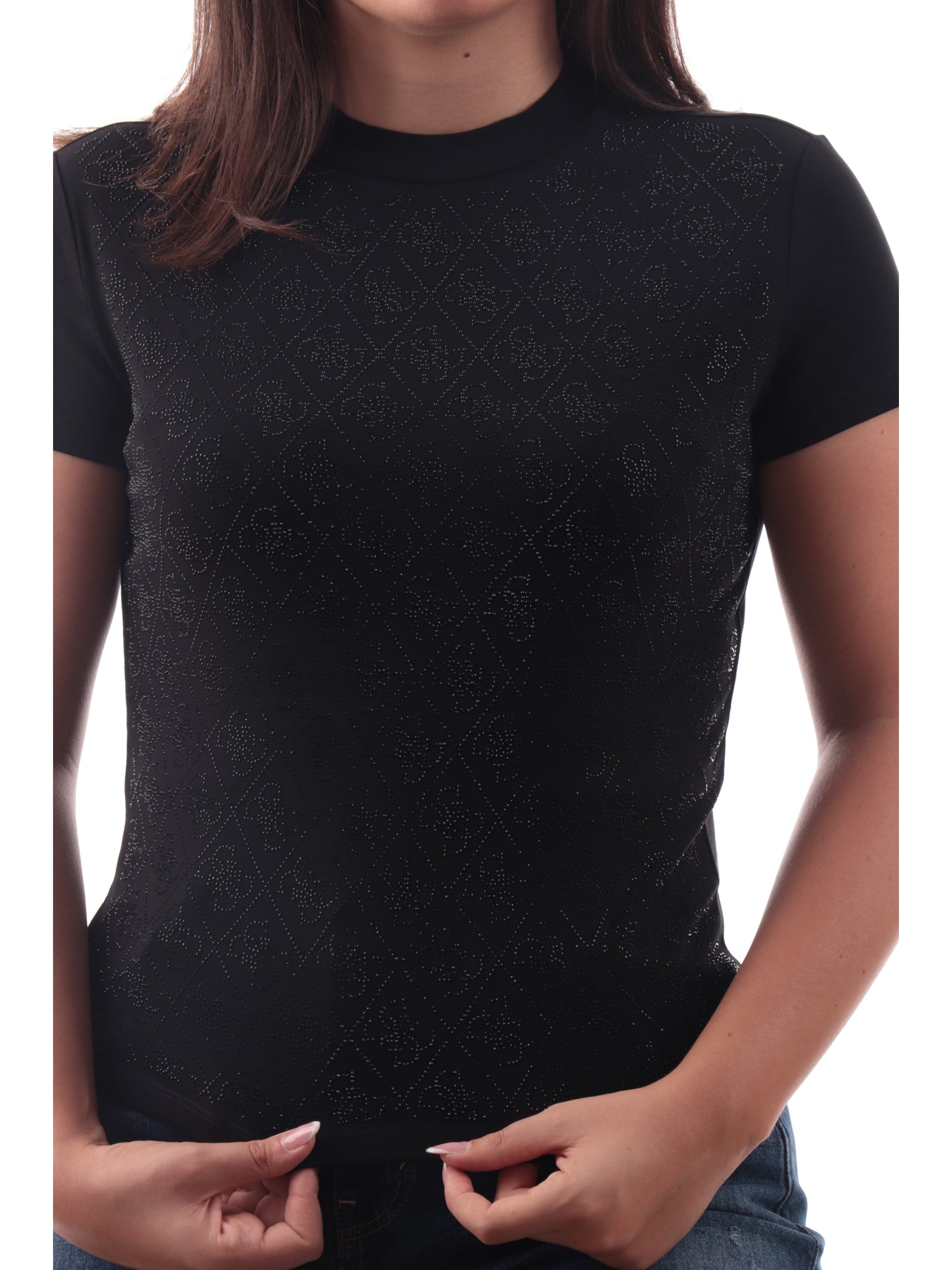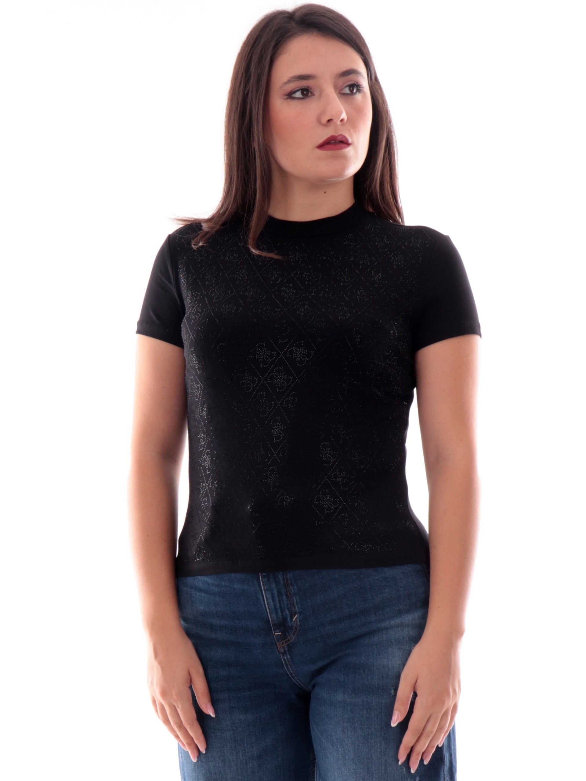 Maglia Guess nera girocollo da donna logo Guess all over con strass W4BI26J1314, realizzata in cotone. Questa t-shirt Guess nera girocollo ha le maniche corte, la vestibilità regular e le iconiche 4Gapplicate all over con strass.
