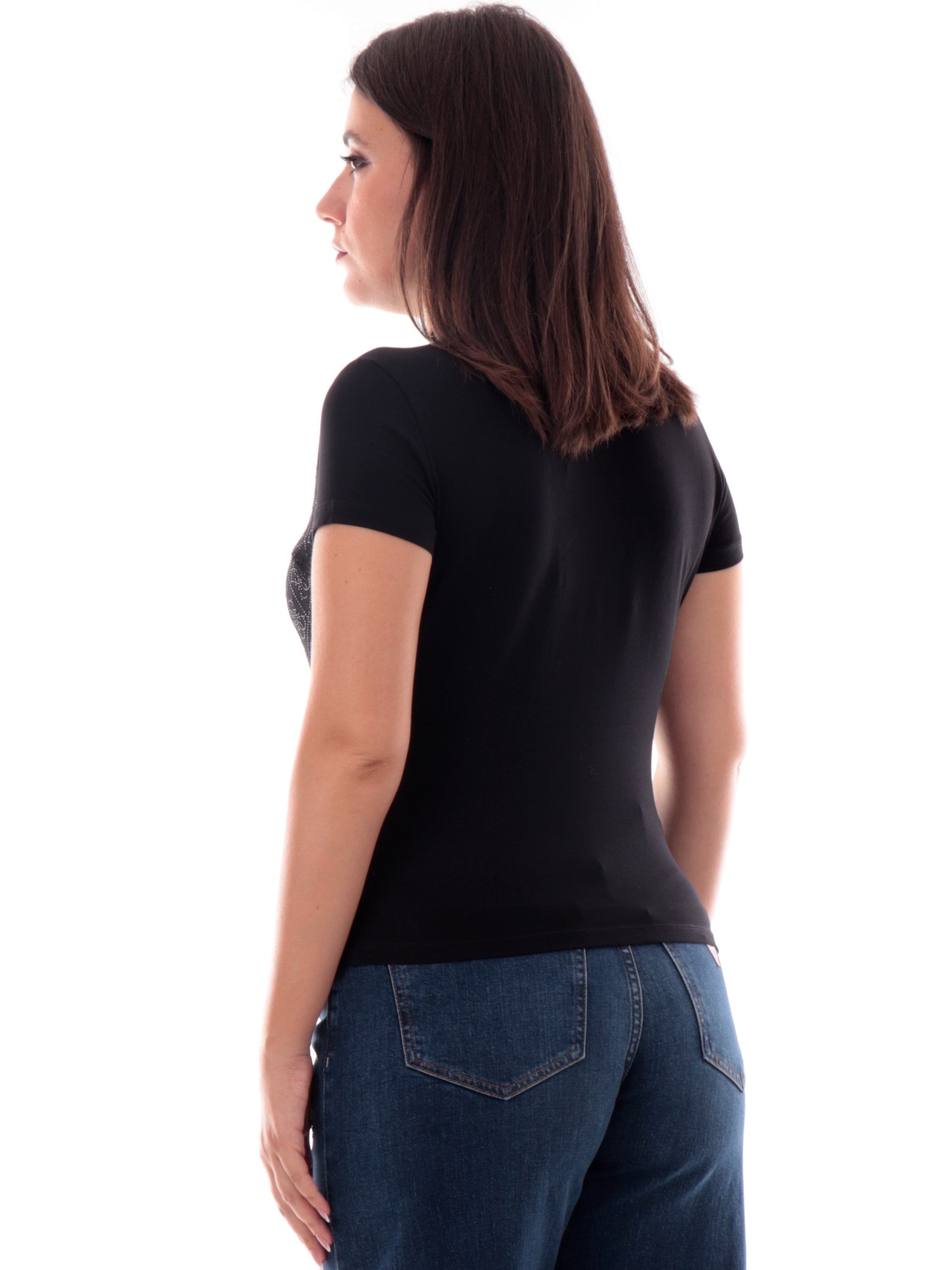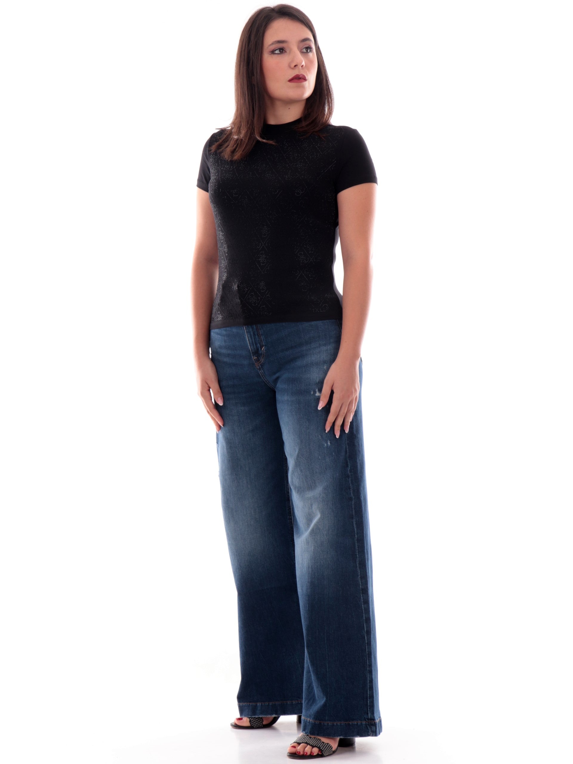 T-shirt Guess nera girocollo da donna logo Guess all over con strass W4BI26J1314