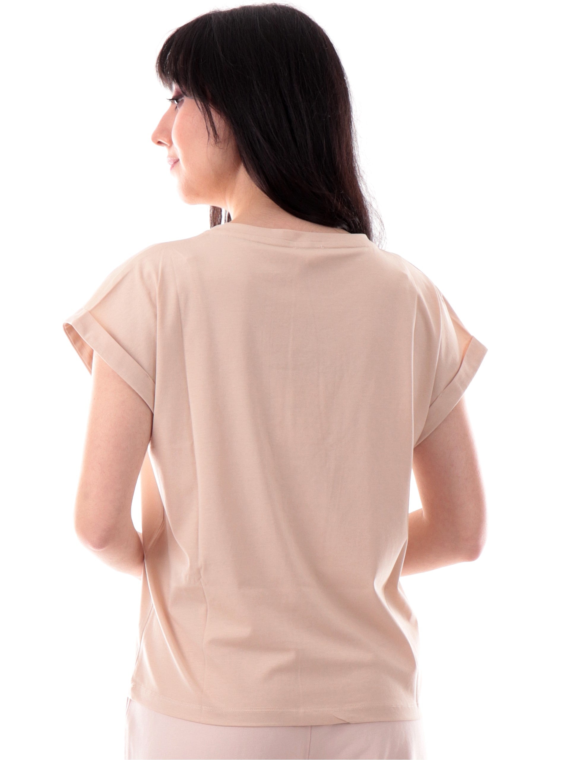 Maglia Liu Jo Beige maniche aletta da donna con patch gommato TA5181JS003 M918, realizzata in cotone. Questa t-shirt Liu Jo Beige girocollo ha le maniche ad aletta con risvolto e il patch Liu Jo gommato applicato sul davanti.