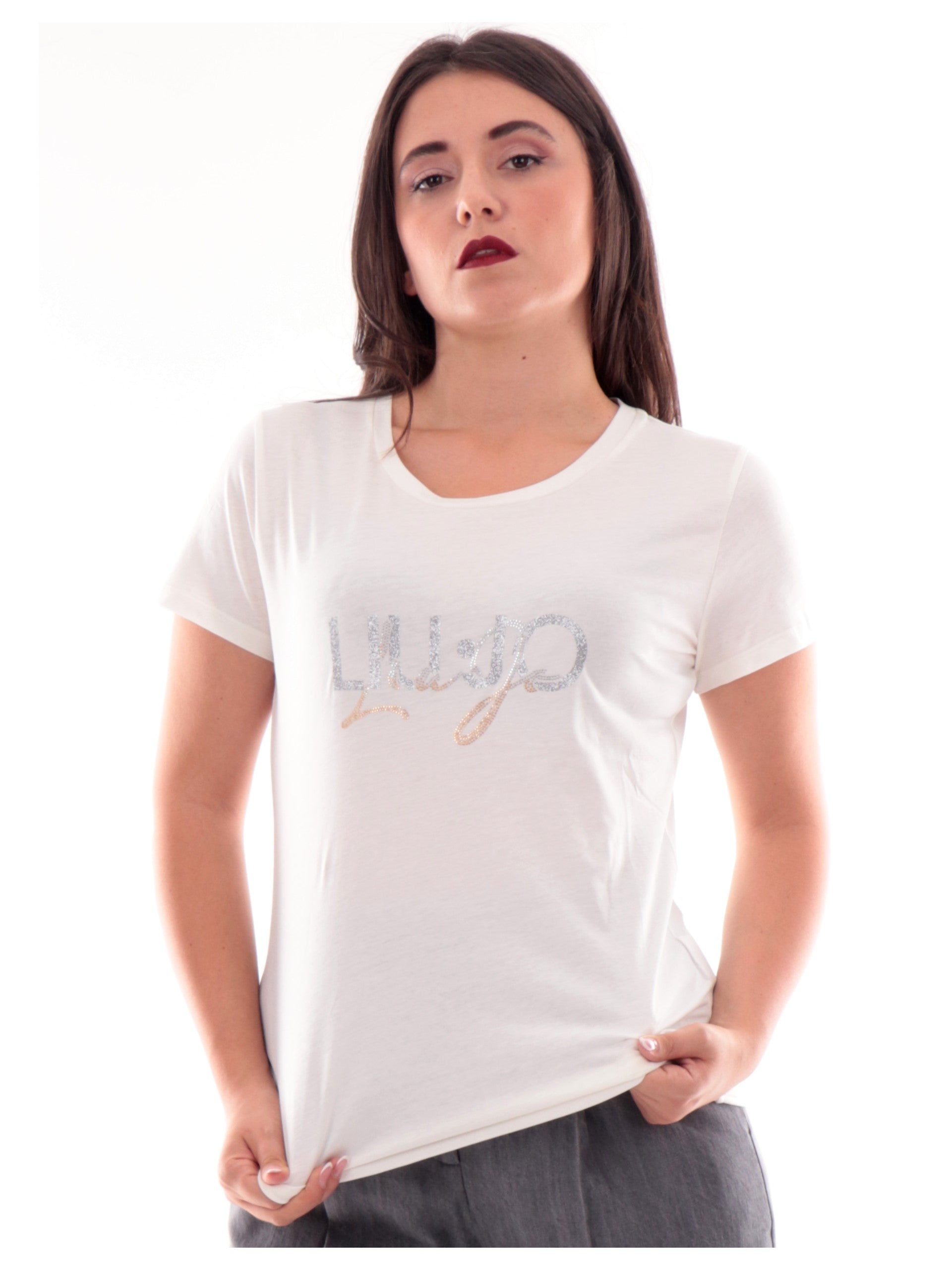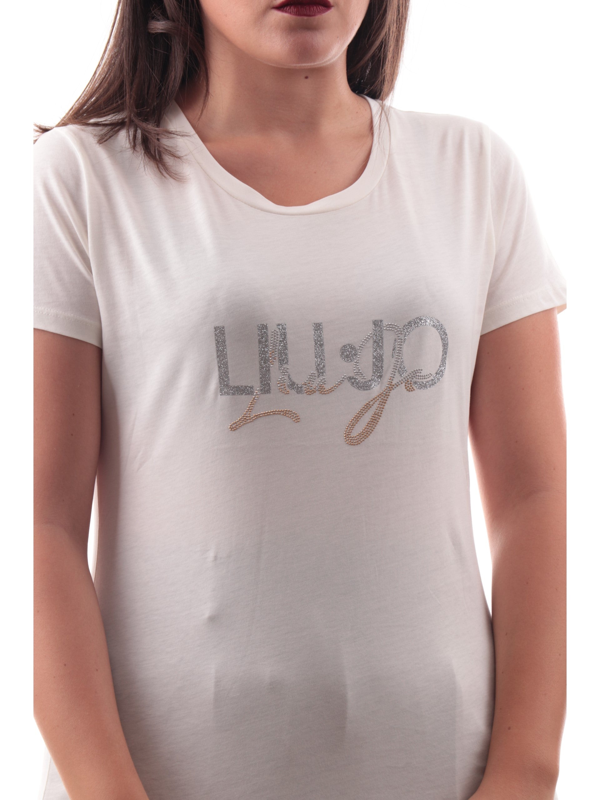 T-shirt Liu jo bianco avorio da donna realizzata in morbido cotone elasticizzato con logo glitter argentato e strass oro. Questa maglia Liu Jo donna è una basic tee perfetta da abbinare come vuoi.