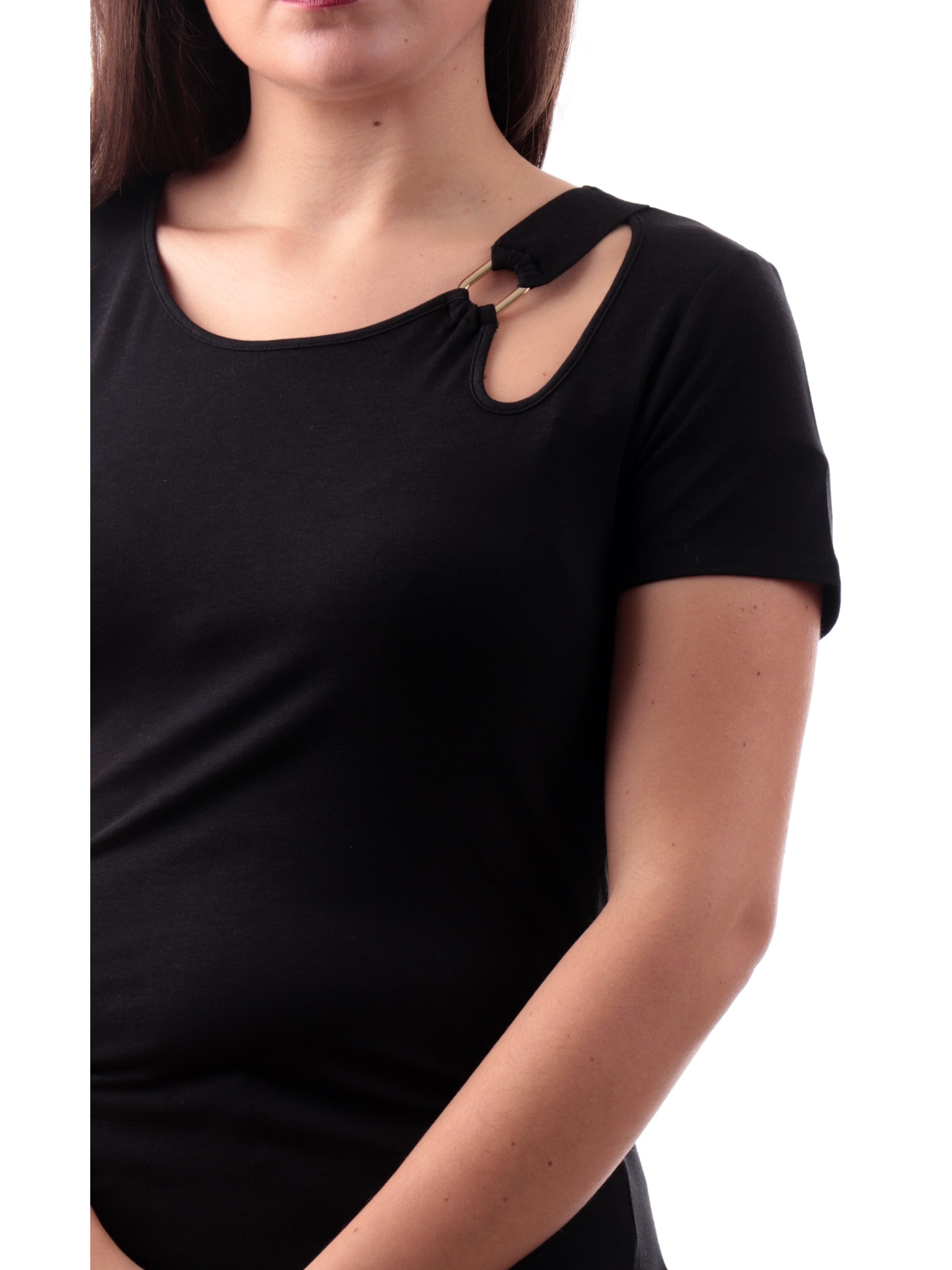 Maglia Liu Jo nera da donna girocollo con cut out . Questa maglia Liu Jo, realizzata in cotone, perfetta per la stagione primavera-estate, è caratterizzata dallo scollo a giro con cut-out, maniche corte e fondo regolare . Questa maglia è perfetta per un look casual e elegante