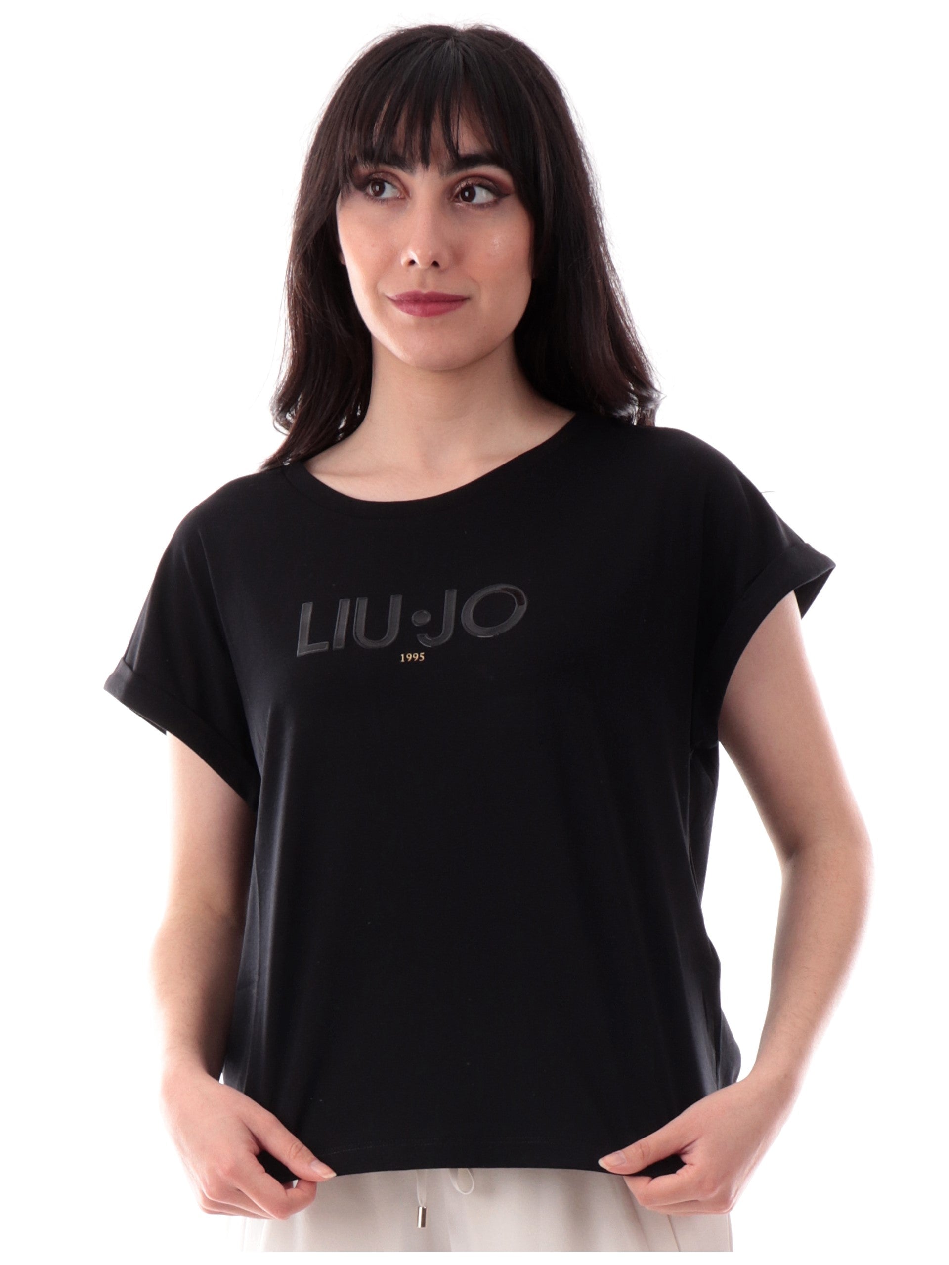 Maglia Liu Jo nera maniche aletta da donna con patch gommato TA5181JS003 W9415, realizzata in cotone. Questa t-shirt Liu Jo nera girocollo ha le maniche ad aletta con risvolto e il patch Liu Jo gommato applicato sul davanti.