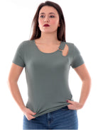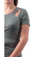 Maglia Liu Jo verde da donna girocollo con cut out . Questa maglia Liu Jo, realizzata in cotone, perfetta per la stagione primavera-estate, è caratterizzata dallo scollo a giro con cut-out, maniche corte e fondo regolare . Questa maglia è perfetta per un look casual e elegante