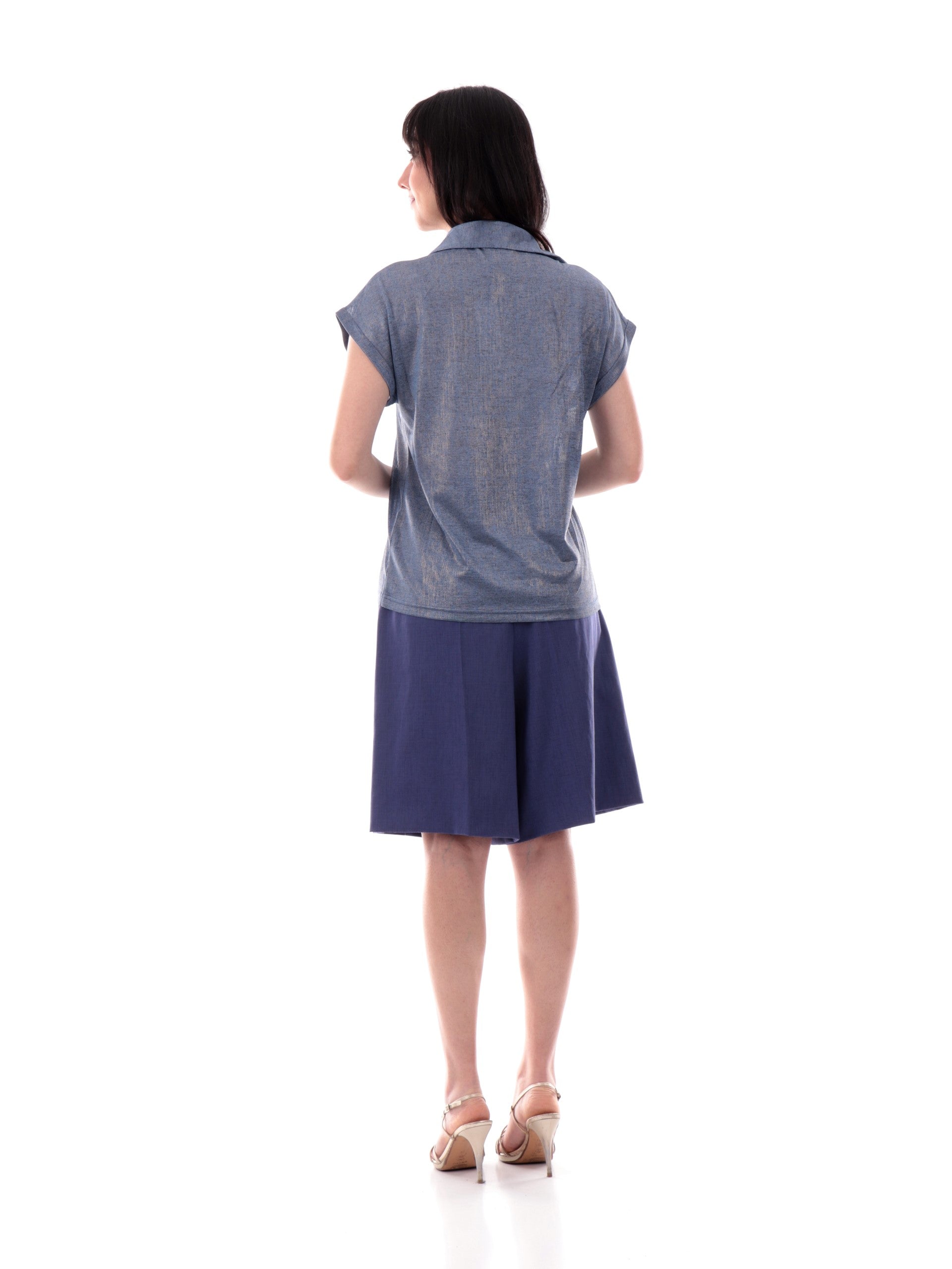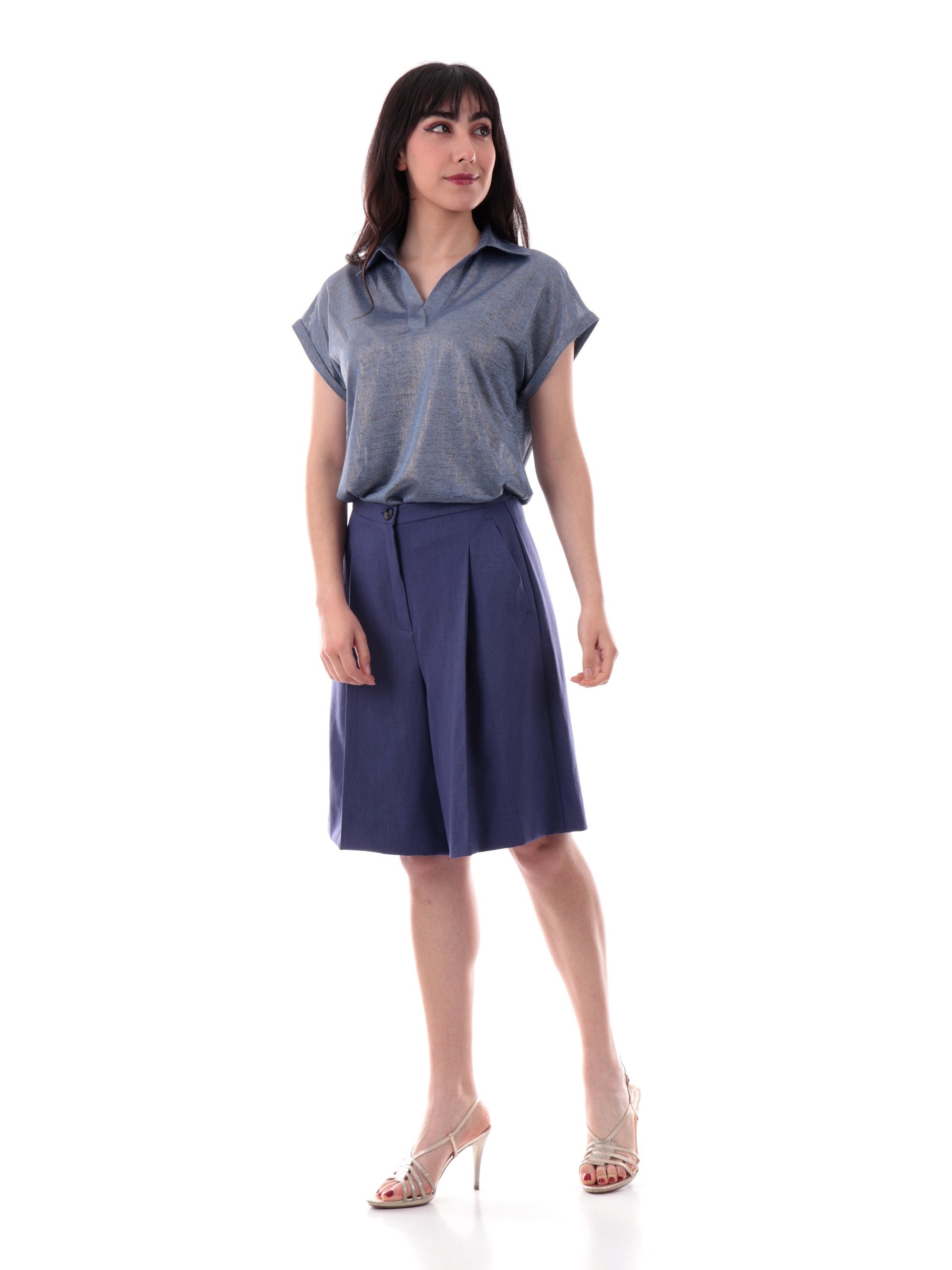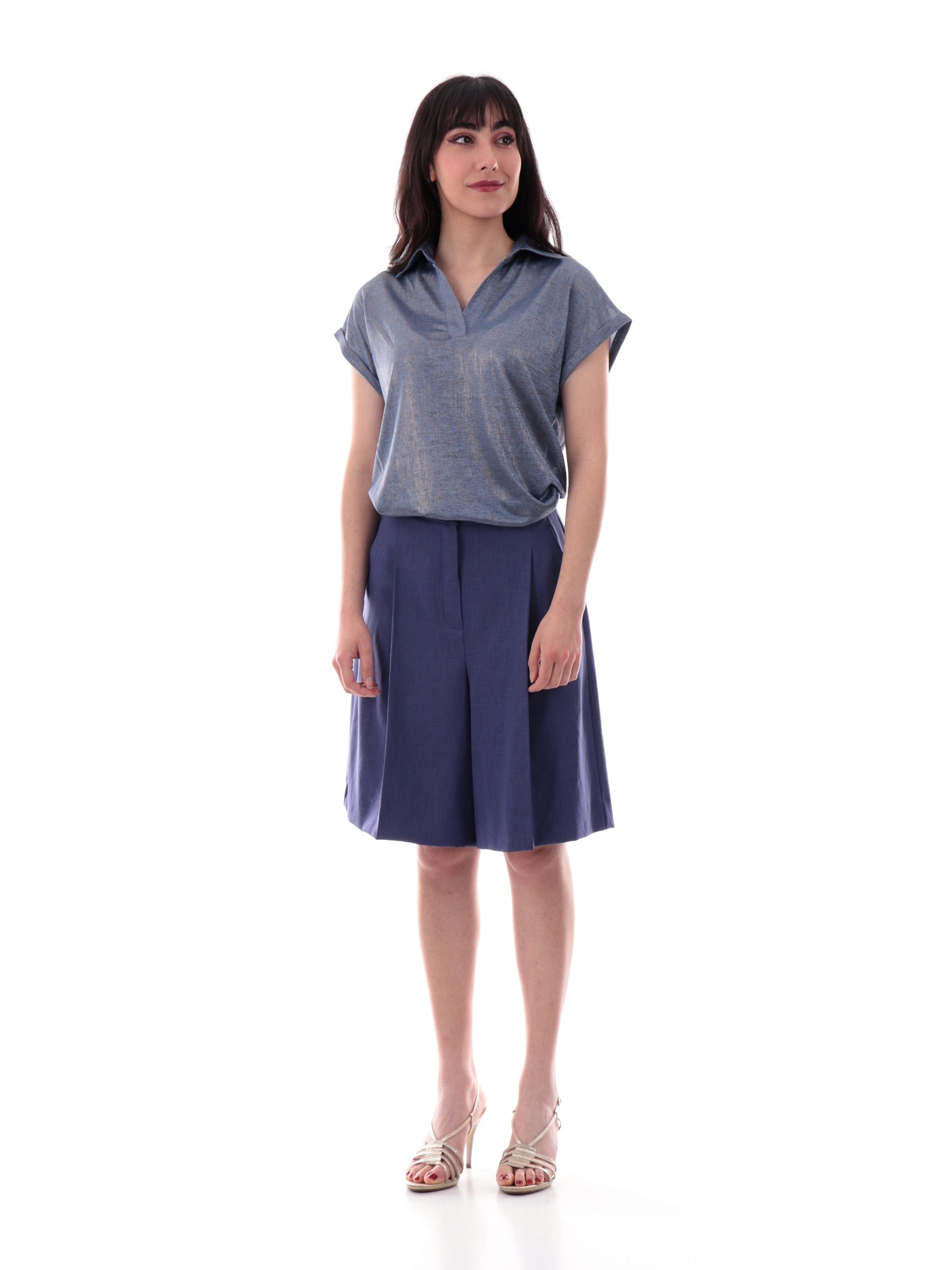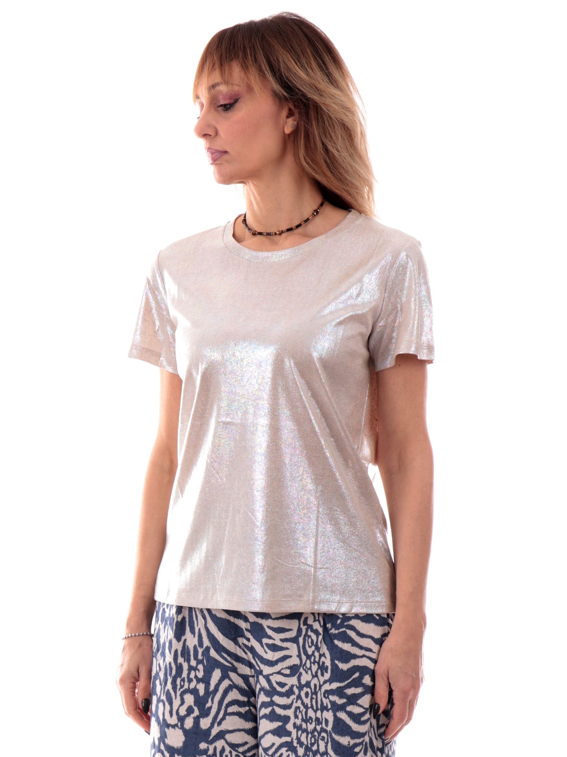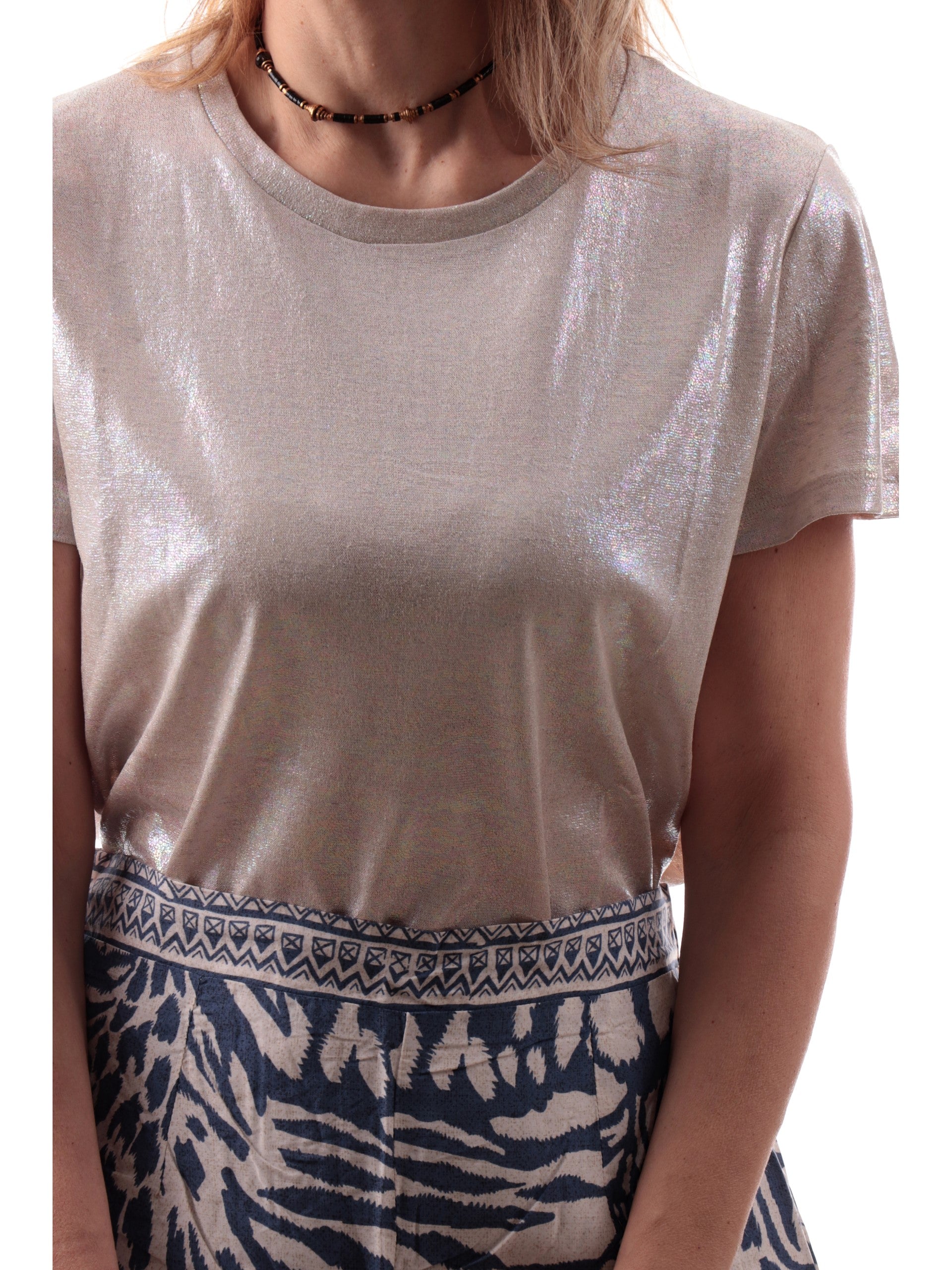 Maglia Molly Bracken beige con colletto da donna realizzata in morbido tessuto lurex cangiante. Questa maglia polo donna beige è caratterizzata da tessuto con fili oro che gli donano un fascino elegante e ricercato.
