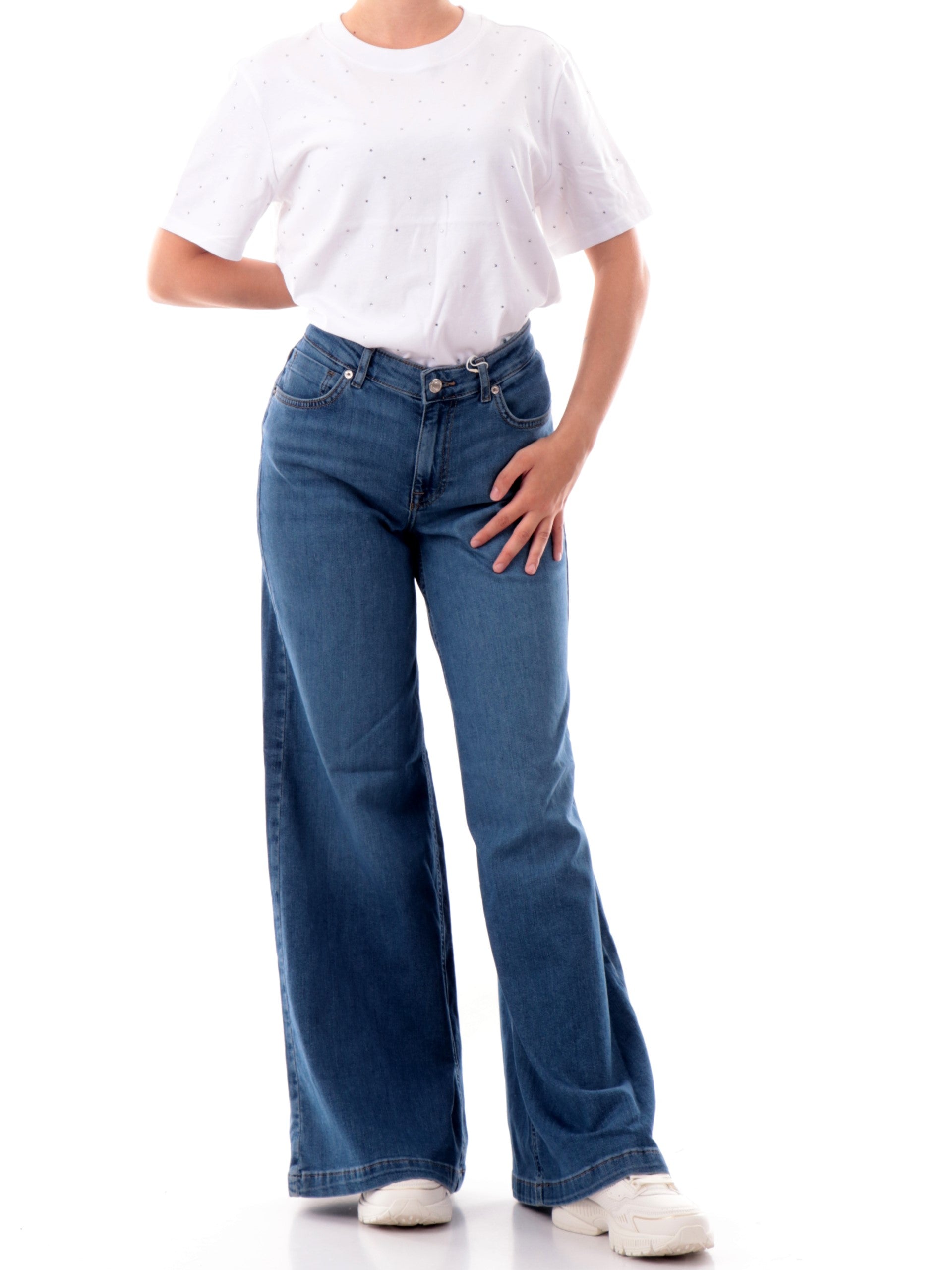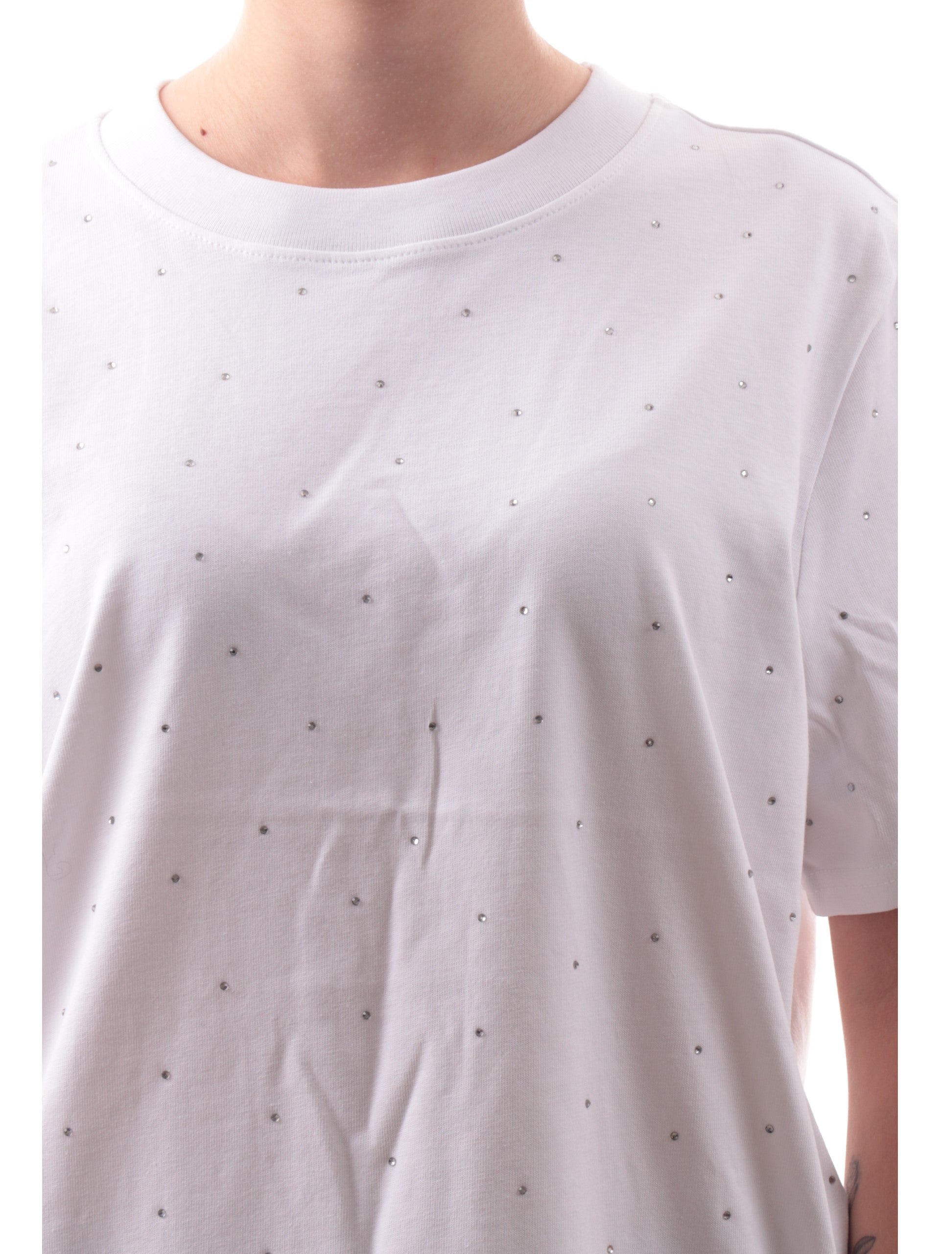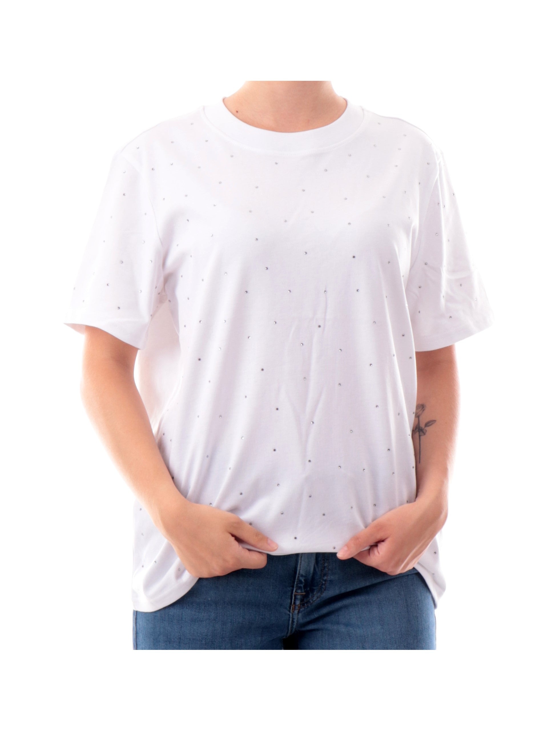Maglia Only bianca da donna girocollo con strass 15340939, realizzata in 100% puro cotone. Questa t-shirt Only girocollo ha le maniche corte e strass decorativi all over.