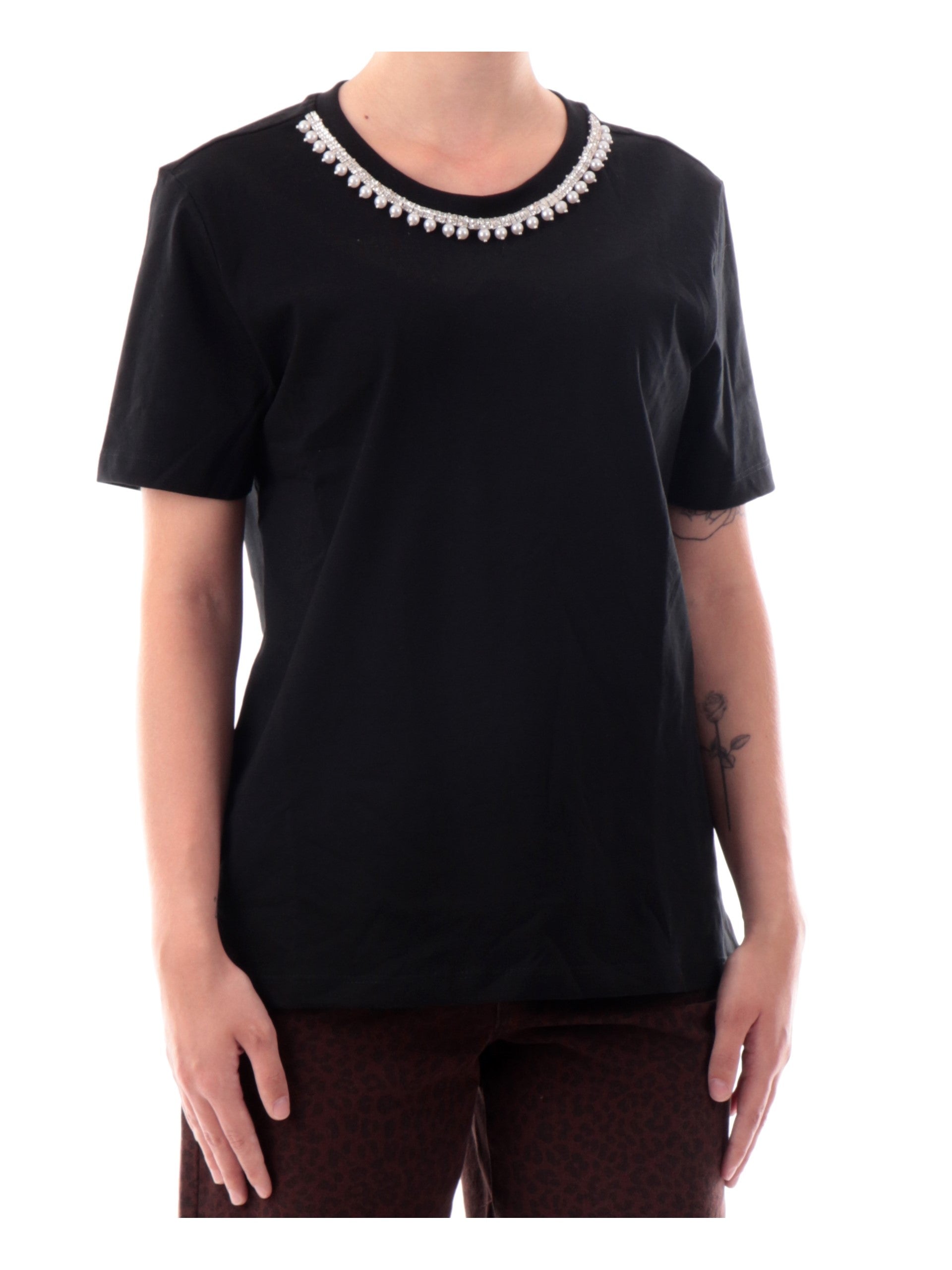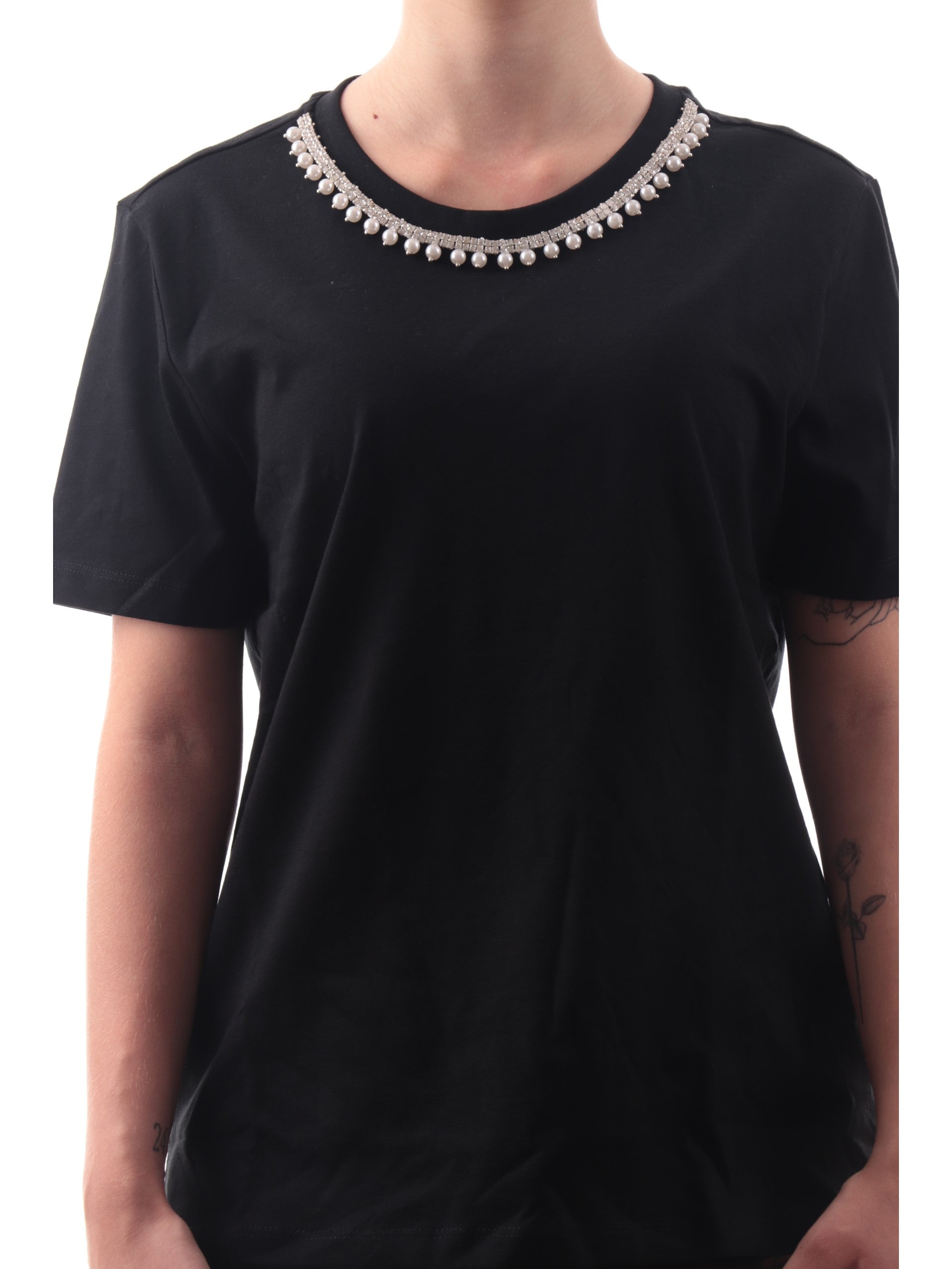 Maglia Only nera da donna con perle 15356167, realizzata in 100% puro cotone. Questa t-shirt Only nera girocollo ha le maniche corte e le perle sul colletto.