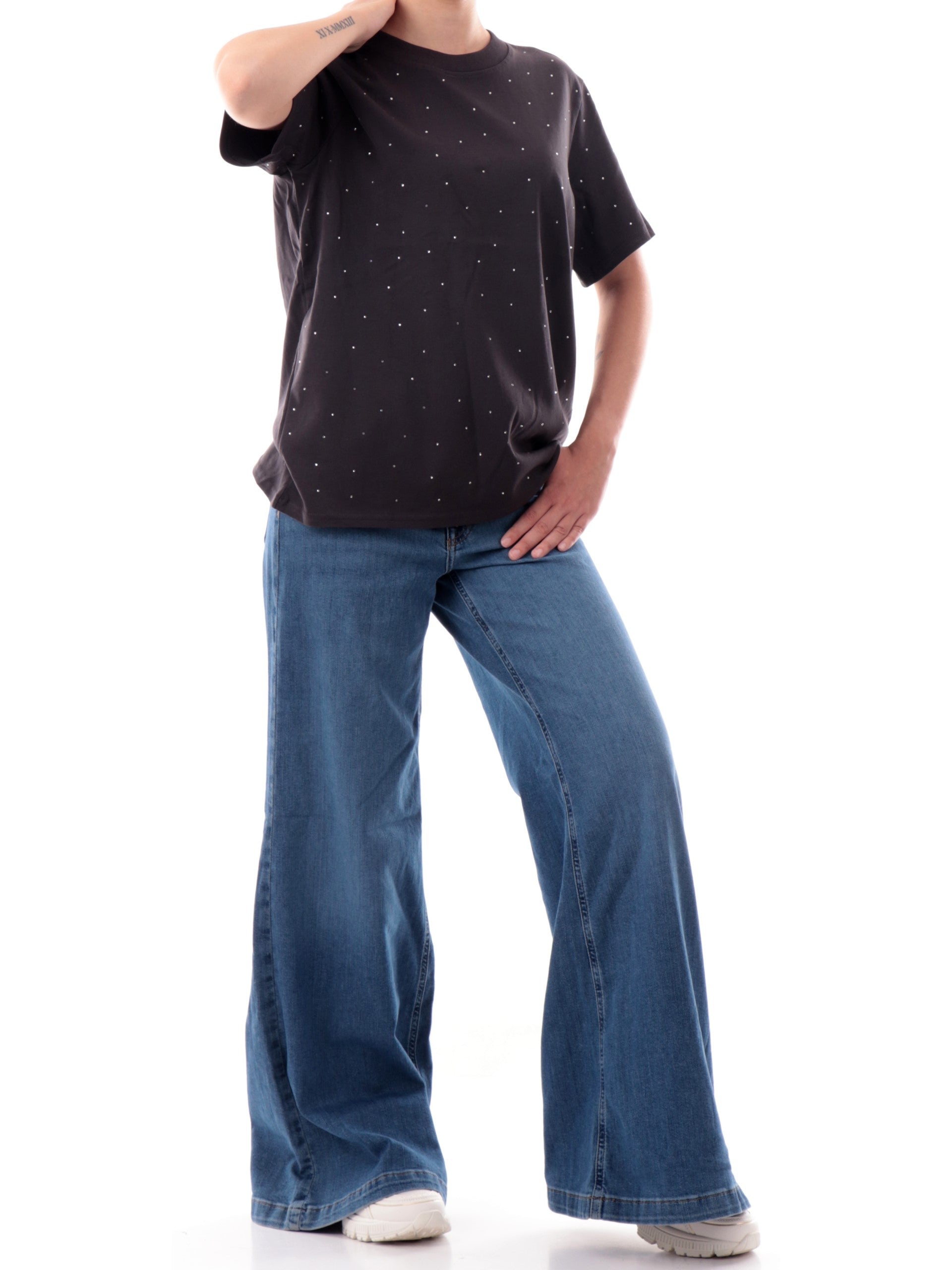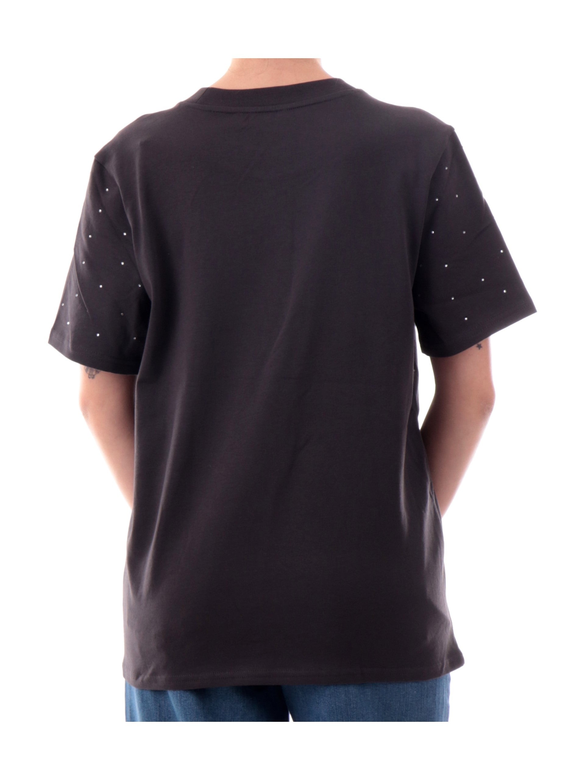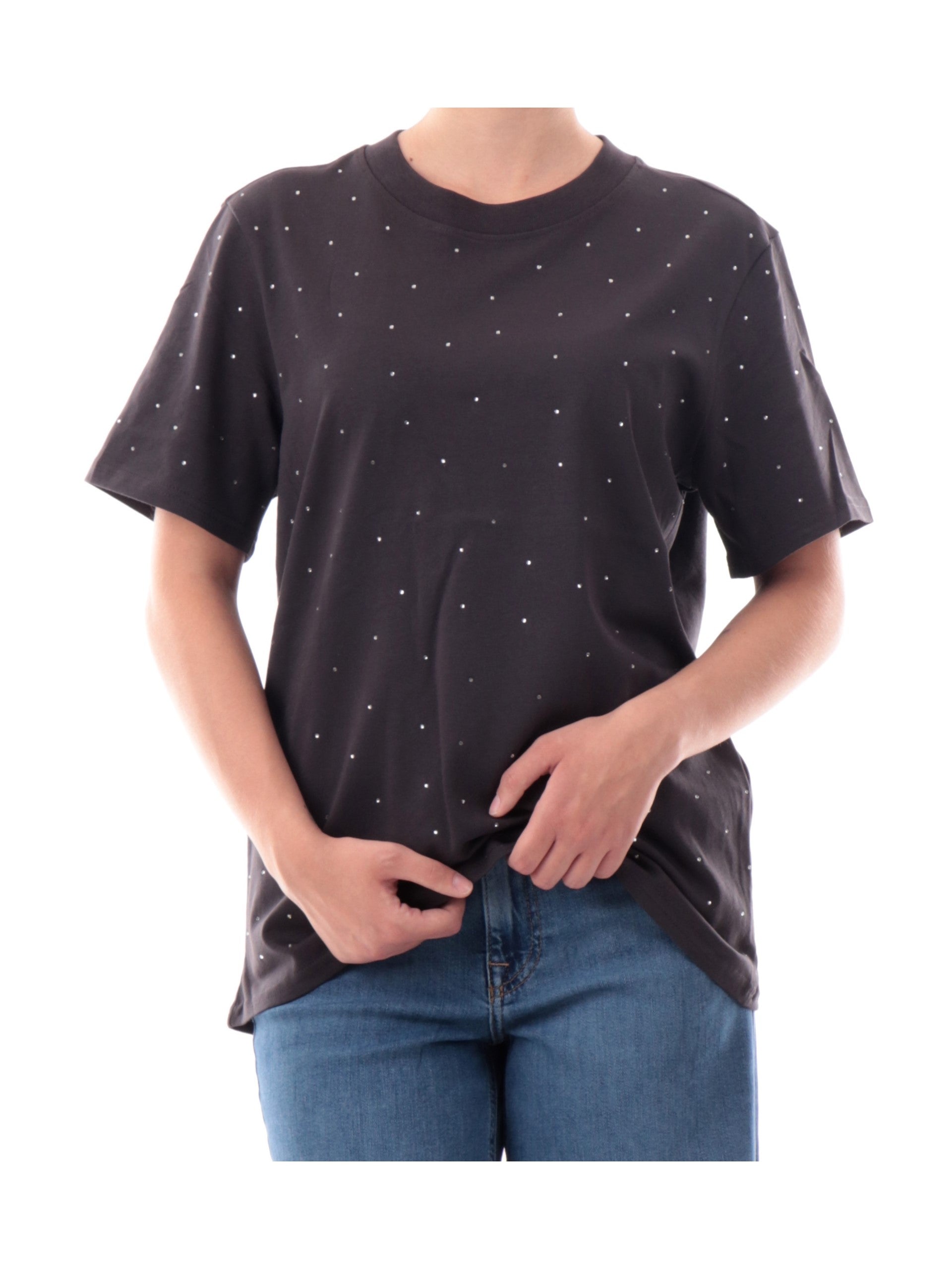 Maglia Only nera da donna girocollo con strass 15340939, realizzata in 100% puro cotone. Questa t-shirt Only nera girocollo ha le maniche corte e strass decorativi all over.
