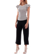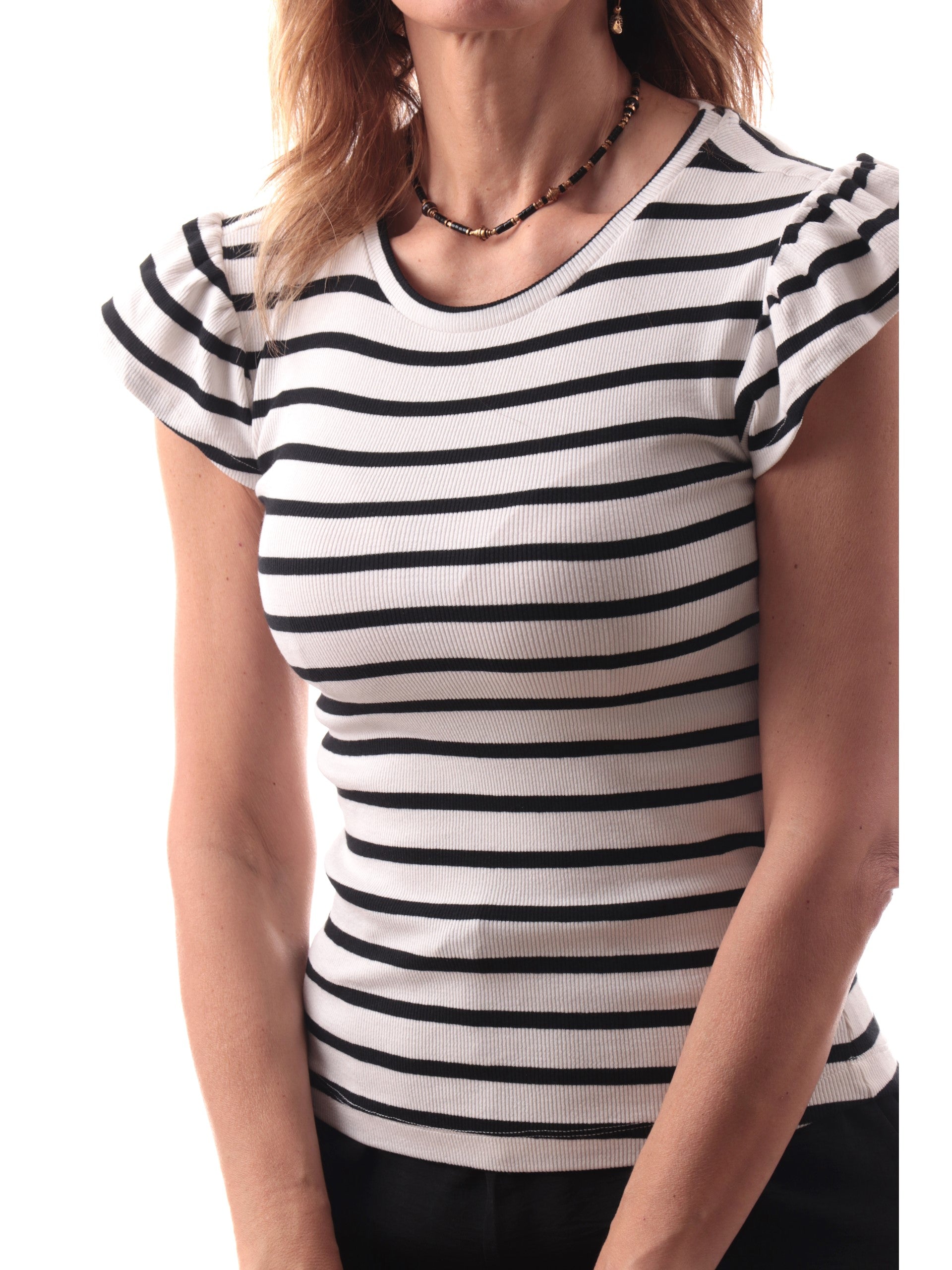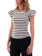 Maglia Tiffosi bianca a righe da donna con maniche a farfalla GAVI 1 10059267, realizzata in tessuto a costine. Questa t-shirt donna Tiffosi girocollo ha le maniche a farfalle e la fantasia a righe all over.