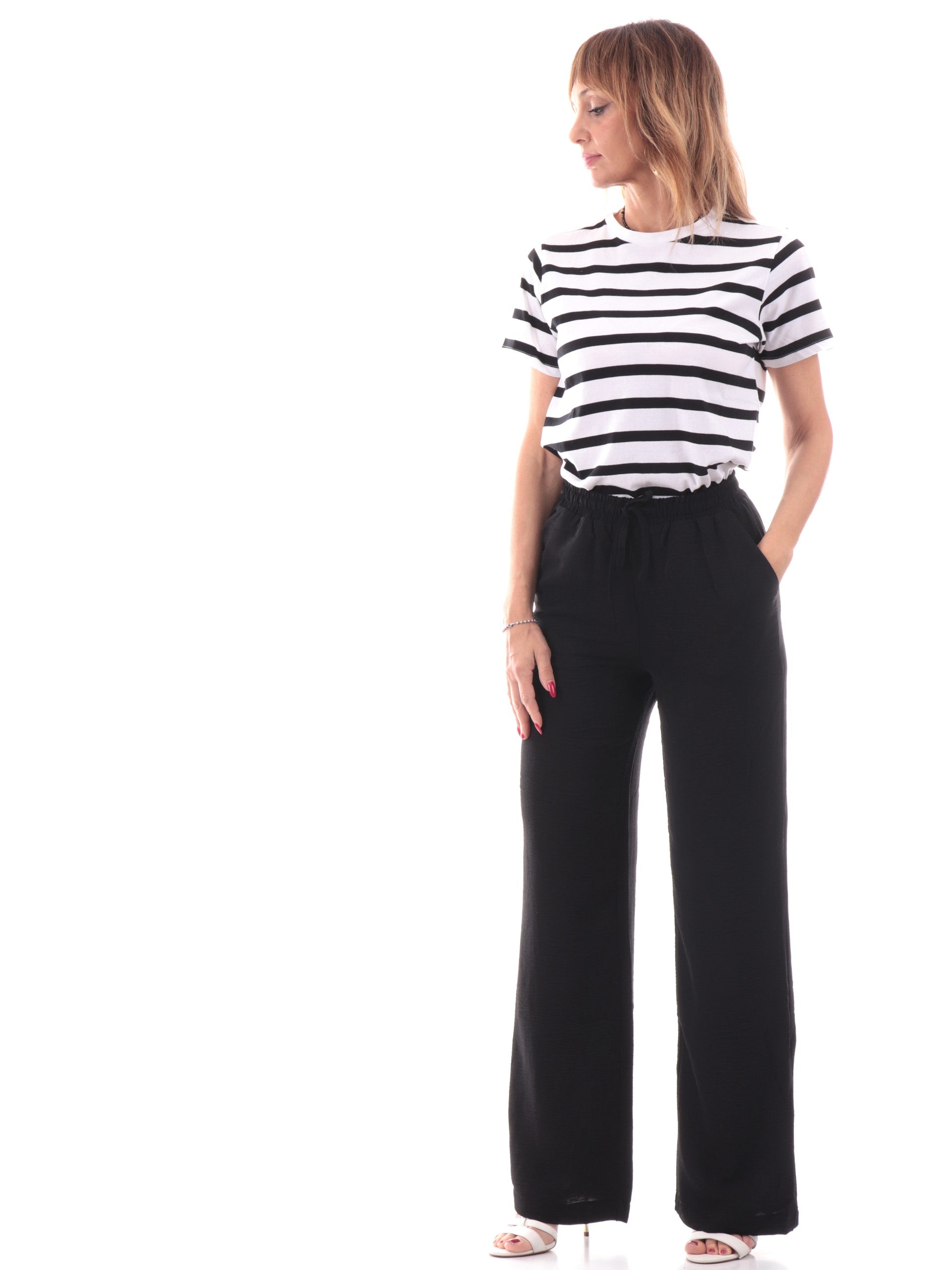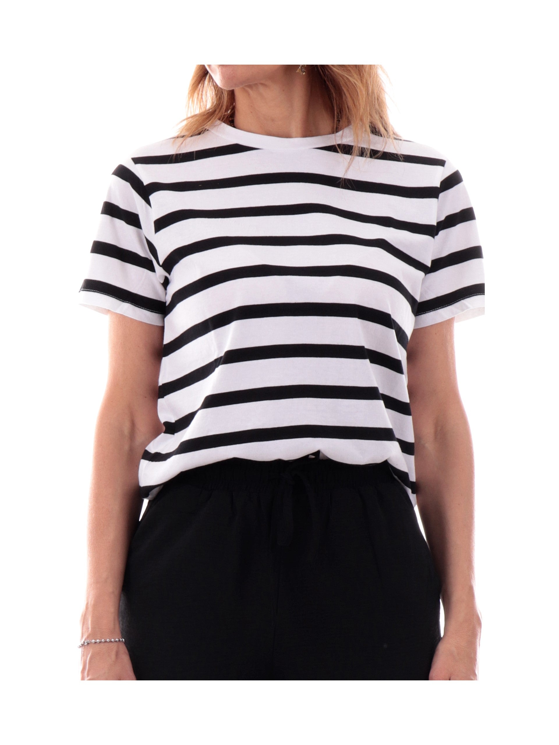 Maglia Tiffosi bianca a righe da donna girocollo POOL 10059231, realizzata in 100% puro cotone. Questa t-shirt Tiffosi girocollo ha le maniche corte e la fantasia a righe all over.