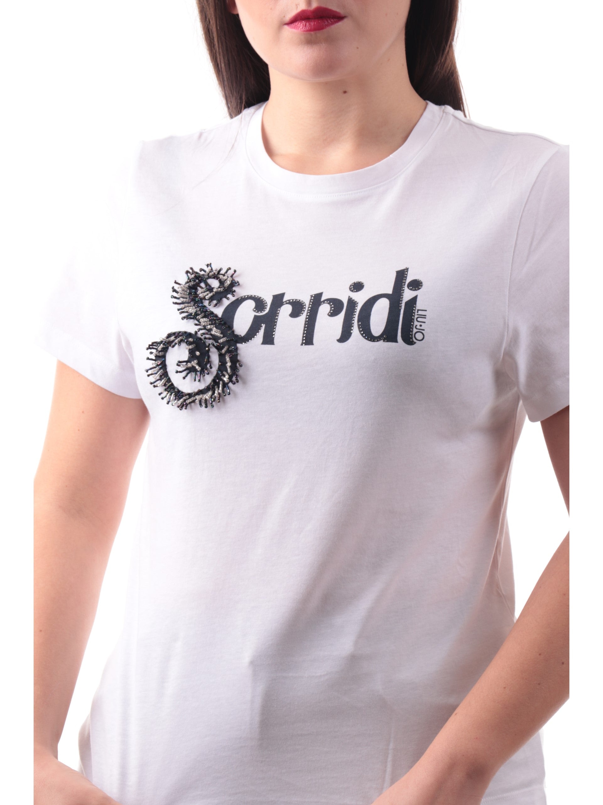 T-shirt Liu Jo bianca da donna con scritta Sorridi con strass e decorazioni WA6431JS904P932