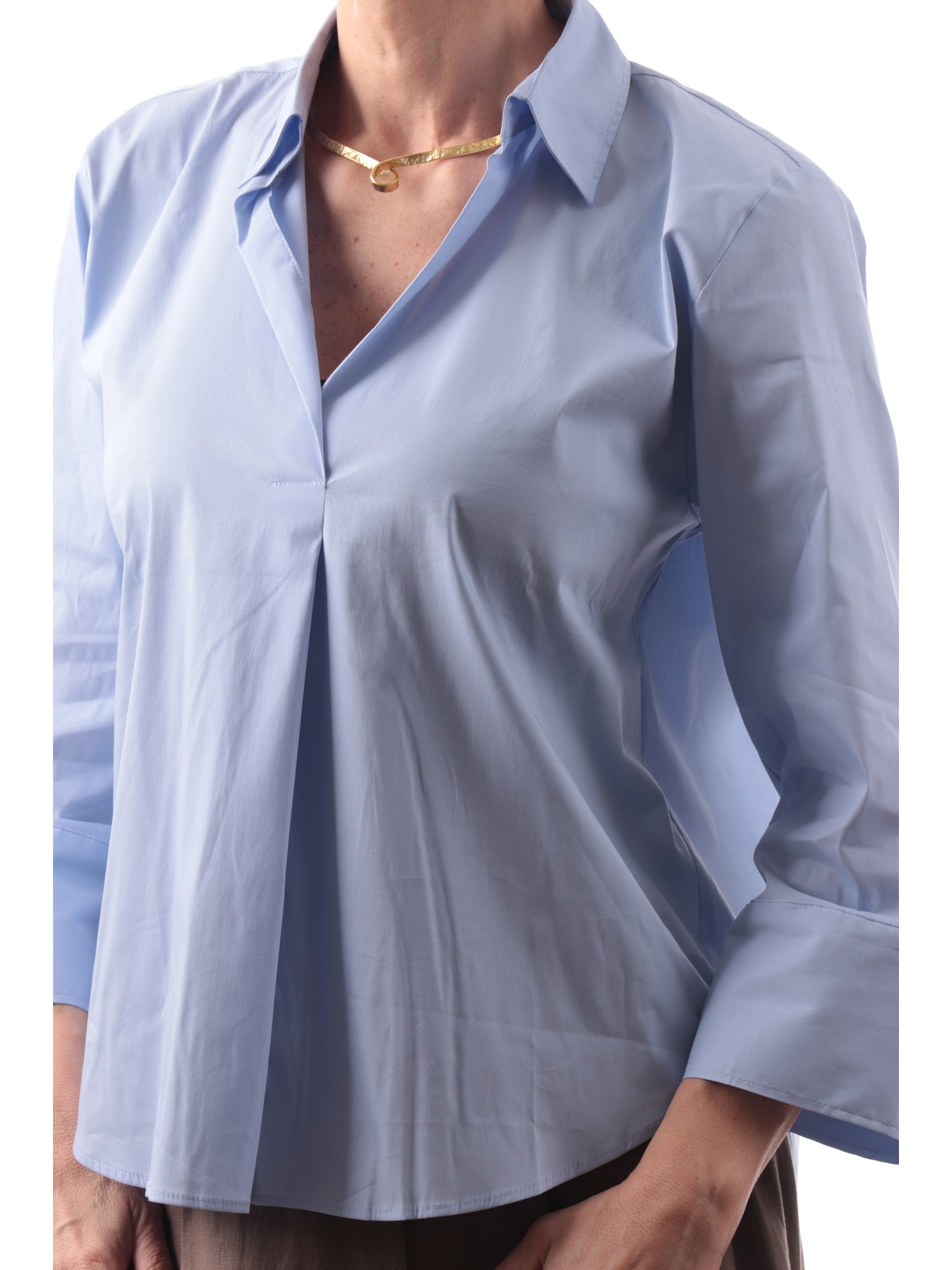 Camicia chiusa Emme Marella da donna con scollo a V. Questa blusa da donna, realizzata in cotone, morbido e avvolgente, è caratterizzata dal colletto a polo, scollo a V, maniche lunghe con polsini larghi e fit regolare. Perfetto da abbinare a jeans a vita alta, per look femminili e contemporanei. Ideale per le uscite casual e per i tuoi outfit quotidiani.