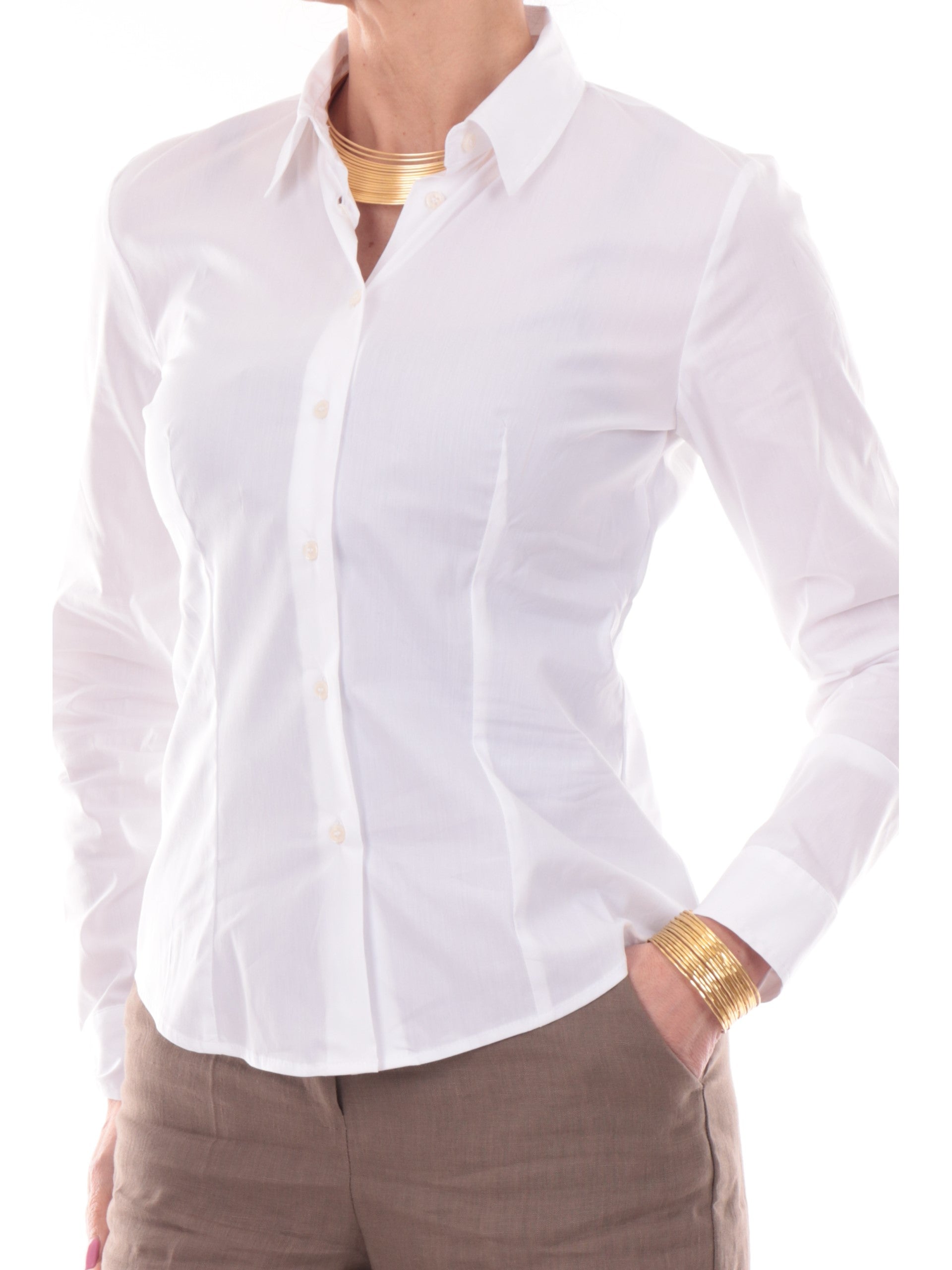 Camicia da donna Emme Marella bianca. Questa camicia avvitata da donna, realizzata da un tessuto morbido e avvolgente, è caratterizzata dal classico colletto, chiusura con bottoni, maniche lunghe e fit slim. Perfetto da abbinare a jeans a vita alta, per look femminili e contemporanei. Ideale per le uscite casual e per i tuoi outfit quotidiani.