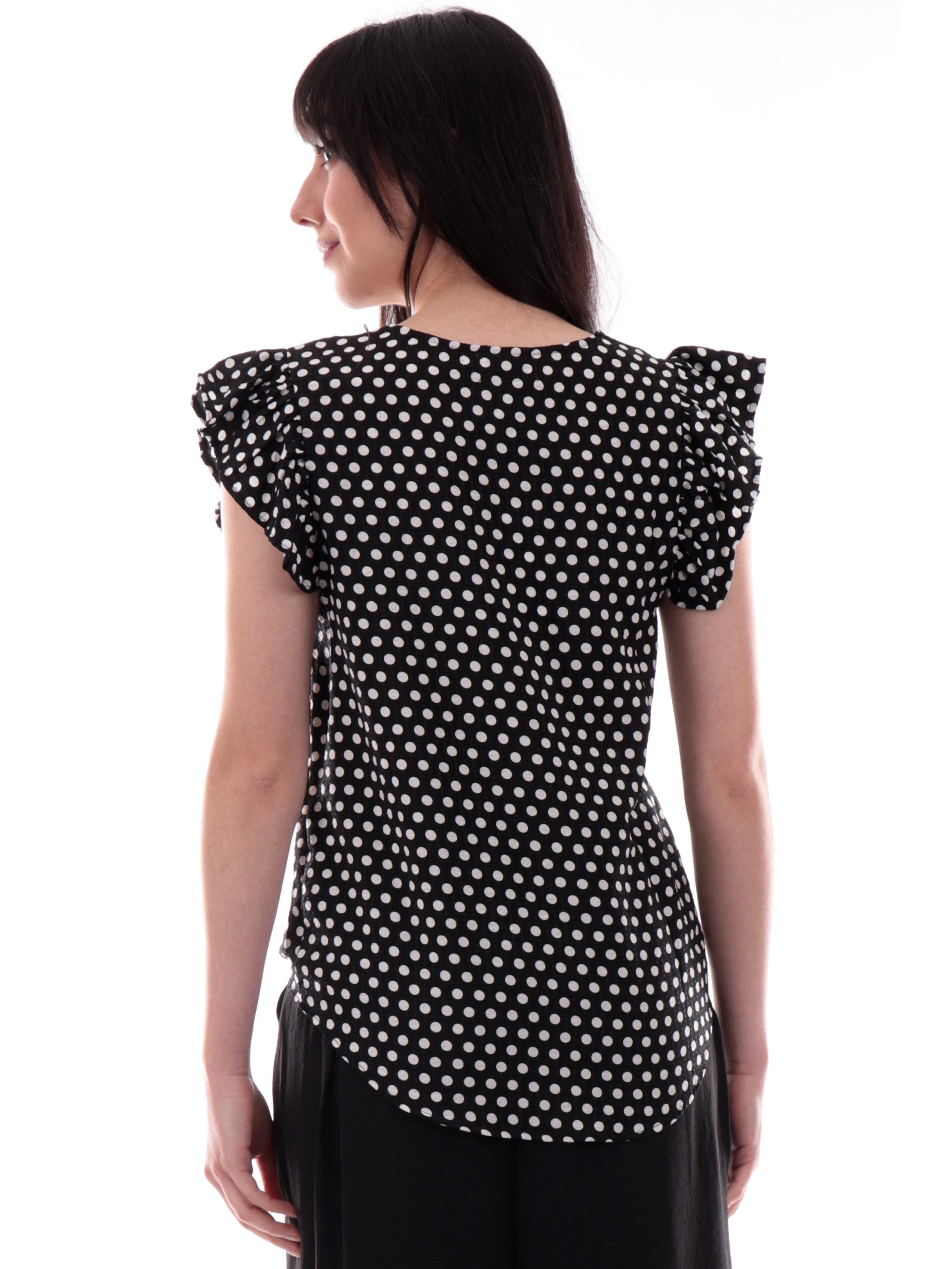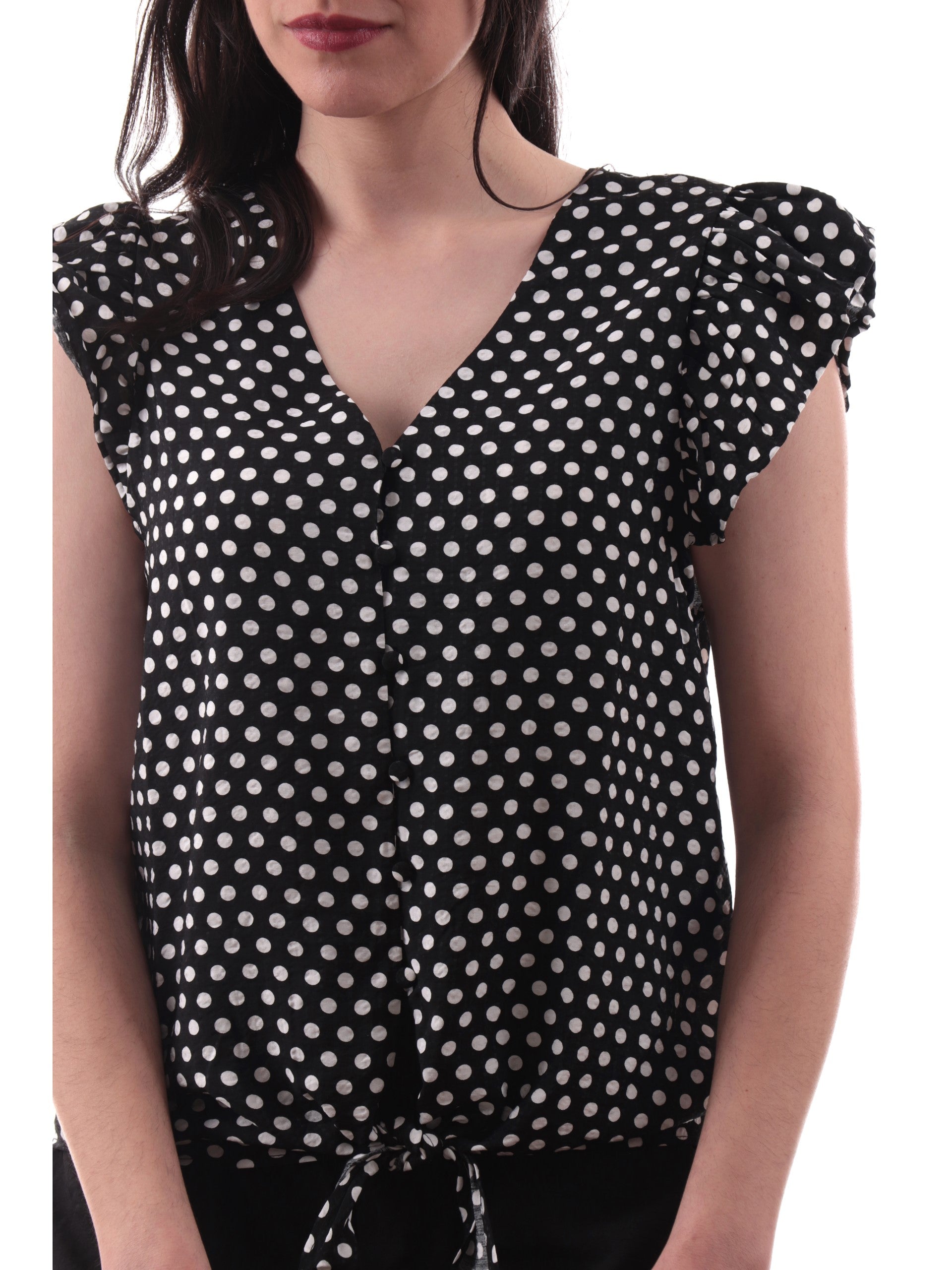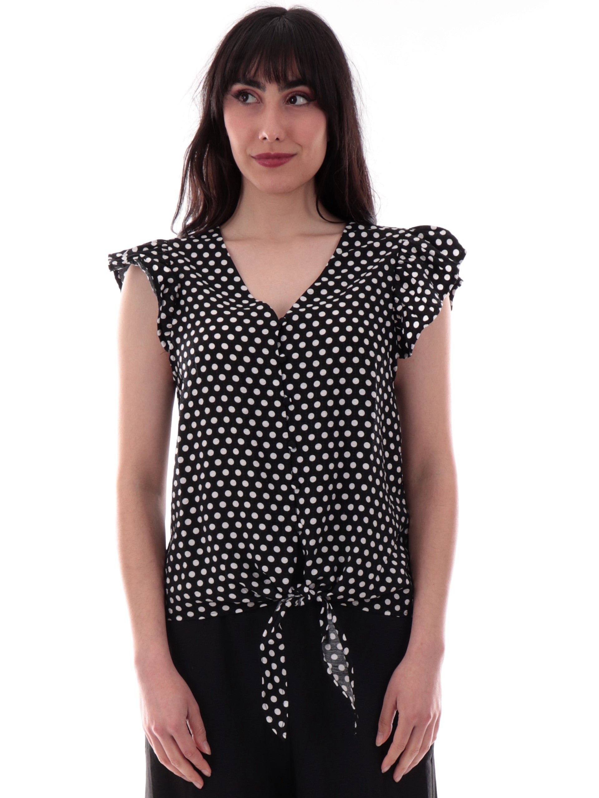 Maglia Molly Bracken da donna realizzata in tessuto a fantasia Pois all over . Blusa pois con scollo a v, è caratterizzata da maniche voilant, che donano un tocco glamour al capo. Versatile e facile da abbinare, questa maglietta Molly Bracken è perfetta con i pantaloni e gli short della nuova Collezione Donna Primavera-Estate.