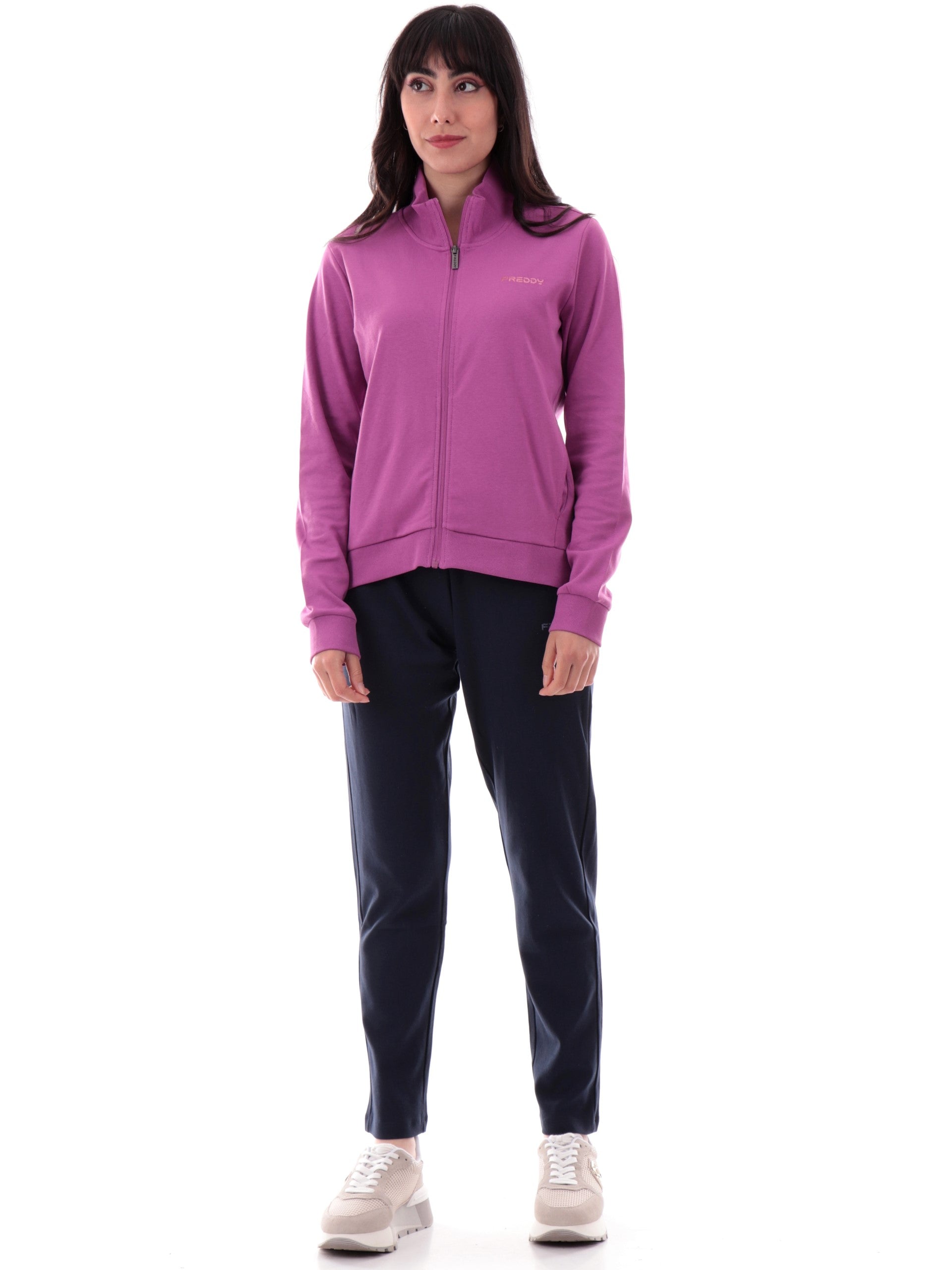 Tuta Freddy fucsia e nera da donna full zip logo Freddy con glitter S25WTRK2. La felpa di questa tuta completa Freddy ha il collo alto, la chiusura full zip centrale, due tasche laterali aperte, logoFreddy con glitter lato cuore, polsini e fondo elasticizzati. I pantaloni di questa tuta Freddy hanno la banda elastica sul punto vita hanno la banda elastica sul punto vita regolabile con laccetti, due tasche laterali aperte e logo Freddy applicato sul lato sinistro con glitter.