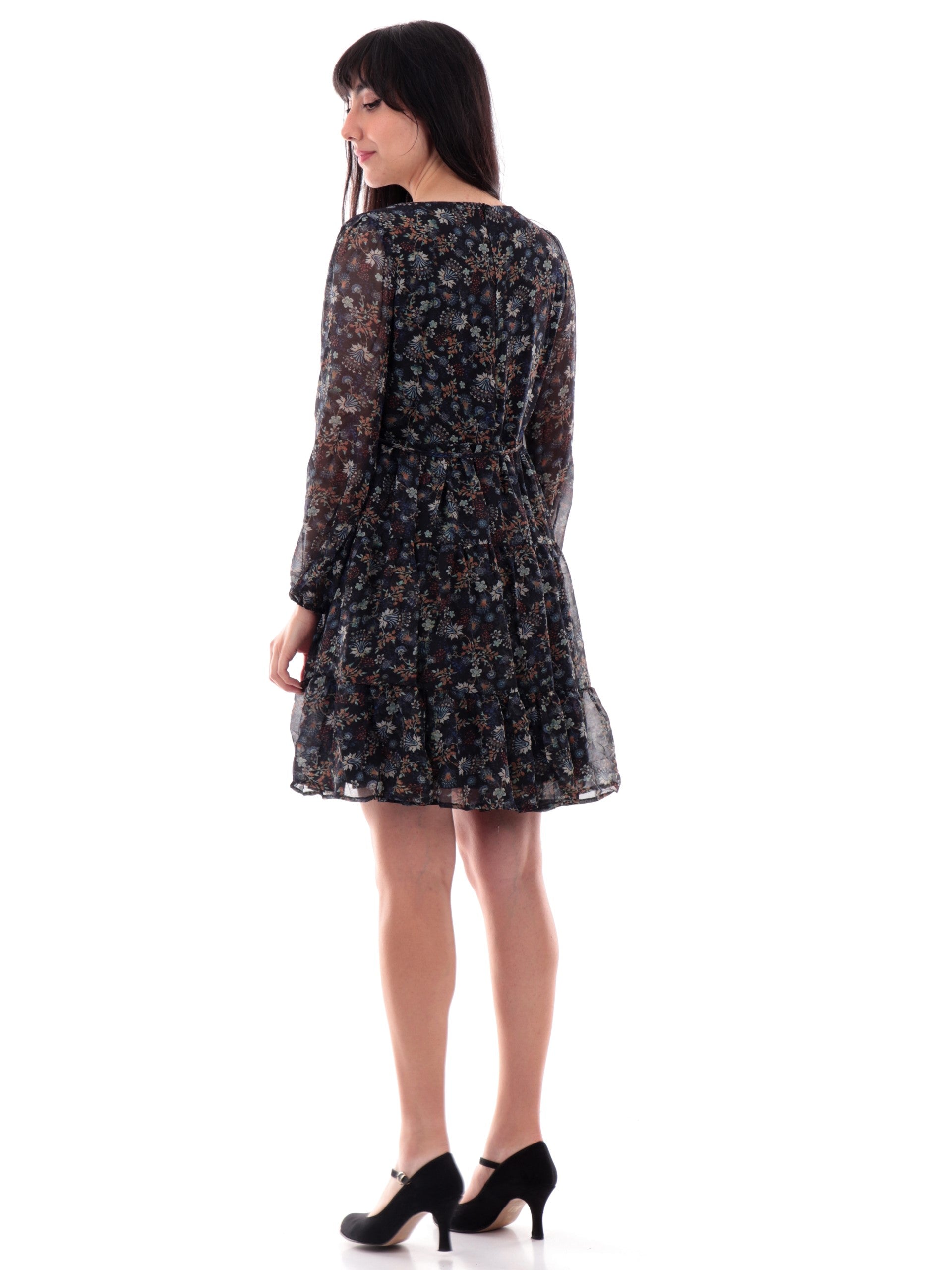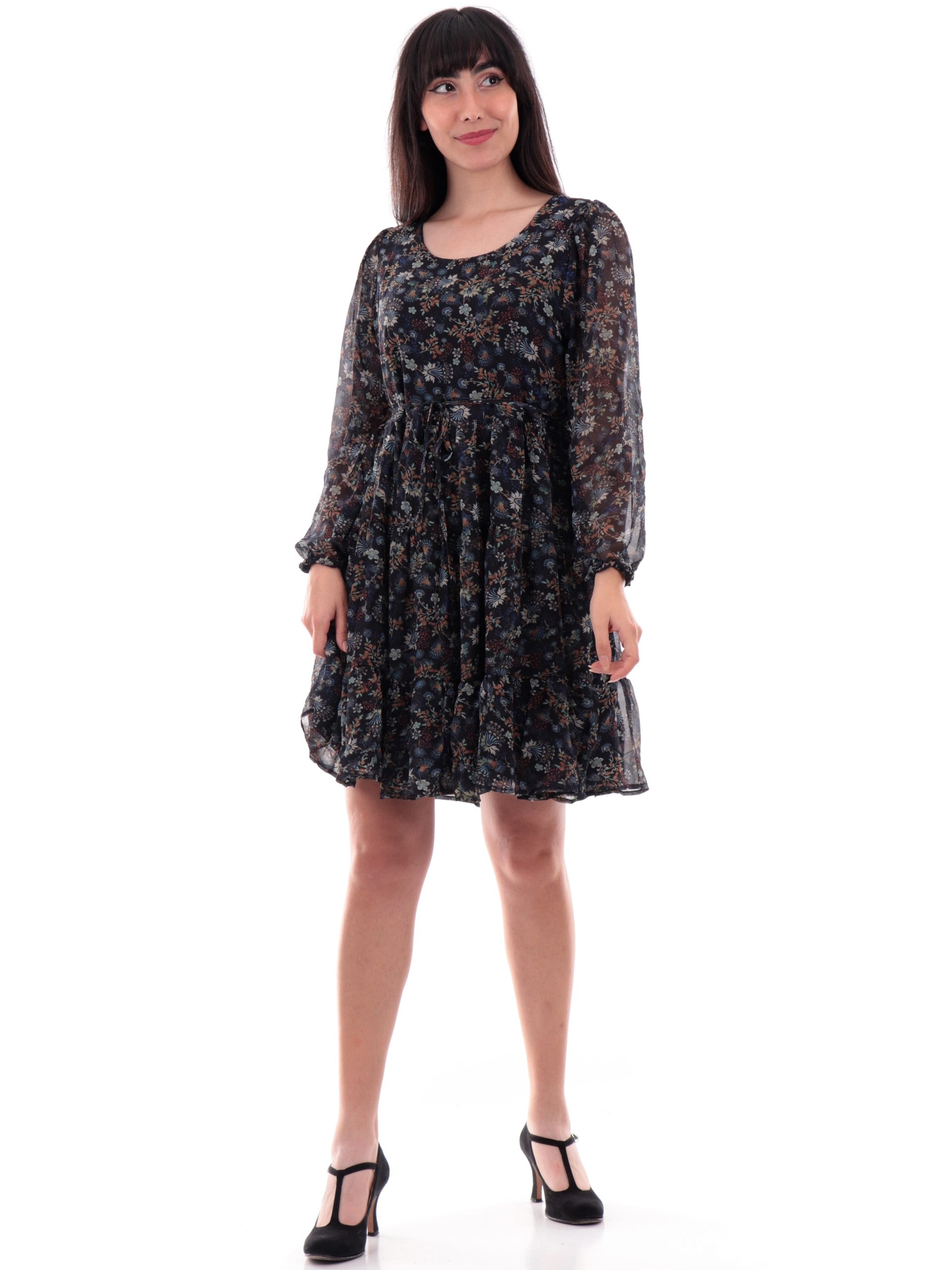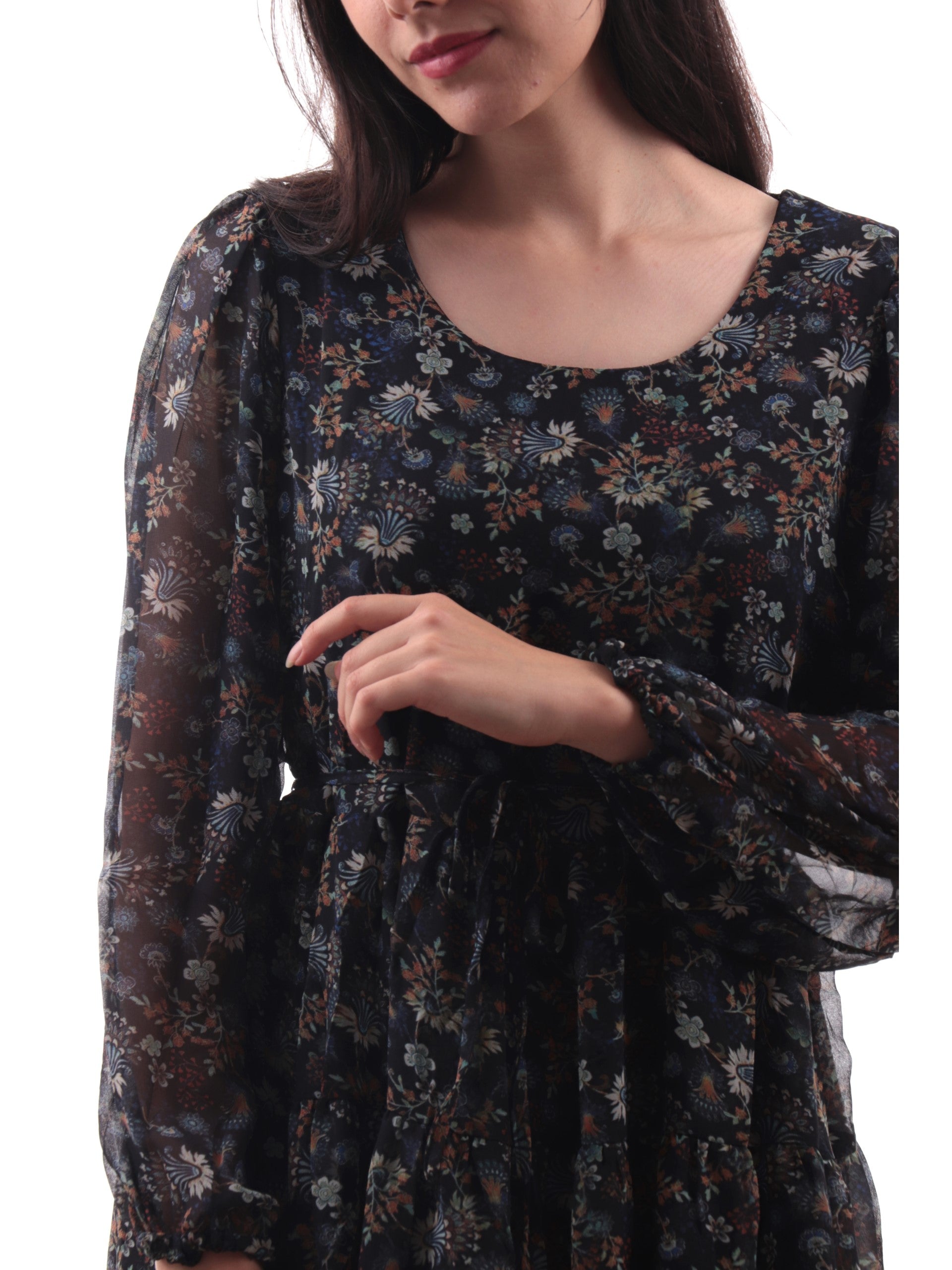 Vestito a fiori Molly Bracken nero da donna svasato con balze N263CN. Questo abito donna Molly ha lo scollo a barchetta, la chiusura full zip sul lato posteriore, le maniche lunghe, la cintura, la fantasia floreale a contrasto colore e il fondo svasato con balze.