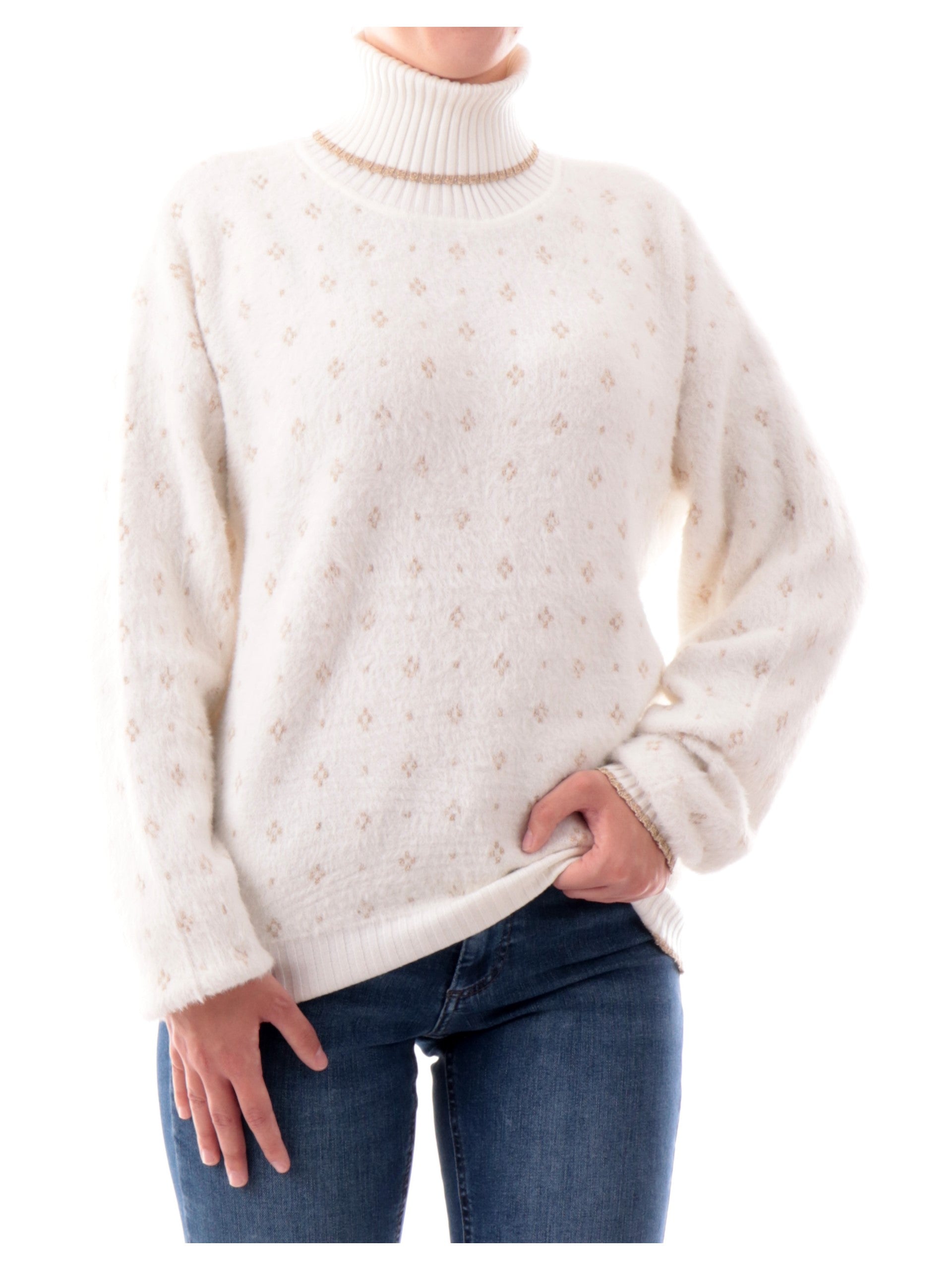Maglione Yes Zee Bianca da donna a collo alto con inserti lurex . Questo maglione yes zee donna bianca è caratterizzato da un tessuto soffice e morbido , maniche a sbuffo e collo dolcevita.