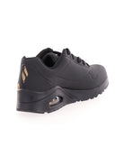 Scarpe Skechers nere da donna Uno Golden Heart. Queste scarpe Skechers da bambina hanno la tomaia in mesh, chiusura con lacci e cuori dorati ricamati all over.