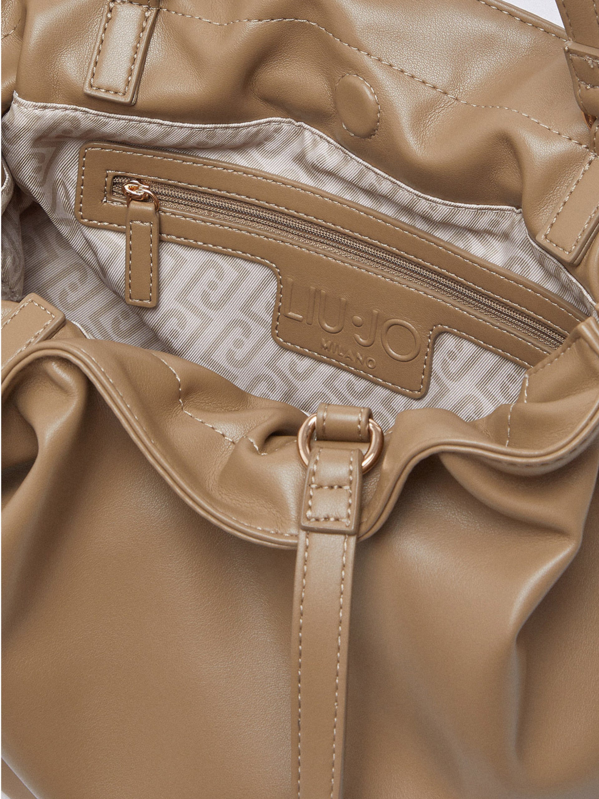 Borsa Liu Jo da donna beige con tracolla removibile Hobo. Questa borsa Liu Jo, realizzata in eco pelle, morbida, elegante, ha questa caratteristica Riccy Bag che amplifica ogni linea, sul davanti troviamo il logo applicato e l’arricciatura a coulisse scolpisce la forma e da un tocca di eleganza. All'interno troviamo un unico scomparto grande e ampio per riporre qualsiasi oggetto.