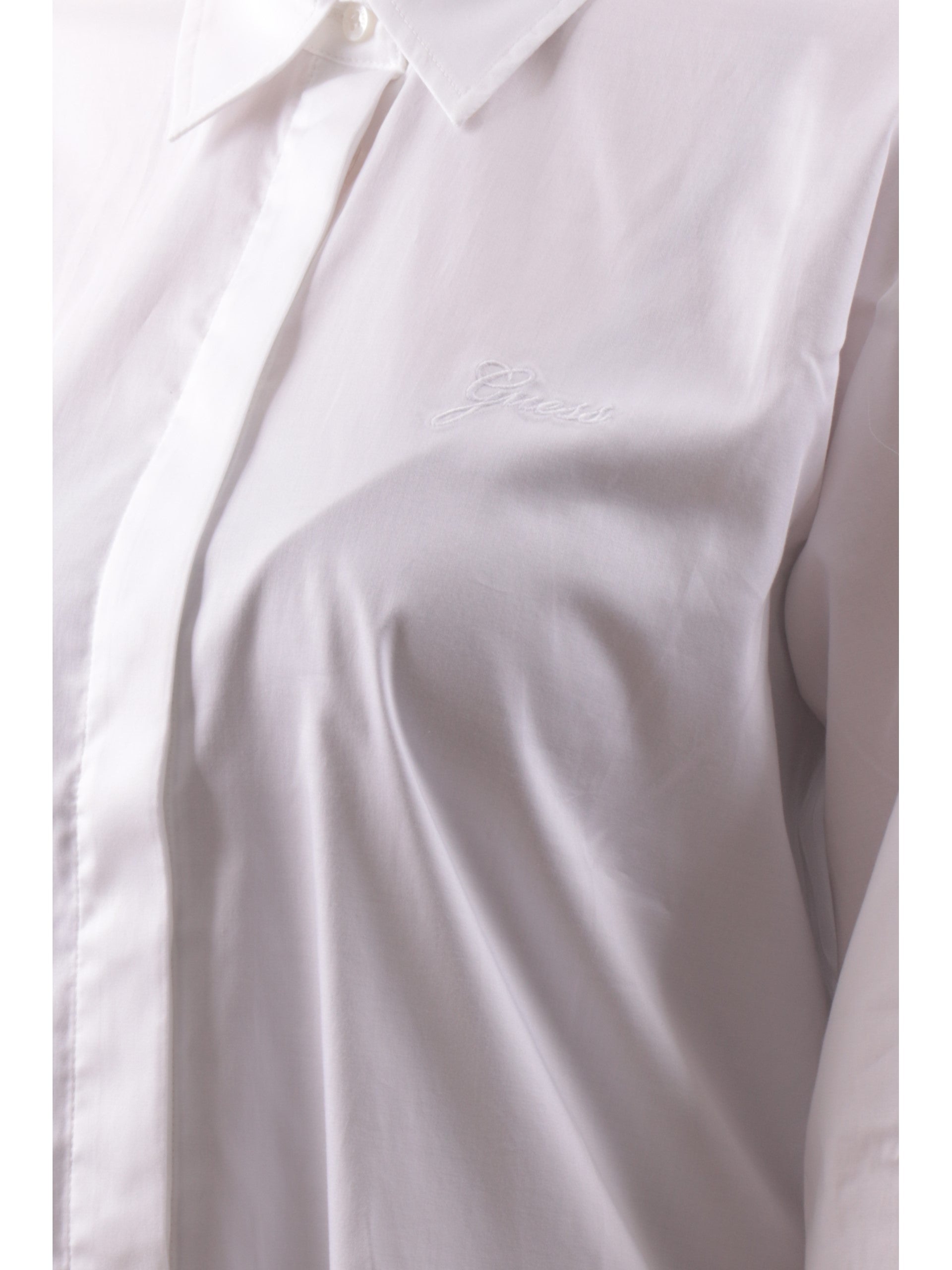 Camicia Guess bianca da donna Over Danila Poplin Shirt. Questa camicia Guess, realizzata in cotone e dalla vestibilità over che la rende morbida, leggera e comoda, perfetta per la stagione primavera-estate, è caratterizzata dalla chiusura con bottoni, polsini con due bottoni e fondo regolare. Questa camicia bianca in raso da donna dalla fantasia over la rende sia elegante che sportiva e casual edè perfetta per un qualsiasi evento