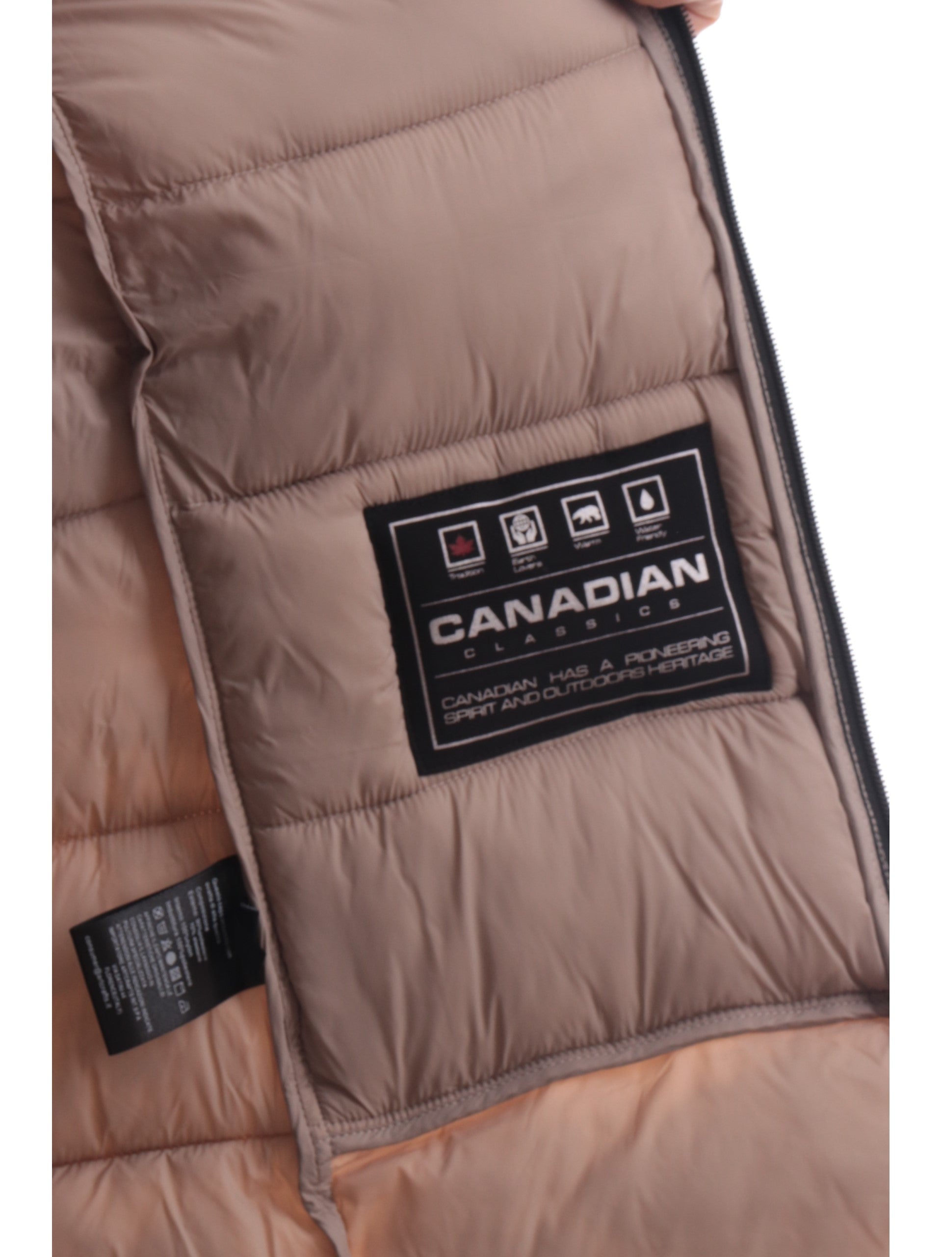 Giubbino lungo CANADIAN donna beige LYTTON collo alto. Questo giubbino CANADIAN è realizzato da due diverse fantasie di tessuto, sul davanti e sulle maniche troviamo un tessuto liscio e impermeabile,sul retro e sul cappuccio troviamo un tessuto trapuntato caldo e soffice al tatto. Questa giacca Canadian è caratterizzata da cappuccio fisso, chiusura full zip centrale con doppio cursore, due tasche laterali con zip, e il logo del brand applicato sulla manica sinistra.