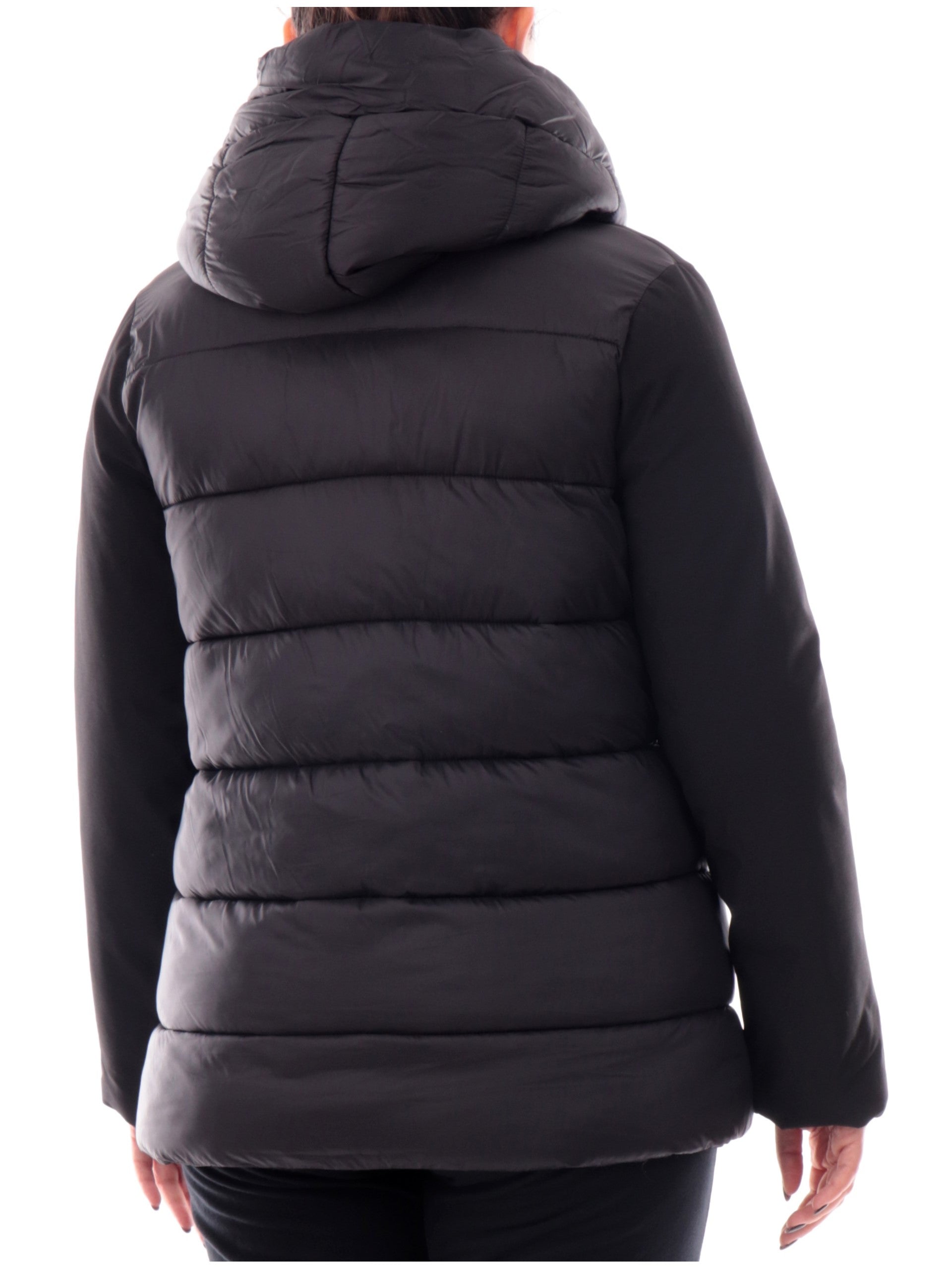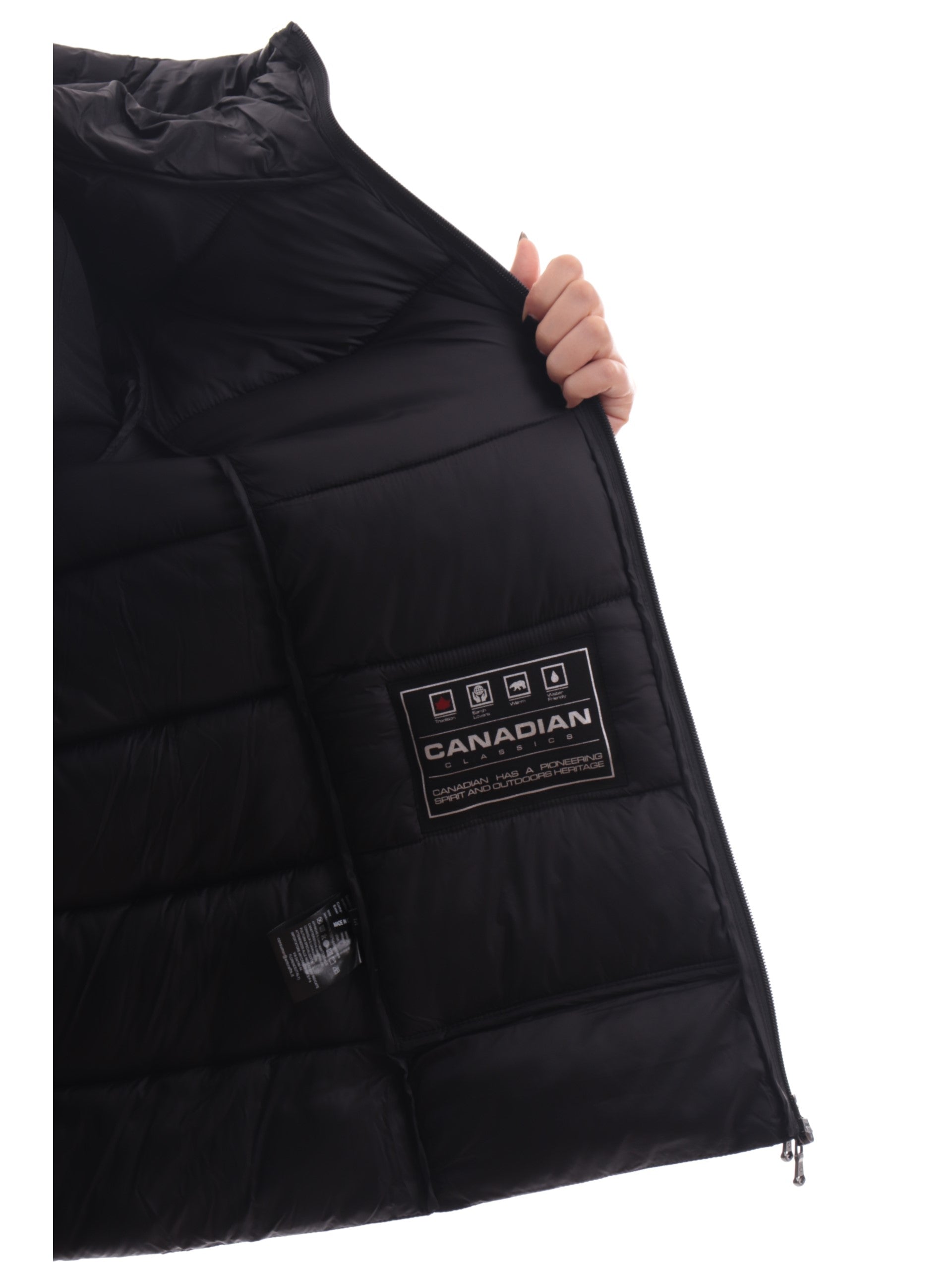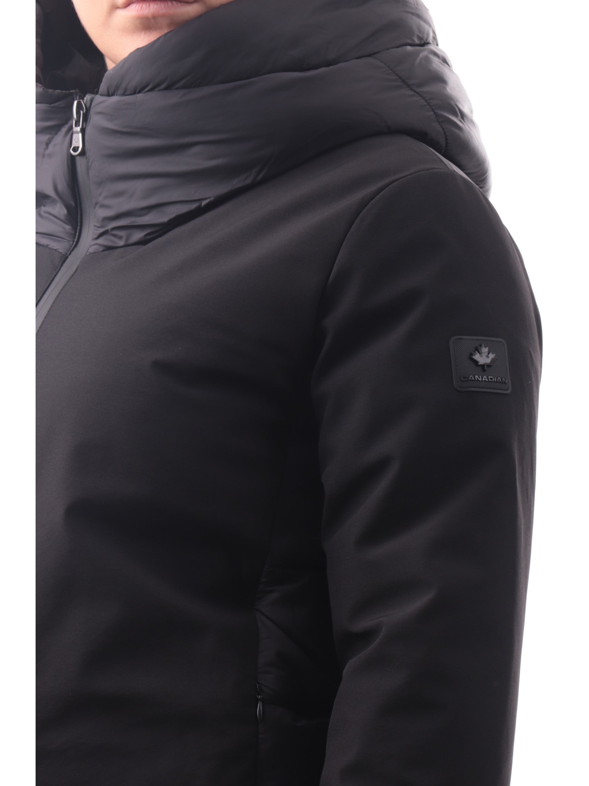 Giubbino lungo CANADIAN donna nero LYTTON collo alto. Questo giubbino CANADIAN è realizzato da due diverse fantasie di tessuto, sul davanti e sulle maniche troviamo un tessuto liscio e impermeabile, sul retro e sul cappuccio troviamo un tessuto trapuntato caldo e soffice al tatto. Questa giacca Canadian è caratterizzata da cappuccio fisso, chiusura full zip centrale con doppio cursore, due taschelaterali con zip, e il logo del brand applicato sulla manica sinistra.