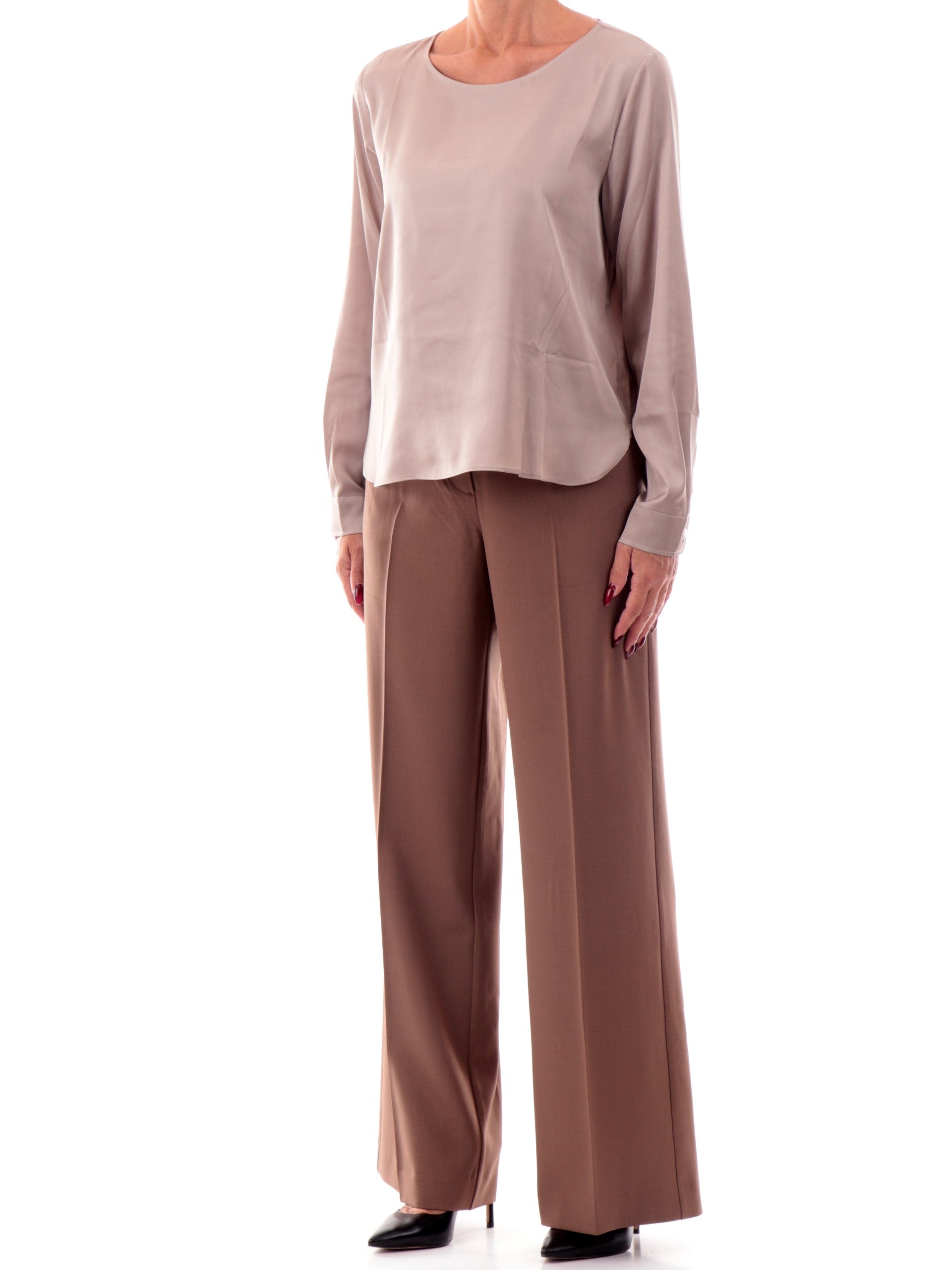 Blusa Emme Marella beige satin in raso da donna modello MADERA, realizzata in tessuto elegante e raffinato. Questa camicia Marella raso ha il fondo asimmetrico leggermente più lungo sul retro, le maniche lunghe e una vestibilità morbida.