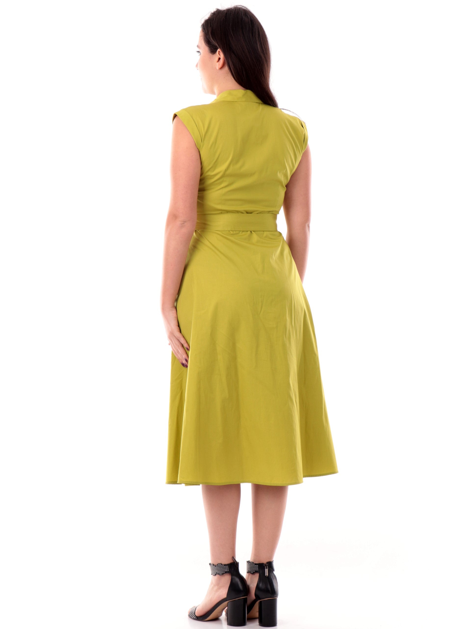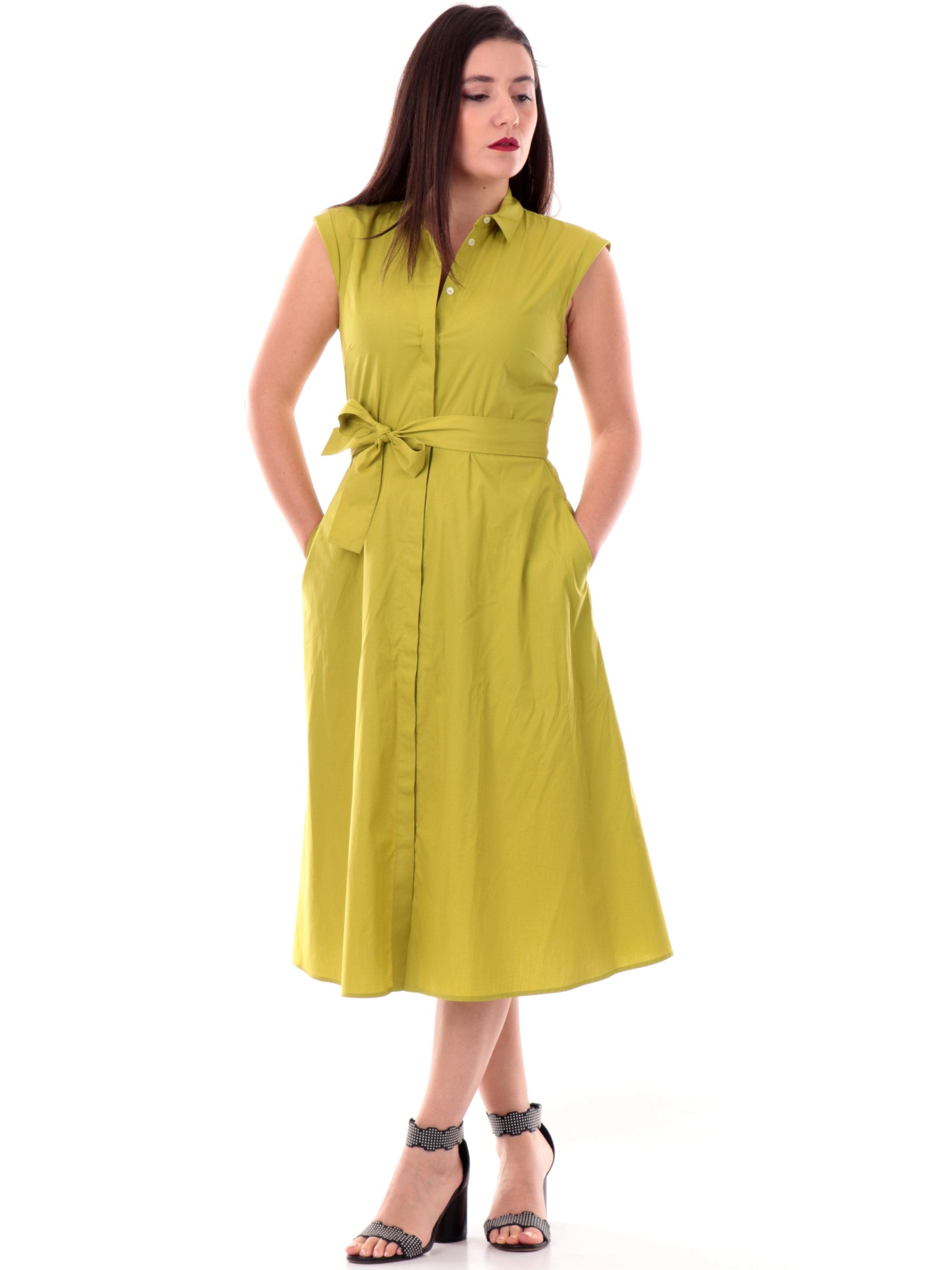 Vestito verde Emme Marella da donna con cintura removibile. Questo vestito verde, realizzato 100% in puro cotone, morbido e leggero, perfetto per la stagione primavera-esatate, è caratterizzato dal classico di una camicia, maniche corte, cintura removibile, chiusura con bottoni e il fondo regolare
