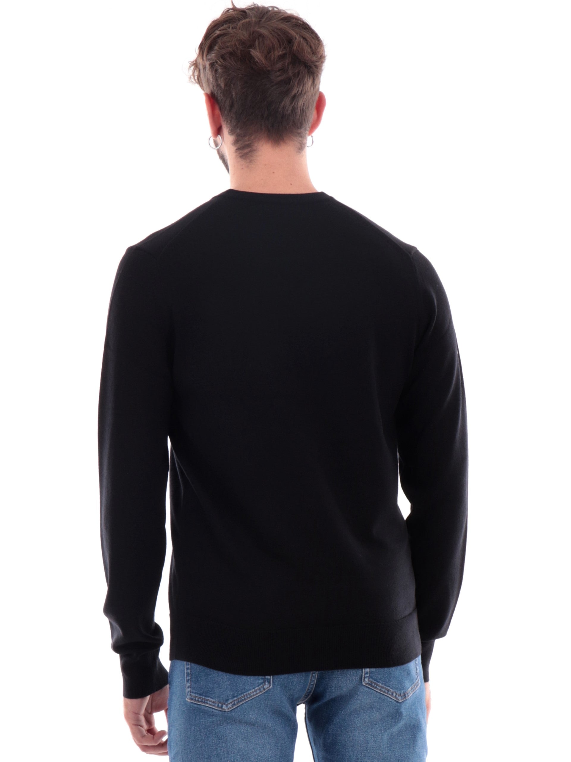 Maglione Fred Perry nero da uomo scollo a V K9600, realizzato in morbida e calda lana. Questo maglione Fred Perry nero ha lo scollo a V, il logo del brand ricamato sul cuore a contrasto colore, polsini e fondo elasticizzati.