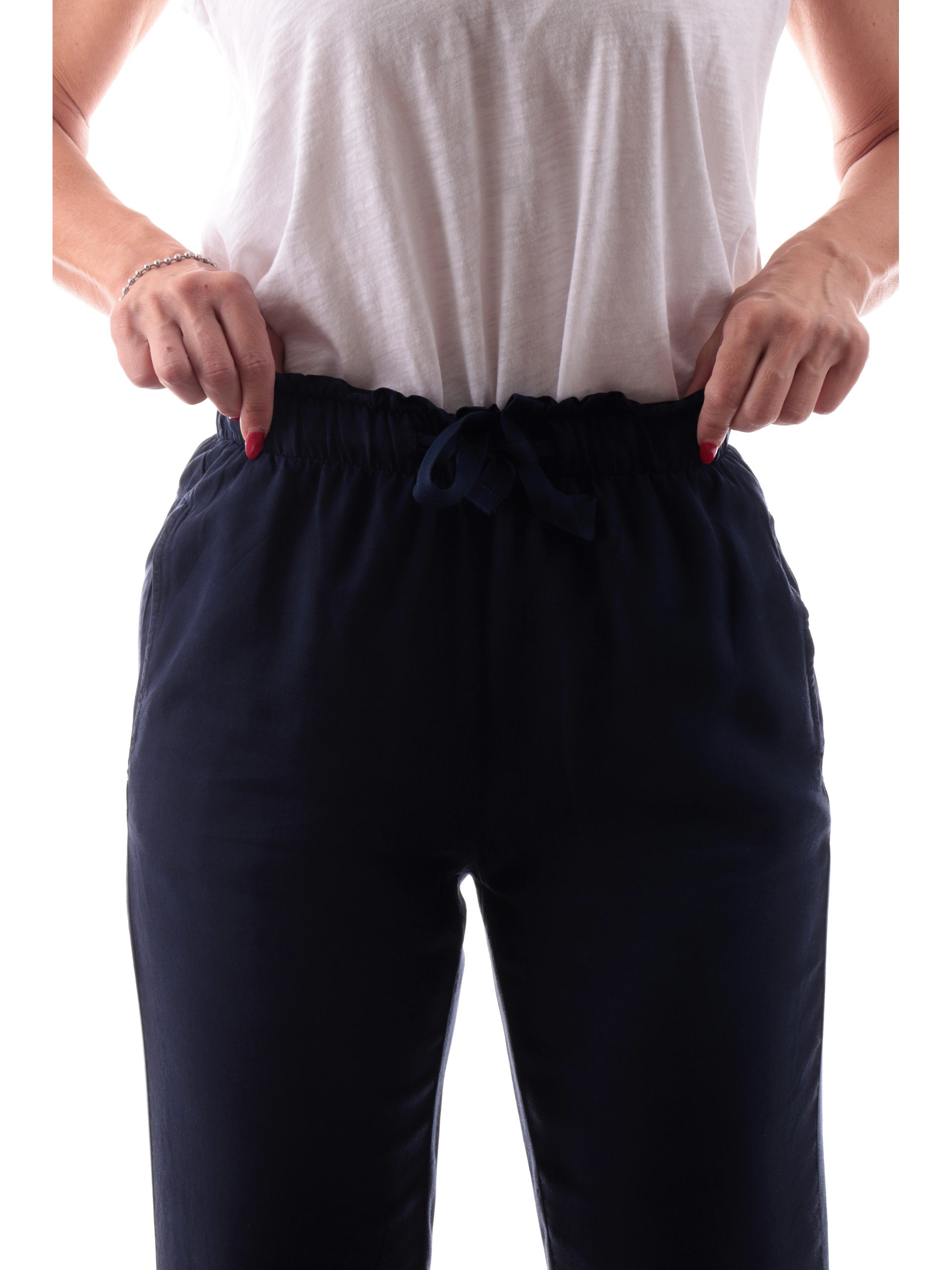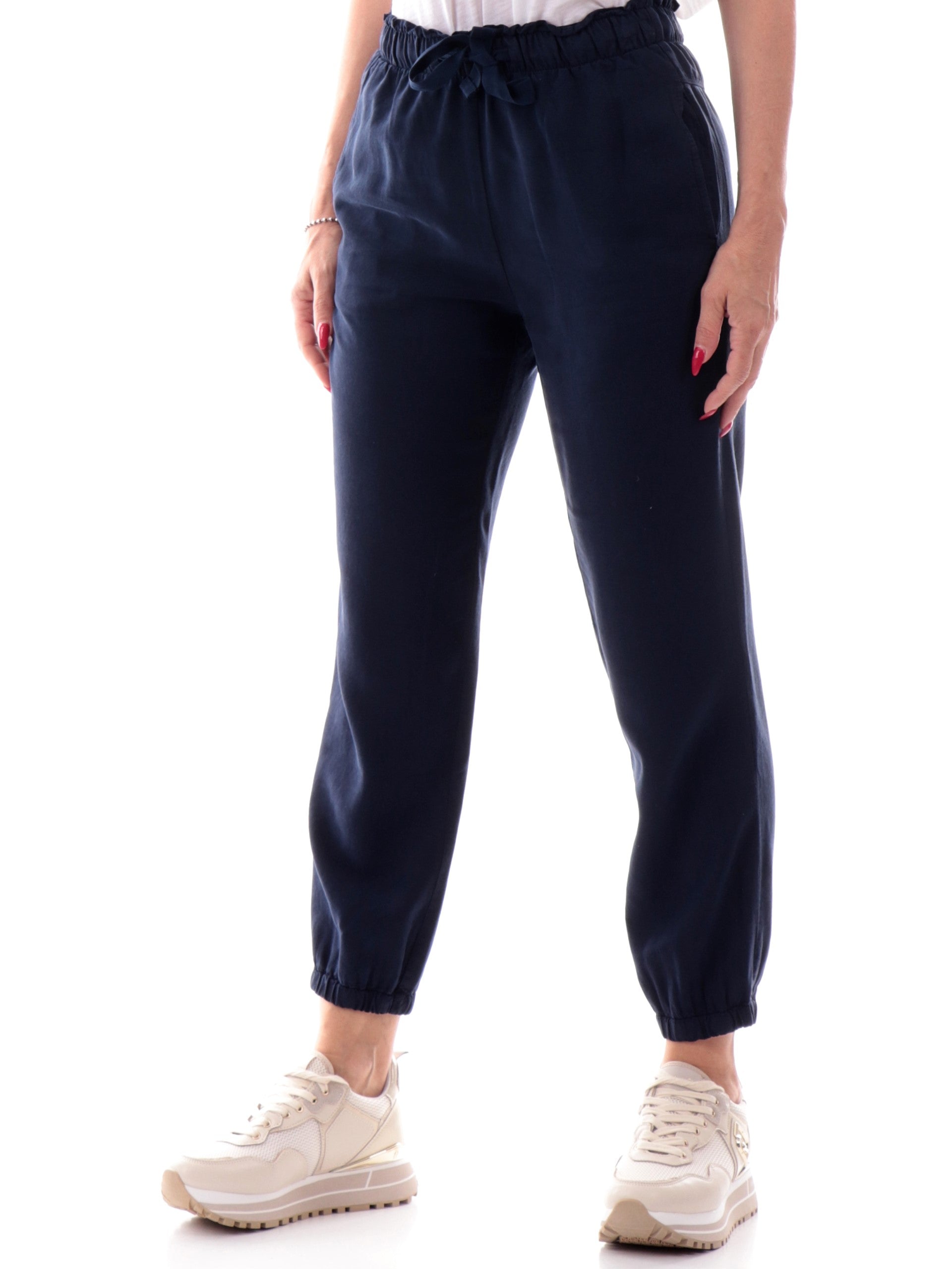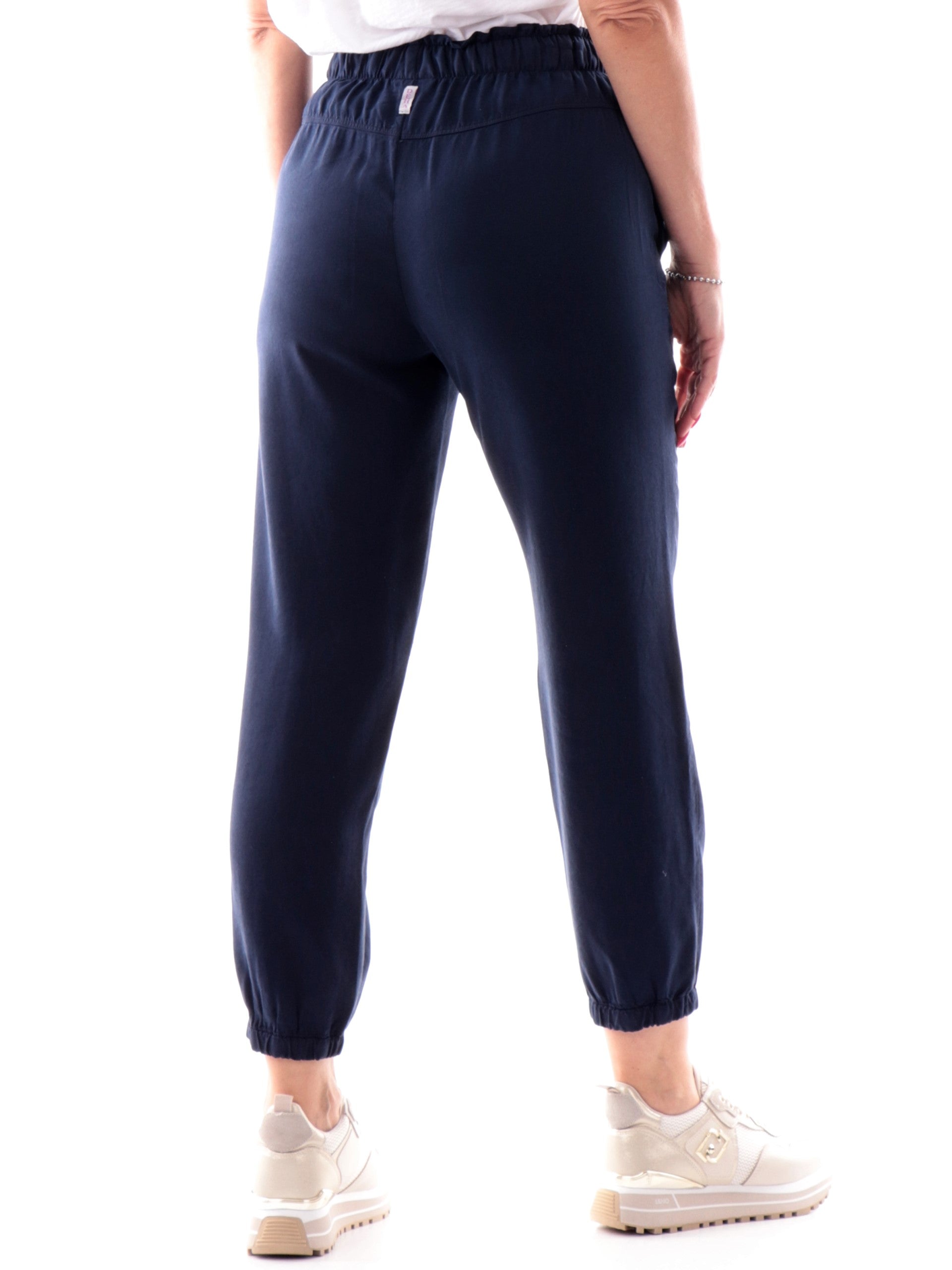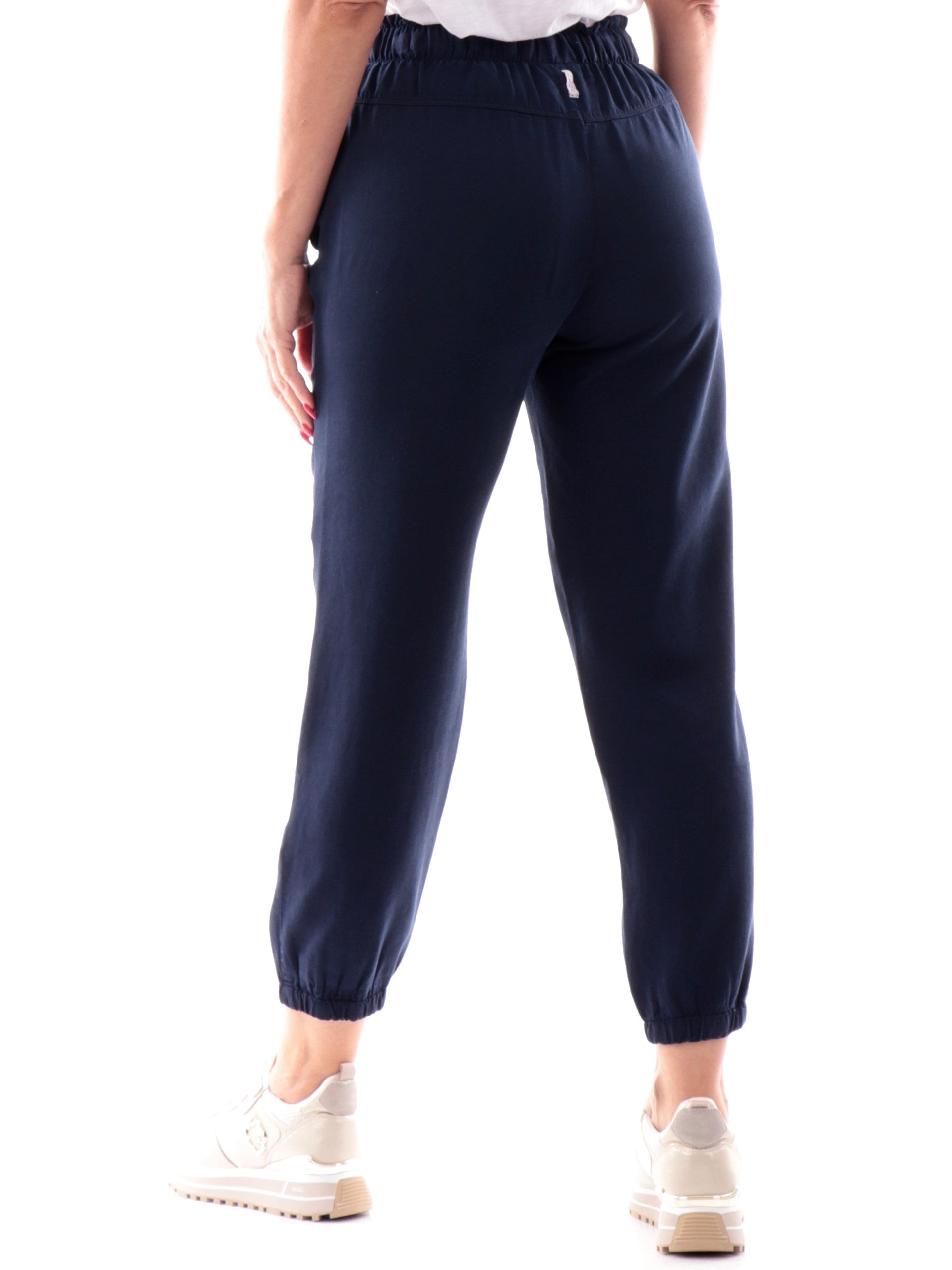 Pantaloni tuta Deha blu in lyocell da donna con polsini A00686. Questi pantaloni donna Deha blu hanno la banda elastica sul punto vita regolabile con laccetti, due tasche laterali aperte e polsini elasticizzati.