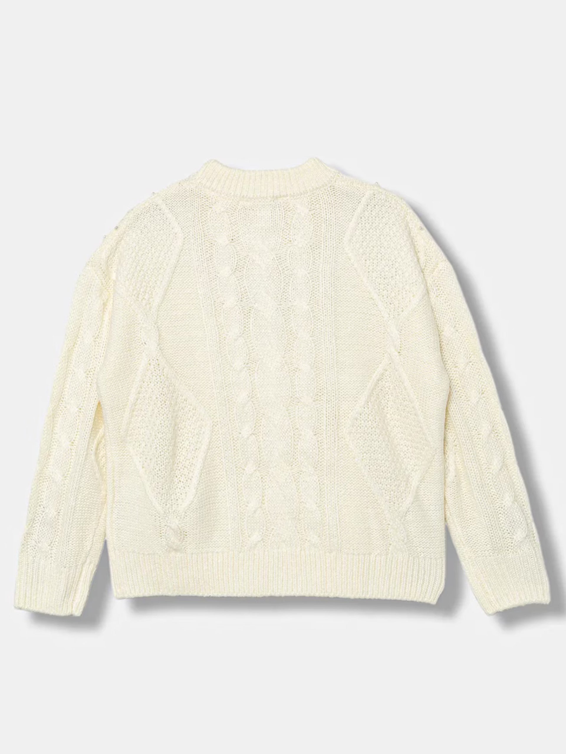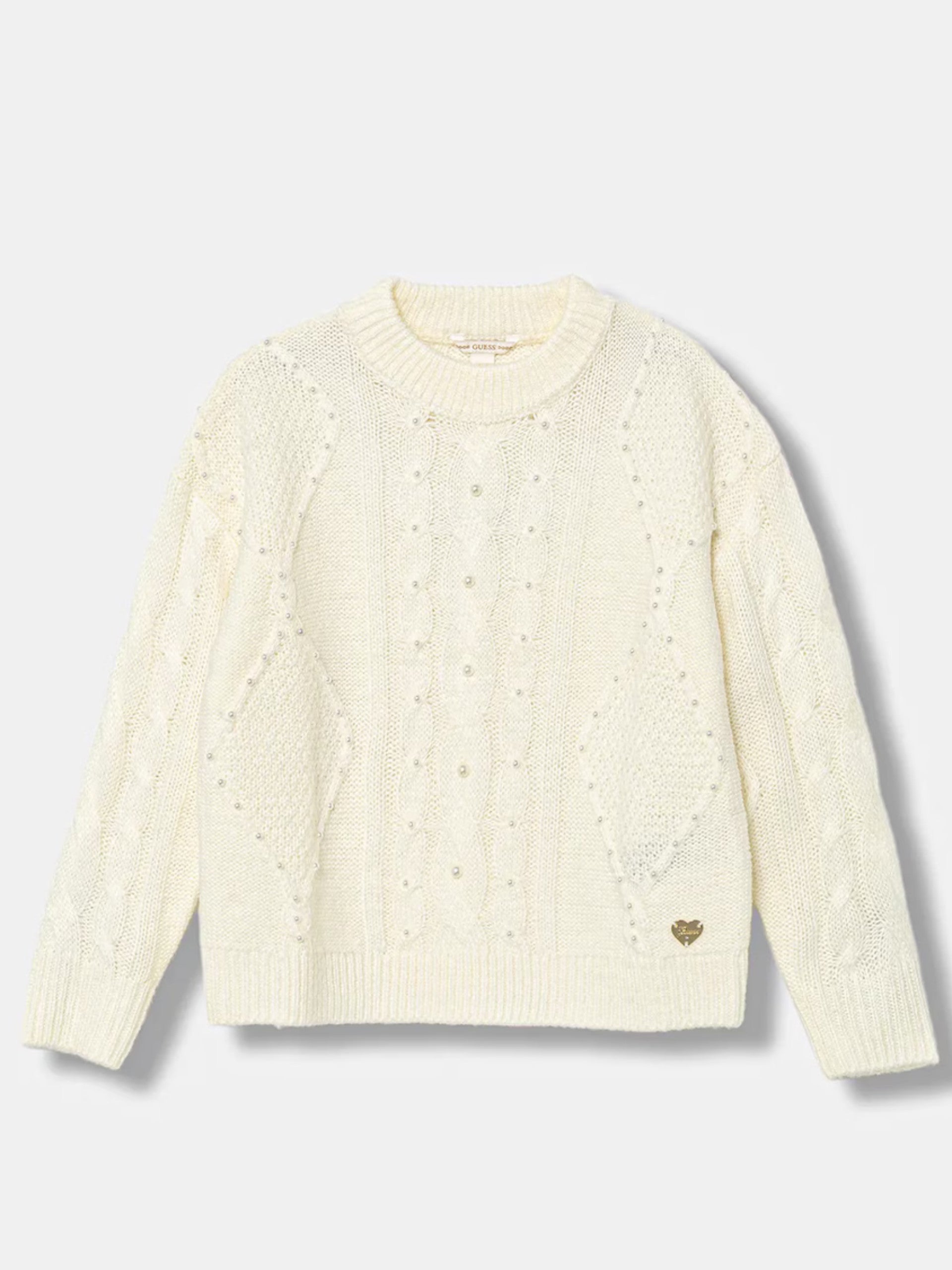 Maglione Guess bianco da bambina con perline Sweater. Questo maglione Guess è realizzato in tessuto caldo, soffice e morbido al tatto perfetto per i primi freddi invernali. Questo maglione da bambinaè caratterizzato dal girocollo, fantasia a treccia, perline sul davanti all over, il cuore con la scritta Guess in basso a sinistra, polsini e fondo elasticizzati a costine