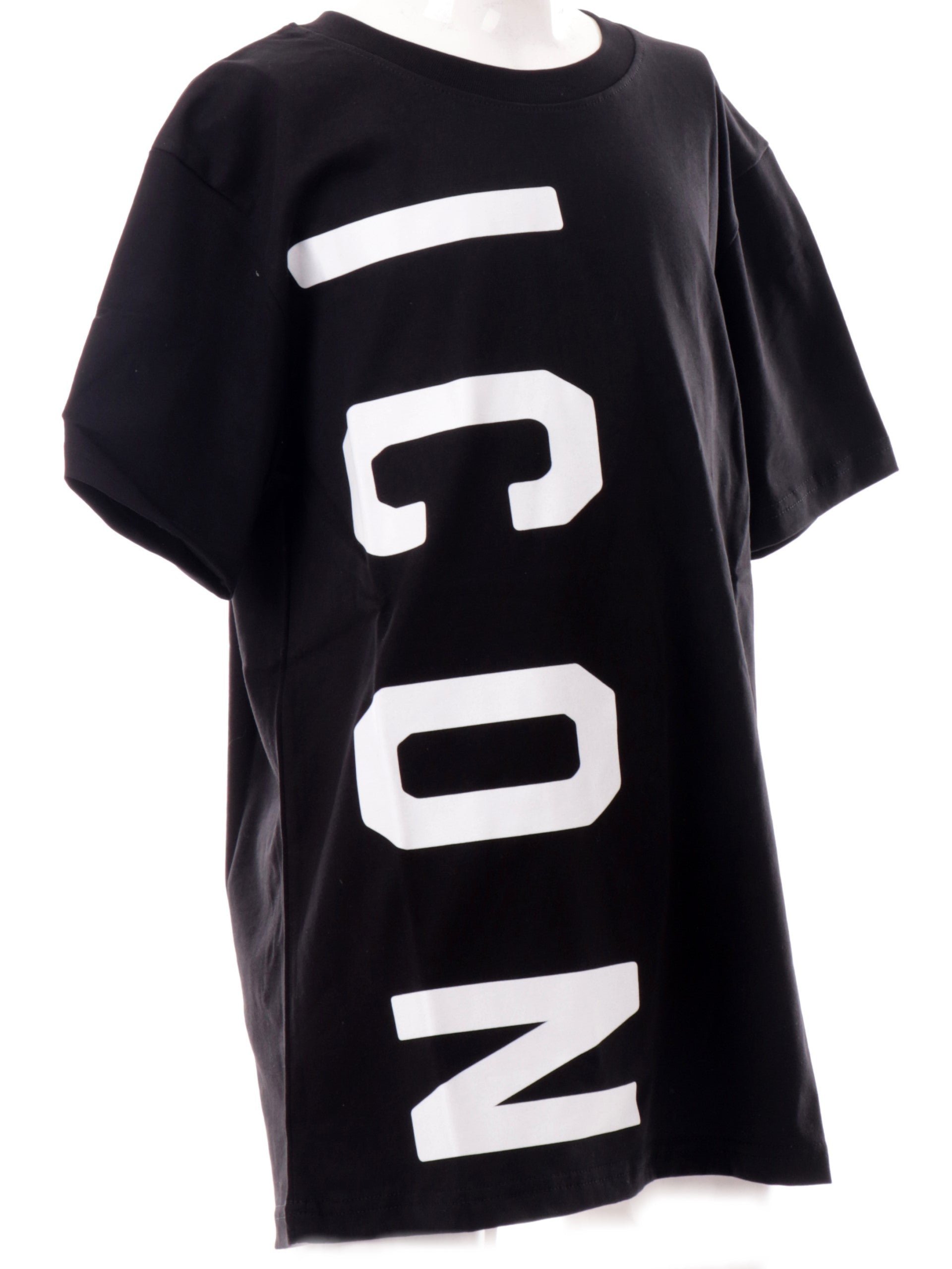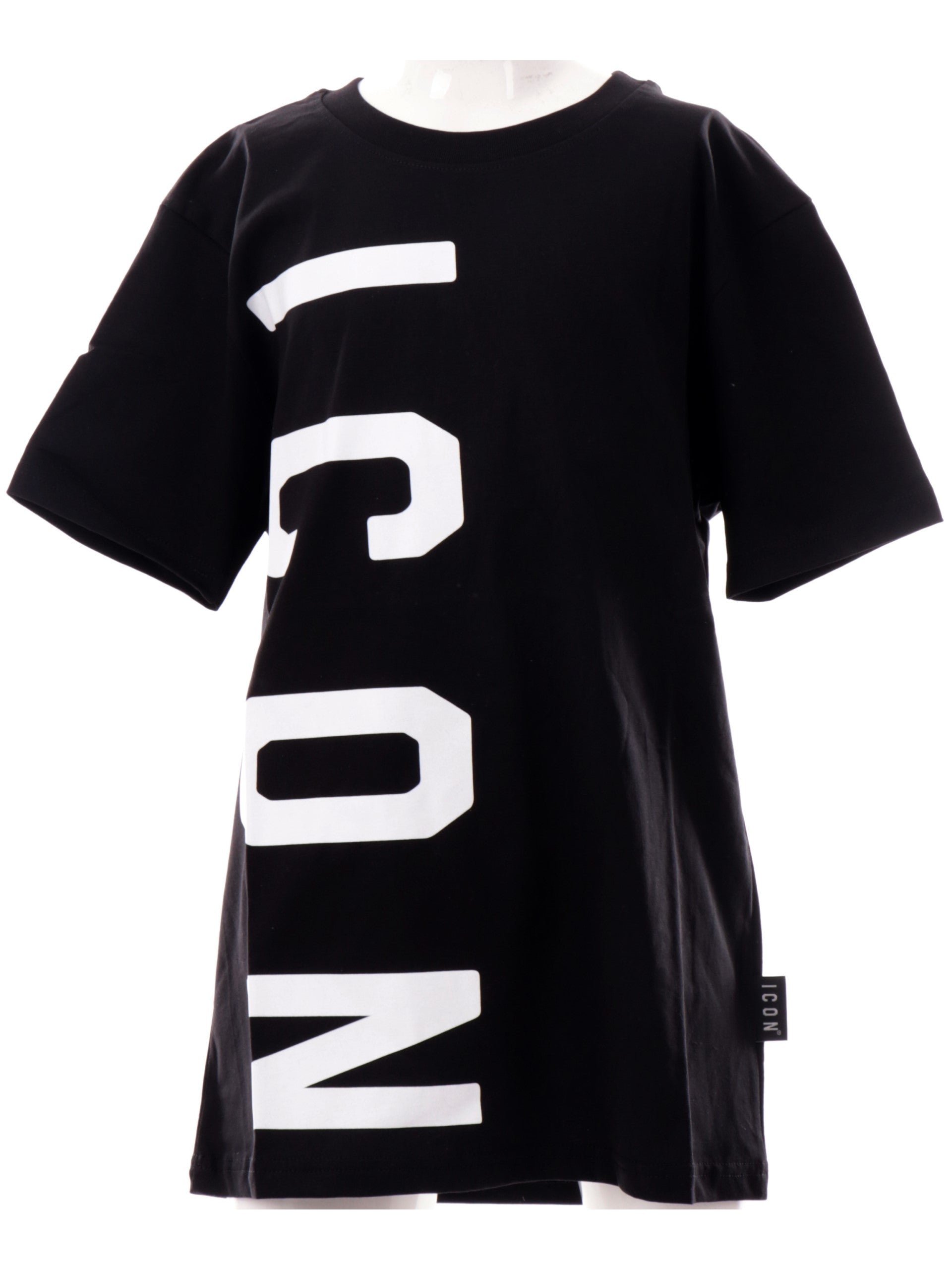 T-shirt Icon nera girocollo bambino. Questa t-shirt Icon nera a girocollo è caratterizzata da un maxi logo bianco laterale sul lato destro ed è realizzata in cotone puro, perfetto su tutti gli outfit