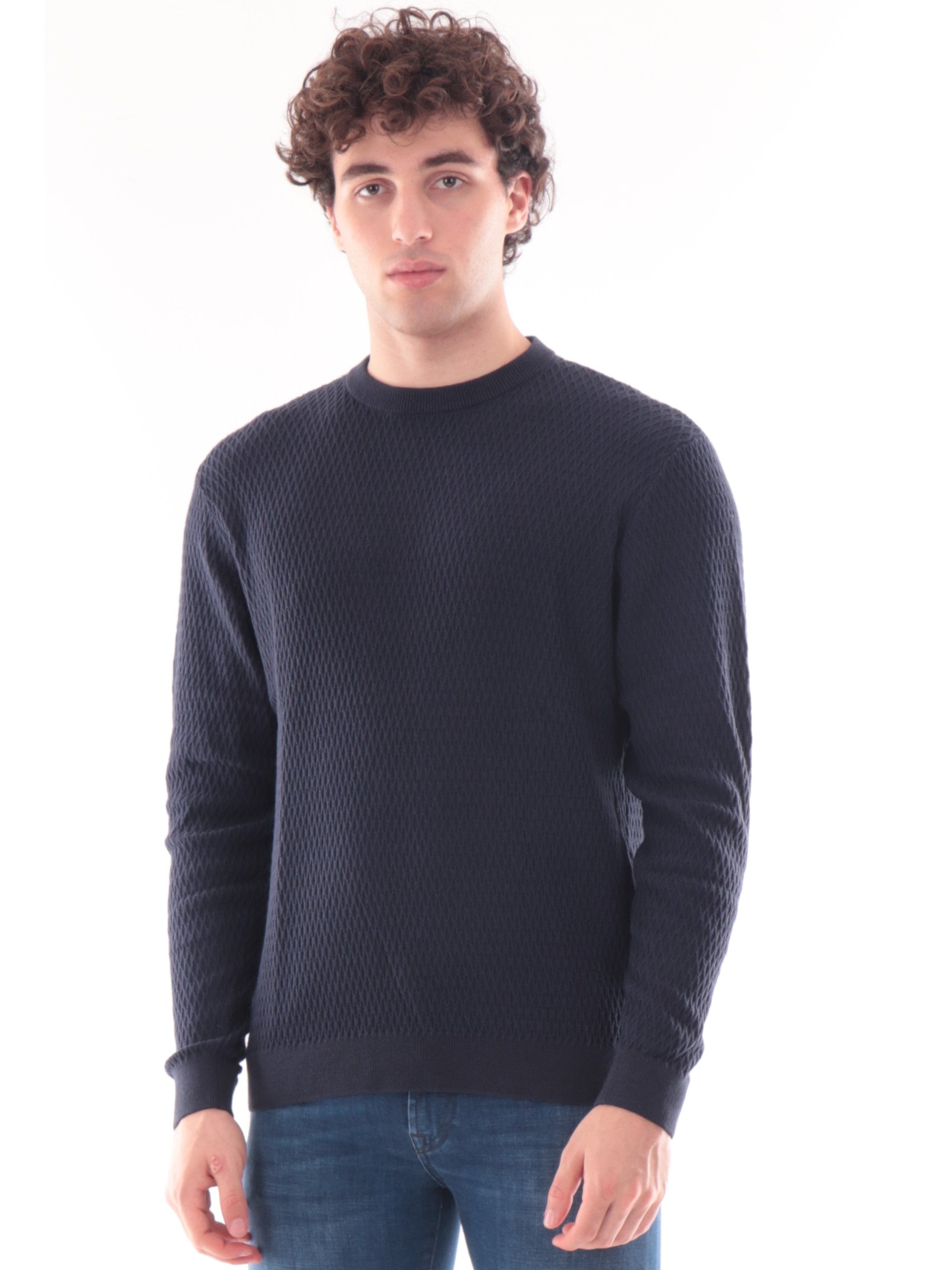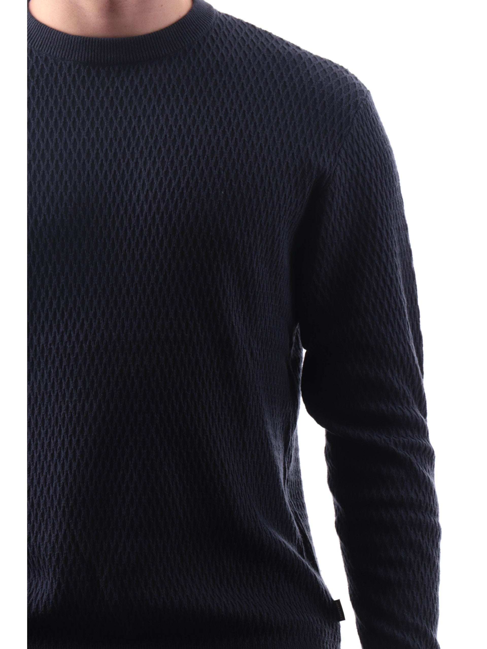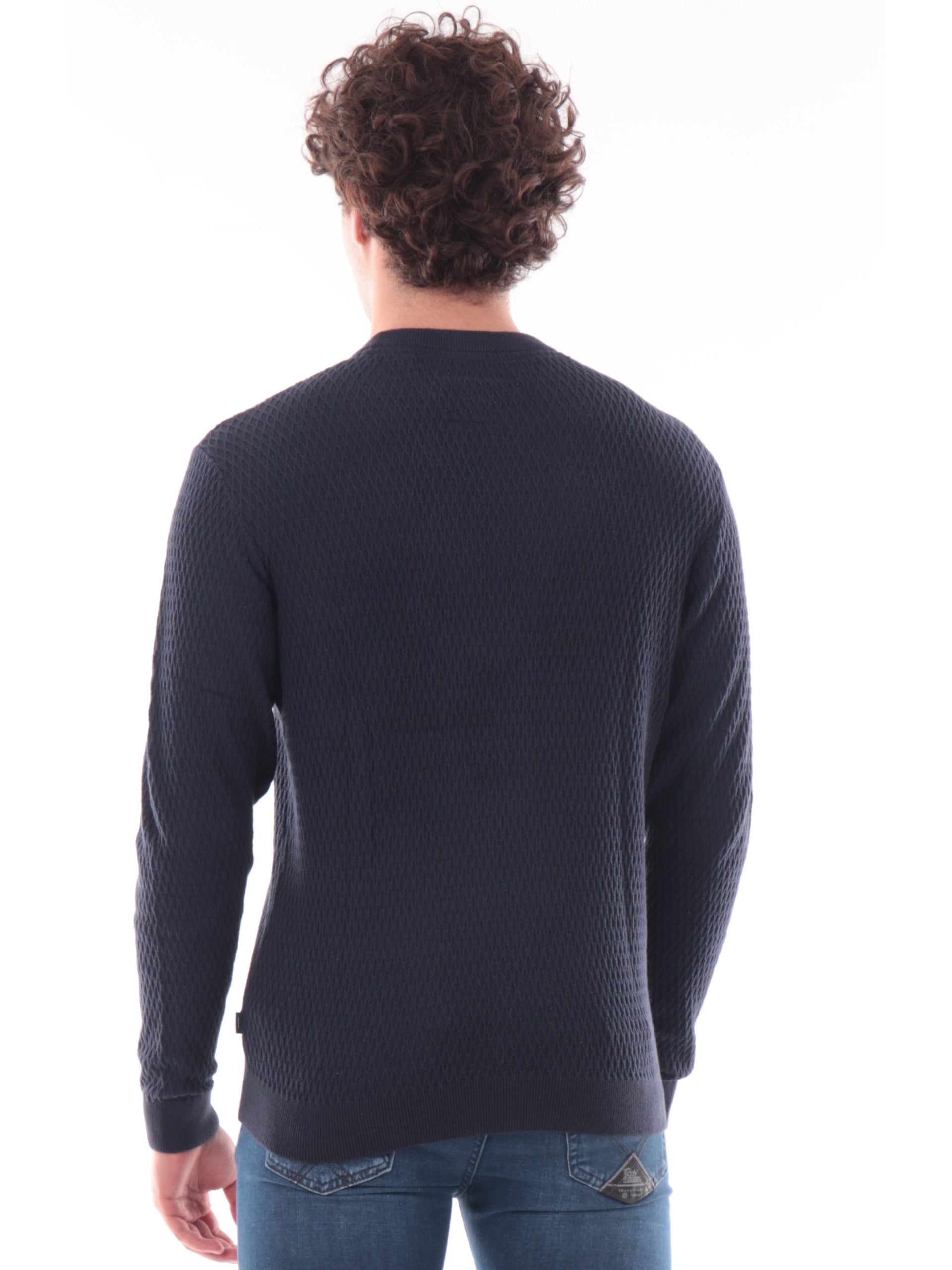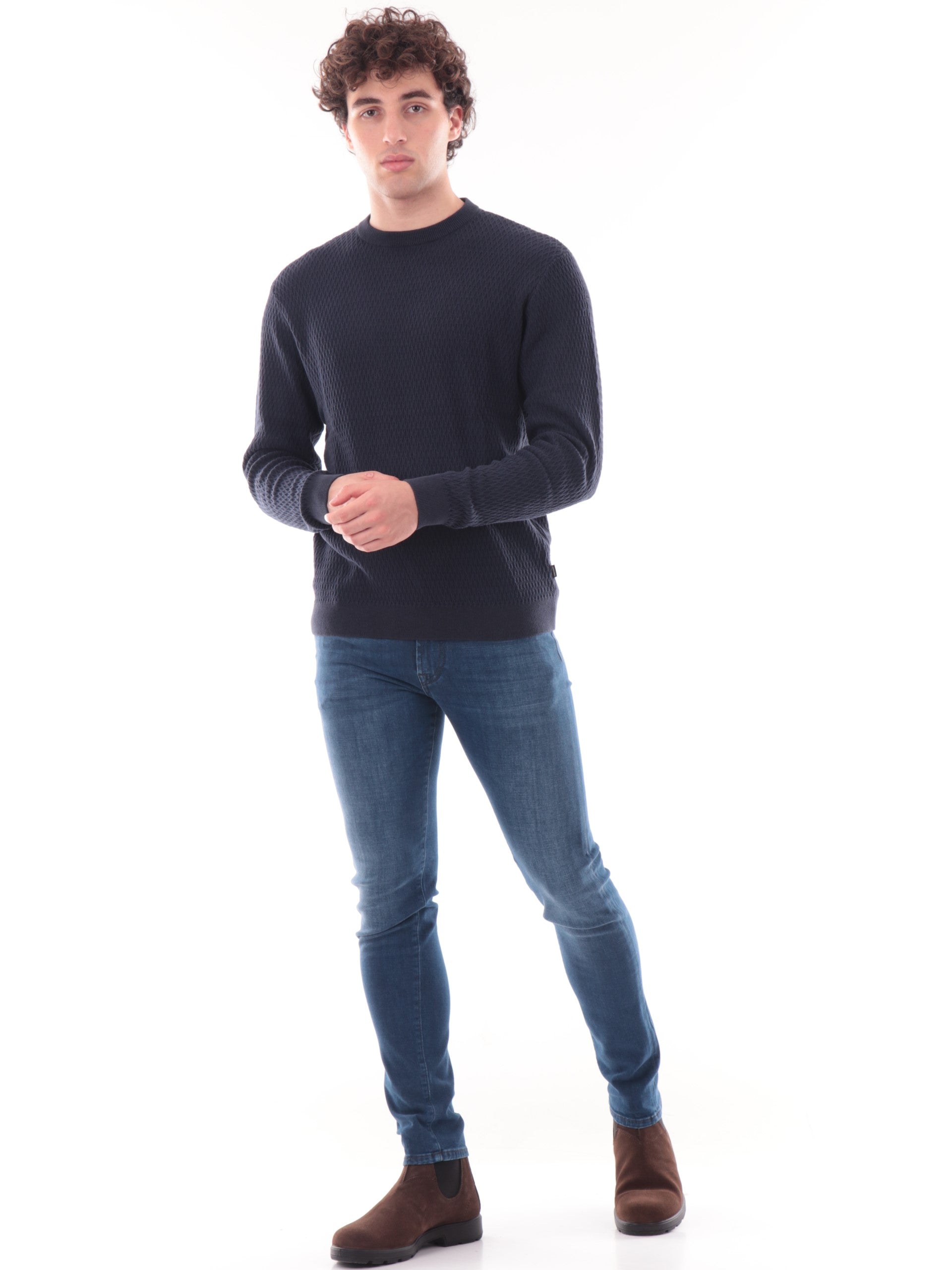Maglione Jack Jones blu girocollo da uomo Blareagan 12283381, realizzato in 100% puro cotone. Questo maglione uomo girocollo Jack Jones ha le maniche lunghe, polsini e fondo elasticizzati.