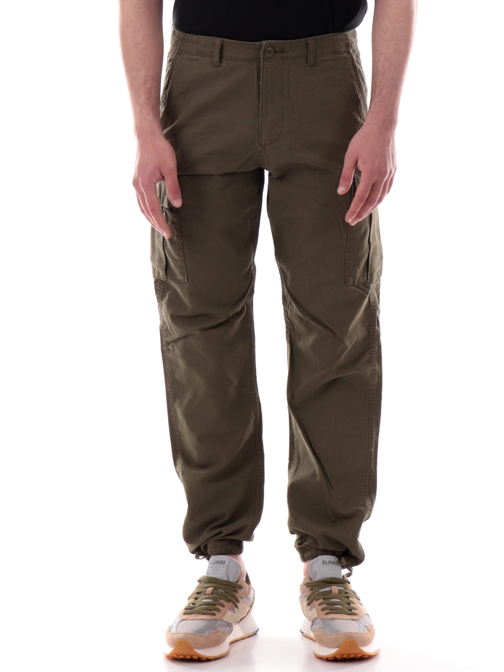 Pantaloni cargo Jack Jones verdi da uomo con tasconi 12258150, realizzati in 100% cotone. Questi cargo Jack Jones verdi hanno la chiusura con bottone più zip, due tasche laterali aperte con taglio obliquo, due tasche posteriori a filo, due tasconi altezza ginocchio con patta e il fondo regolabile con laccetti.