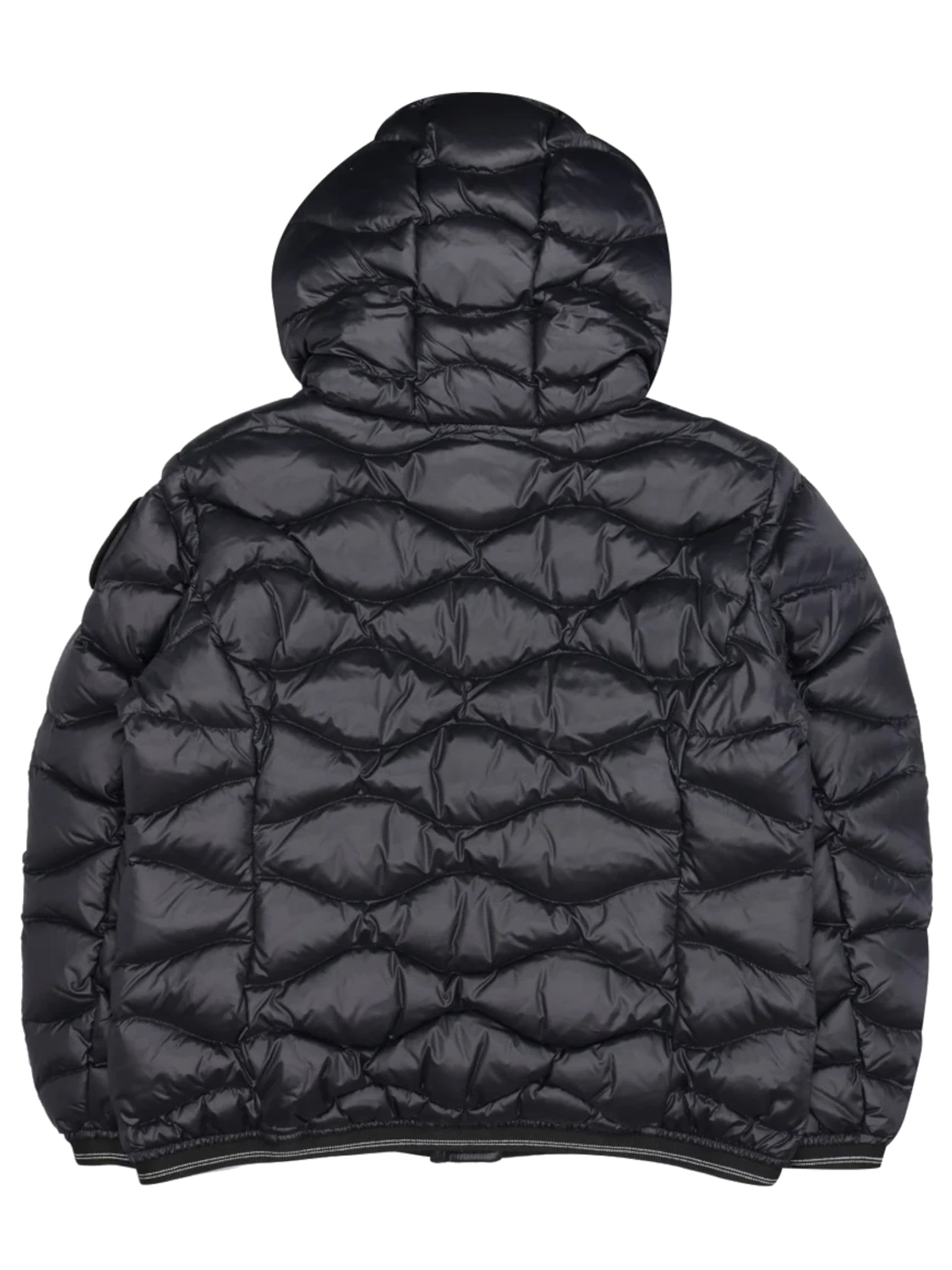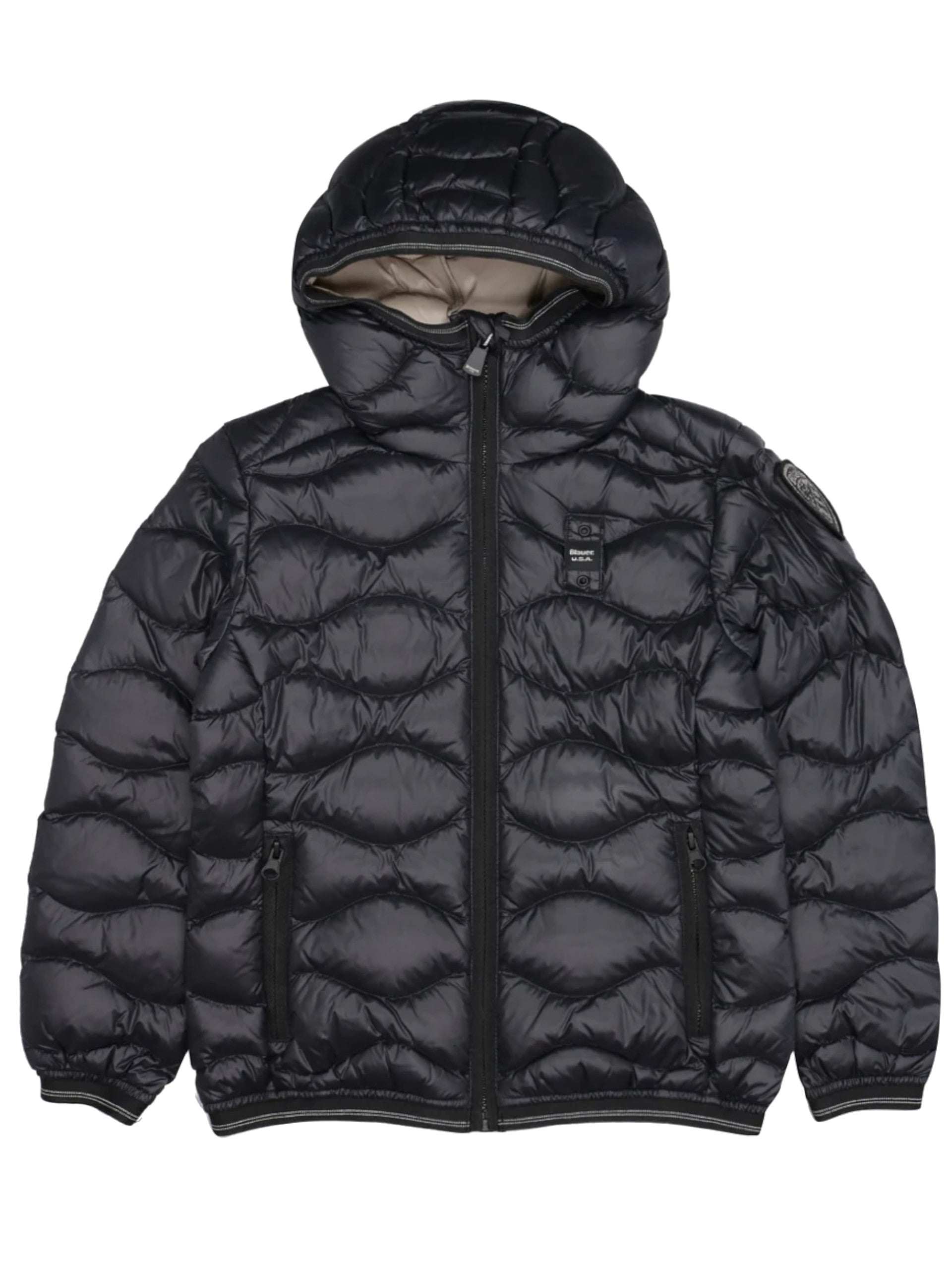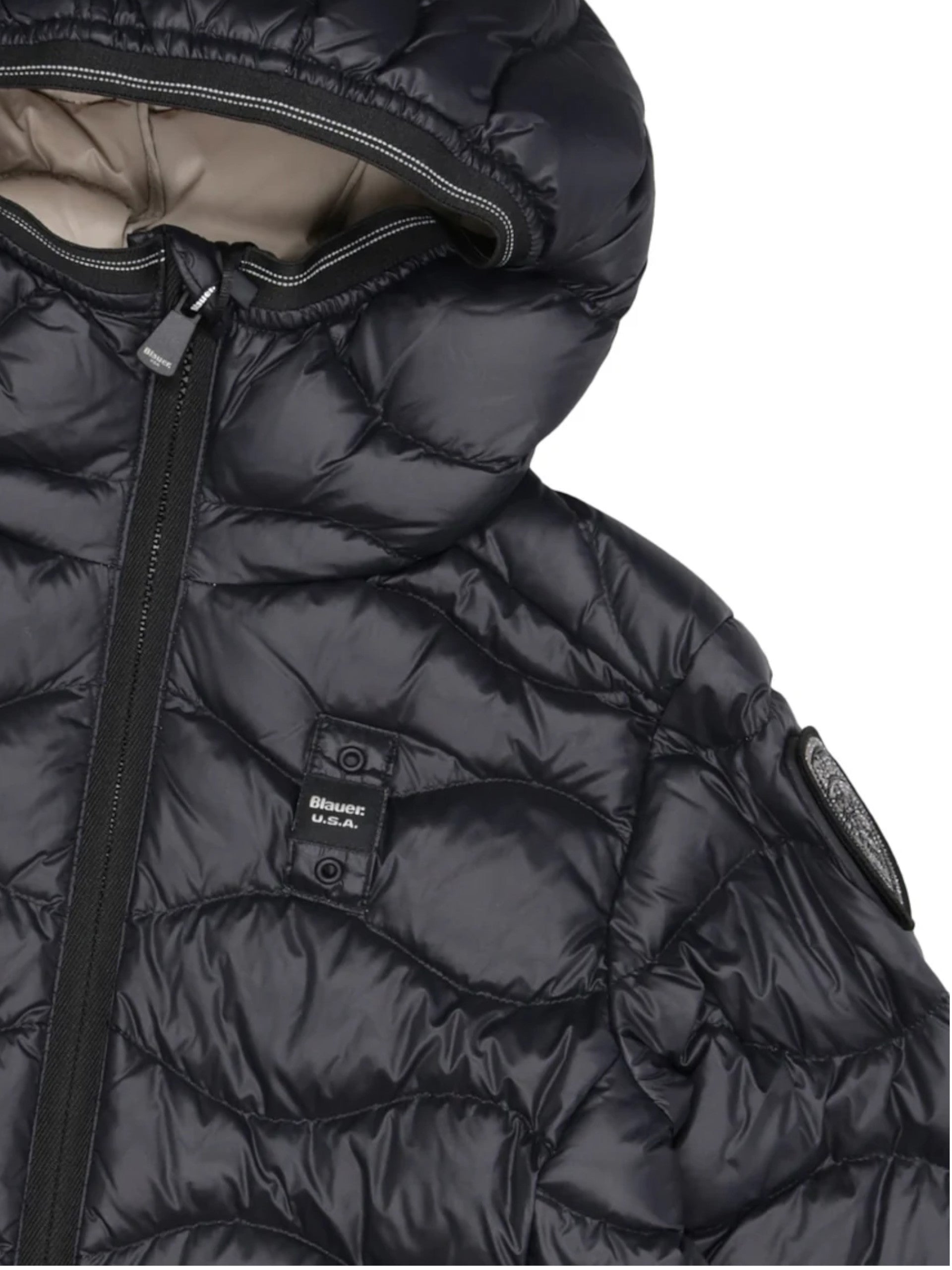Piumino Blauer nero onde logo strass Lowell da bambina C03385007285999EI, realizzato con imbottitura in piuma d'oca. Questo giubbino Blauer onde nero ha il cappuccio fisso regolabile con coulisse, lachiusura full zip centrale, due tasche laterali con zip e il patch Blauer brillantini removibile sulla manica sinistra con strass