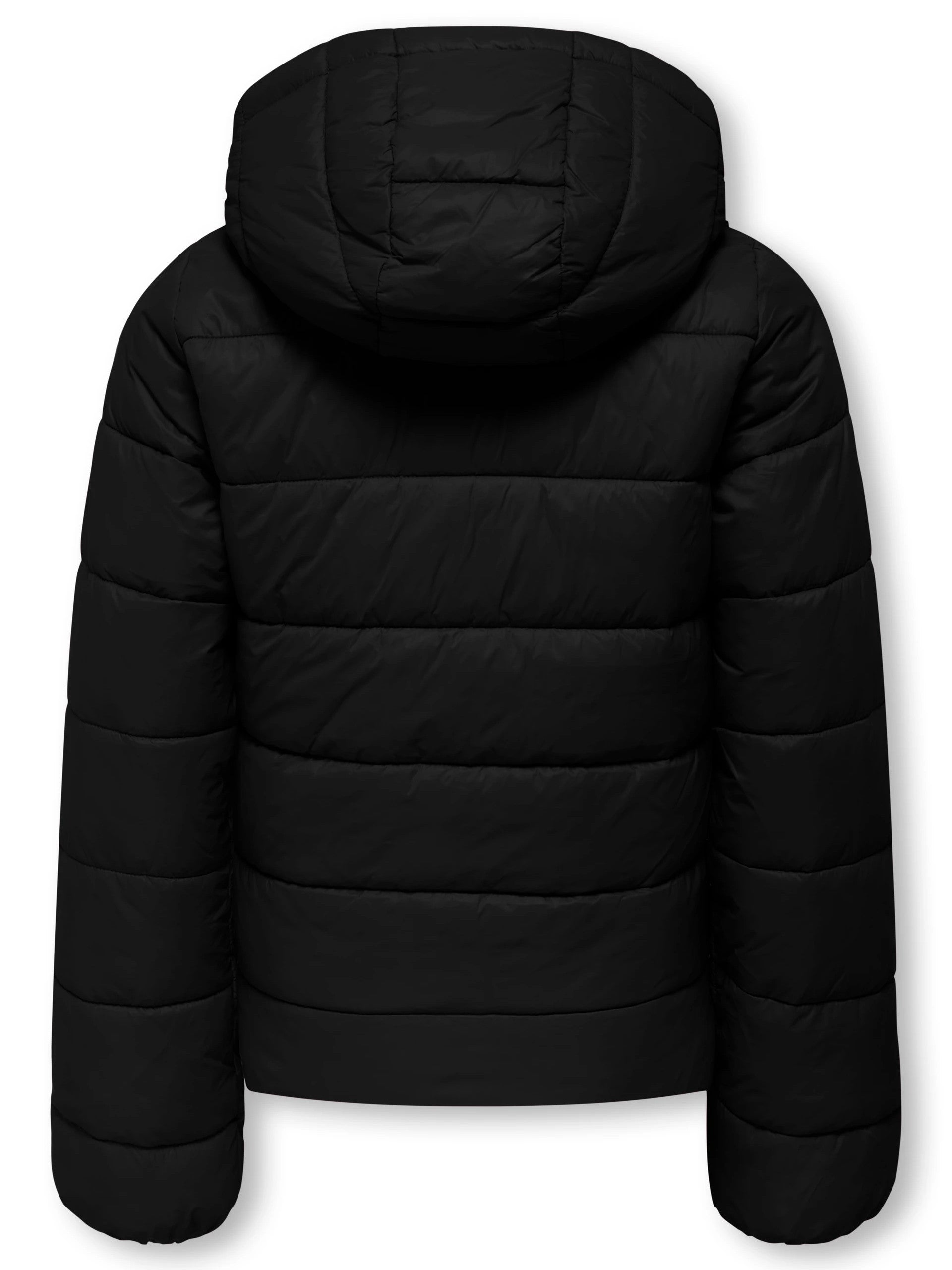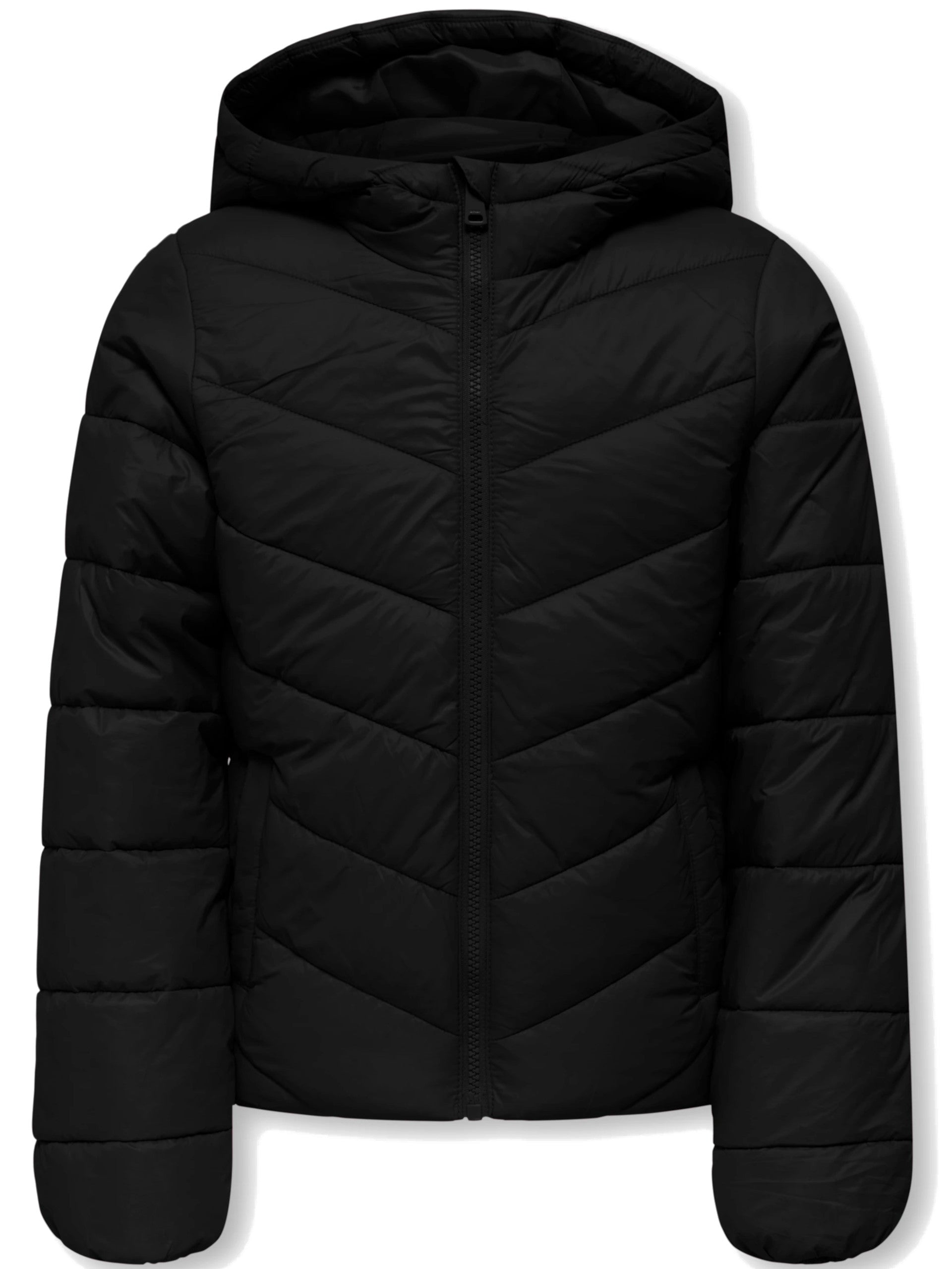 Piumino Only nero da bambina full zip con cappuccio 15351633. Questo giubbino da bambina ha il cappuccio fisso, la chiusura full zip centrale, due tasche laterali aperte e polsini elasticizzati.