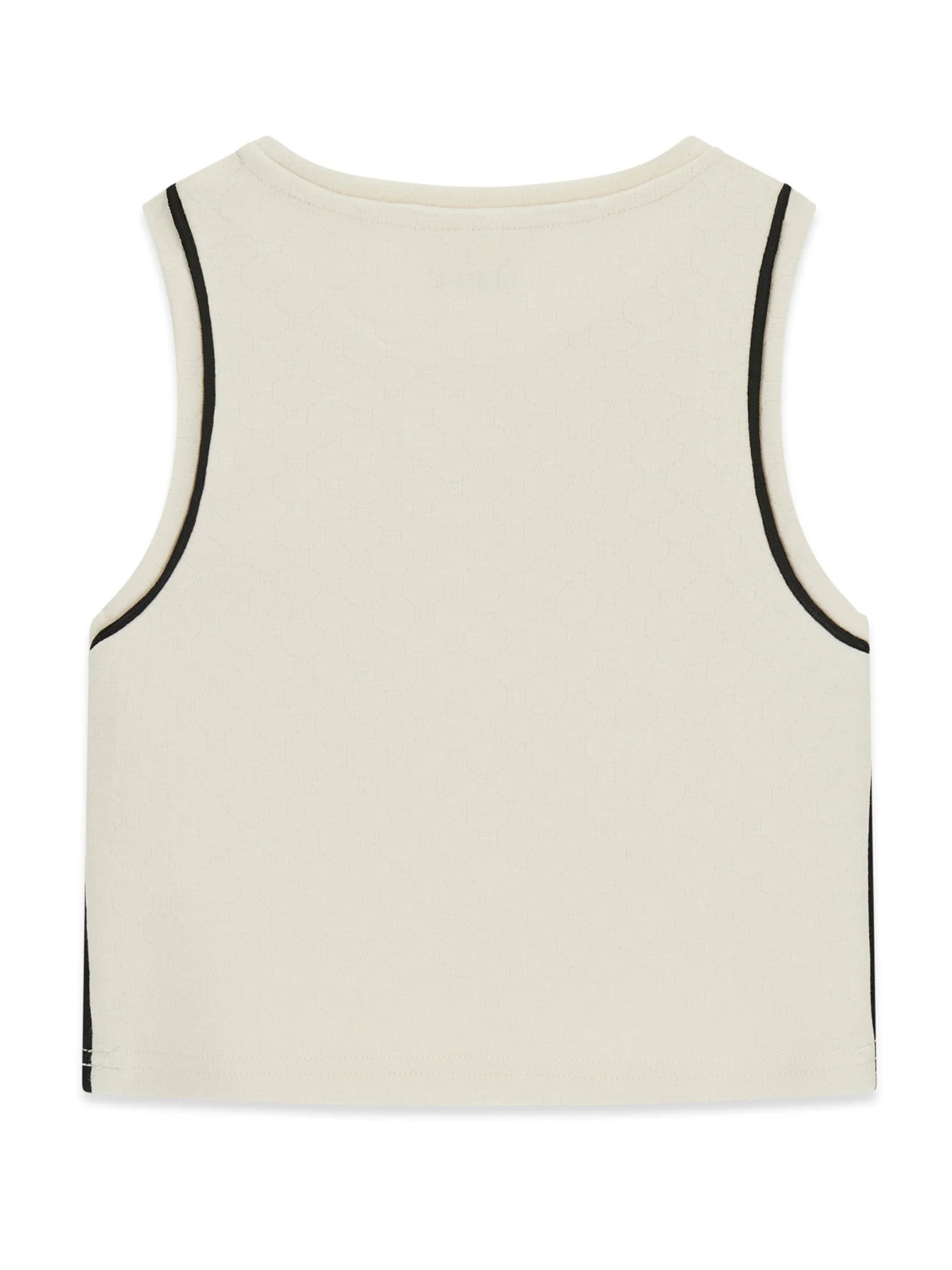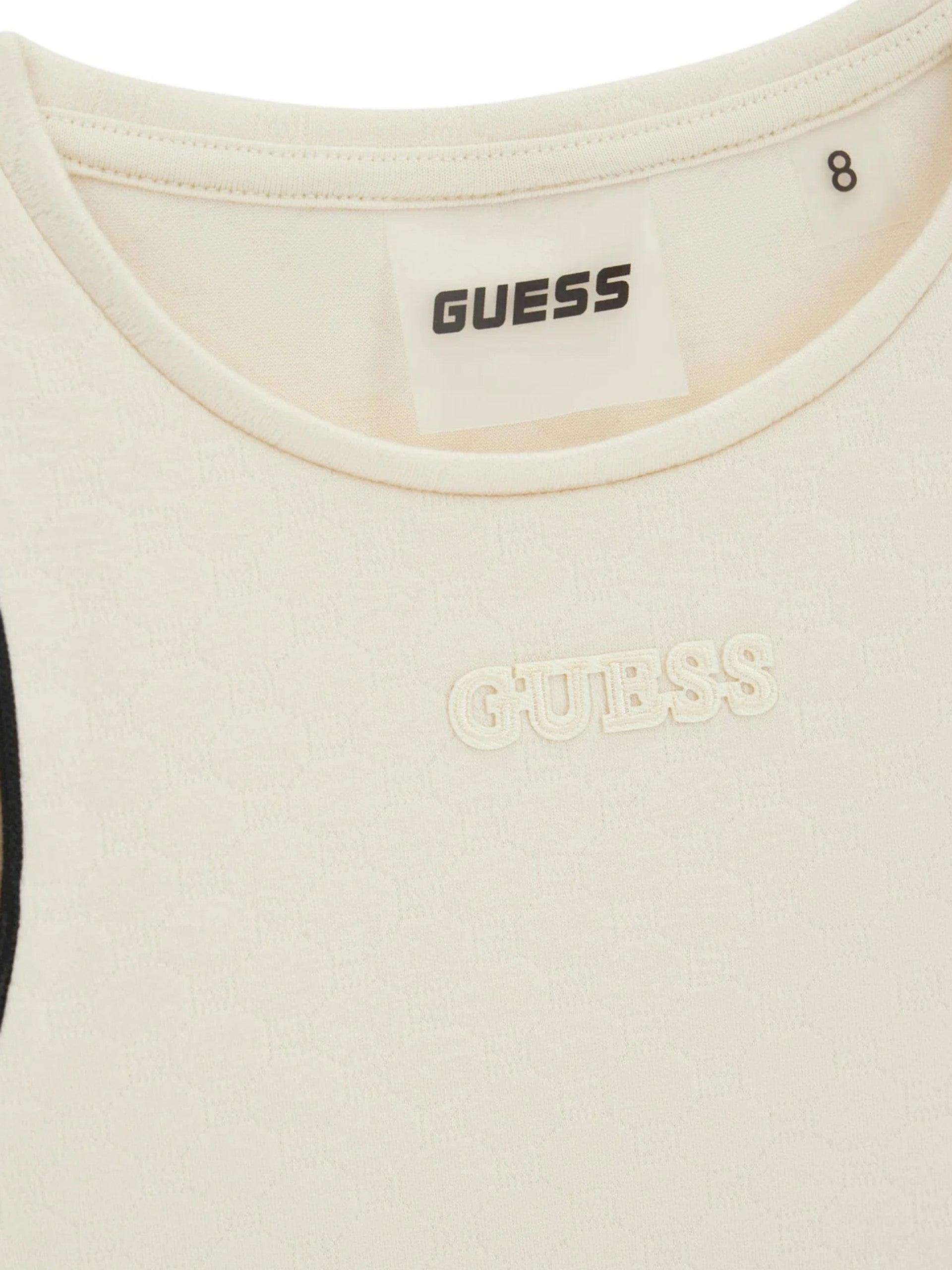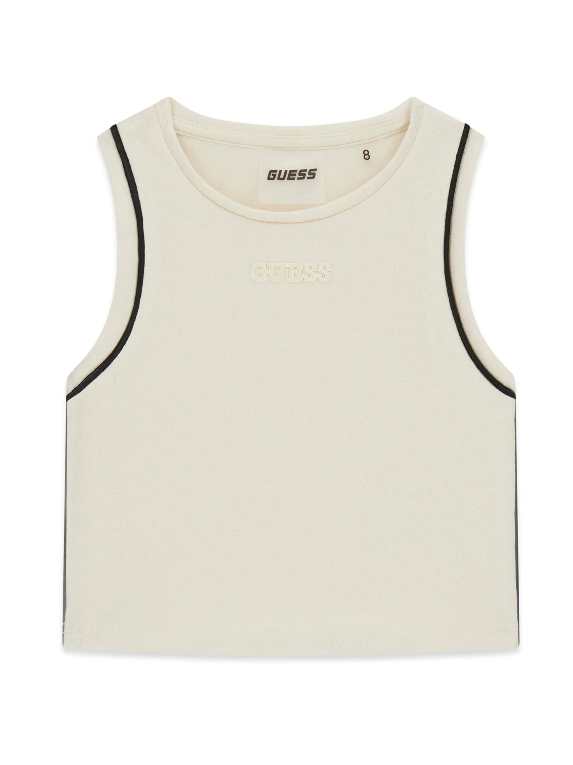 Canotta beige da bambina Guess. Questa canotta Guess, realizzata in viscosa, perfetta per la stagione, primavera-estate, perfetta per un outfit sportivo e casual, è caratterizzata dal scollo a giro, spalline larghe e la scritta Guess in basso a sinistra