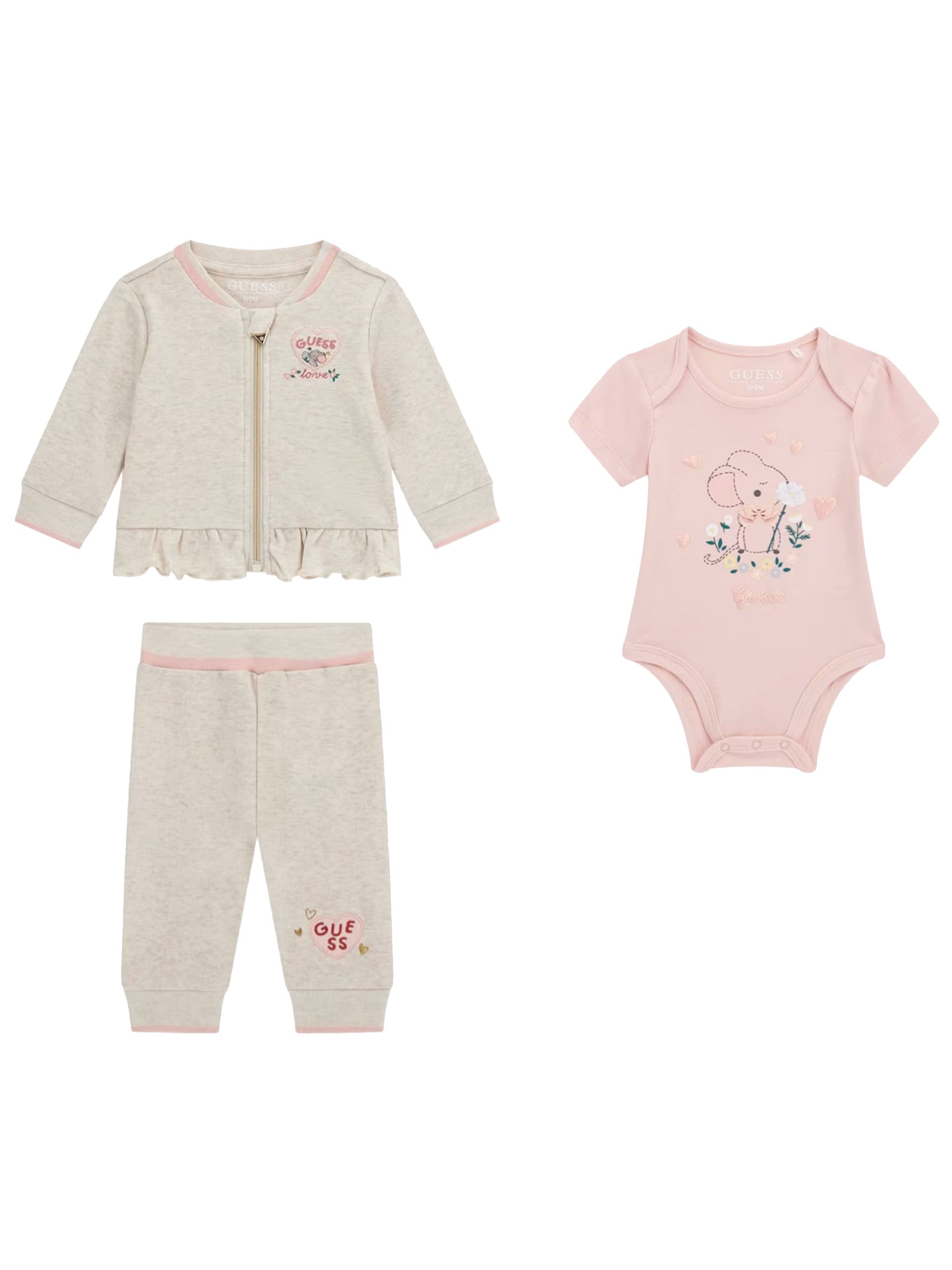 Completo Guess beige-rosa da neonata. Questo completo Guess è caratterizzato dalla felpa beige, body rosa e pantaloni tuta beige e sono realizzati in 100% puro cotone. la felpa beige è caratterizzatodalla chiusura full zip, logo applicato a lato cuore, girocollo, maniche lunghe con polsini elasticizzati a costine e fondo svasato. Il body rosa è caratterizzato dal girocollo, maniche corte, sul davanti troviamo la scritta Guess e la stampa con i cuori. Infine il completo è caratterizzato dal pantalone tuta beige che ha la banda elastica in vita e il fondo elasticizzato a costine con il cuore stampato.
