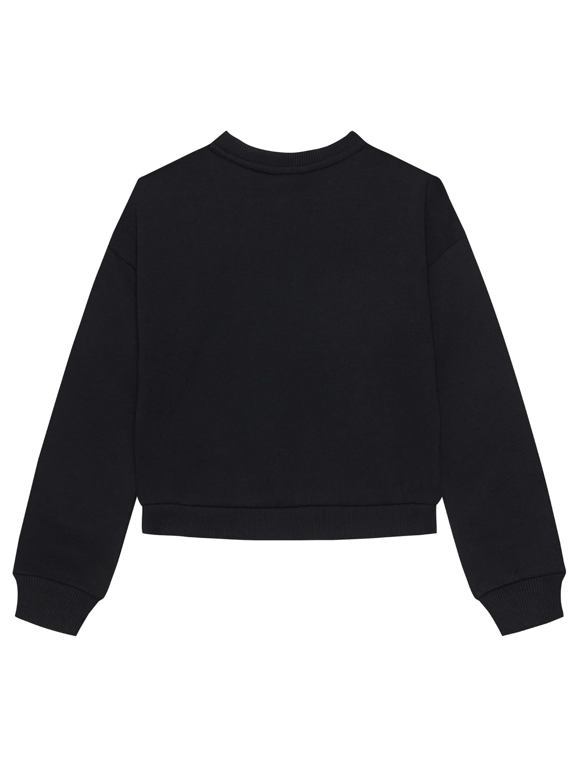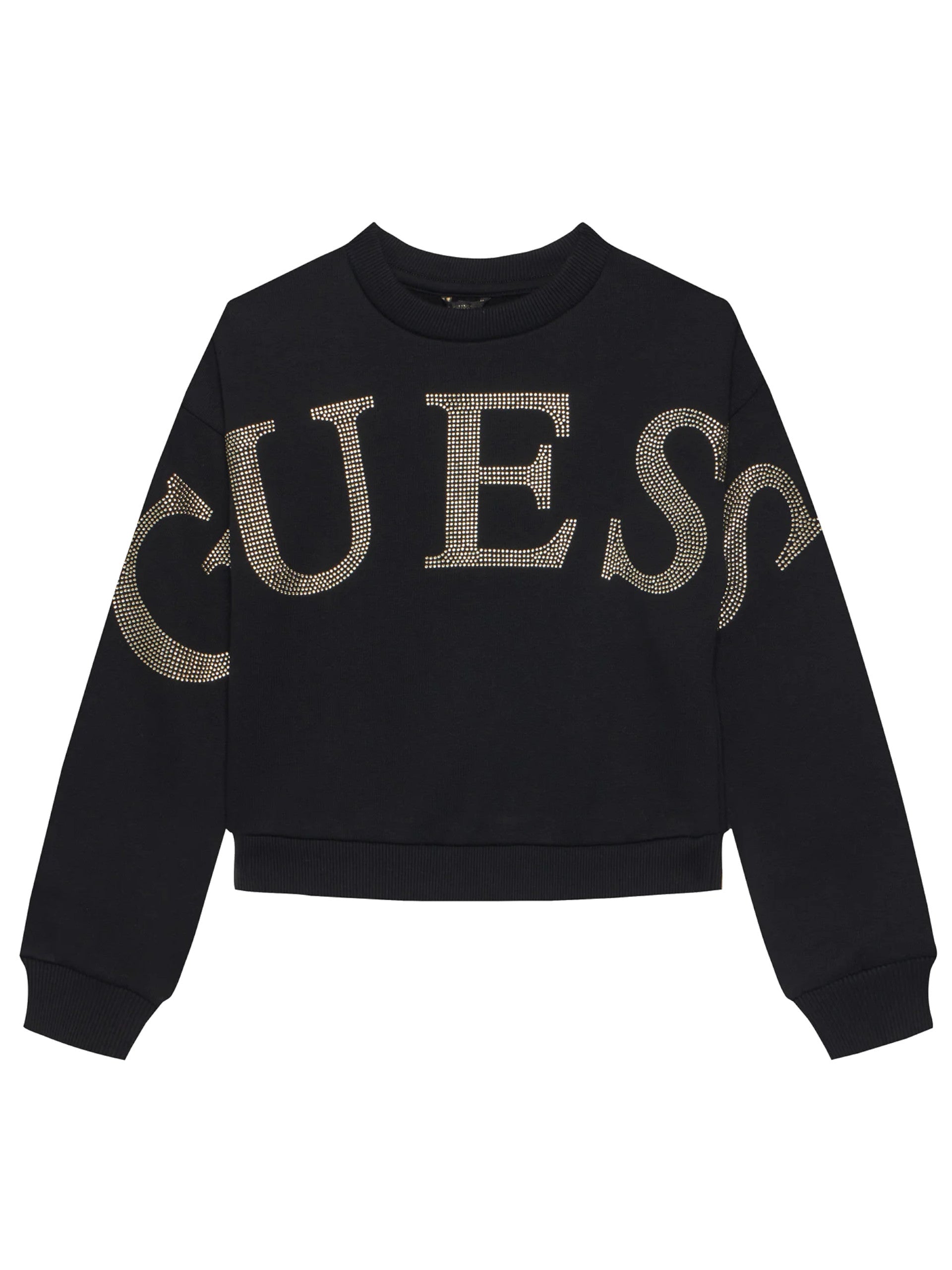 Felpa Guess nera in cotone felpato da bambina. Questa felpa Guess a maniche lunghe è realizzata da 100% cotone ed è caratterizzata da maxi logo brillantinato centrale con polsini e fondo elasticizzati