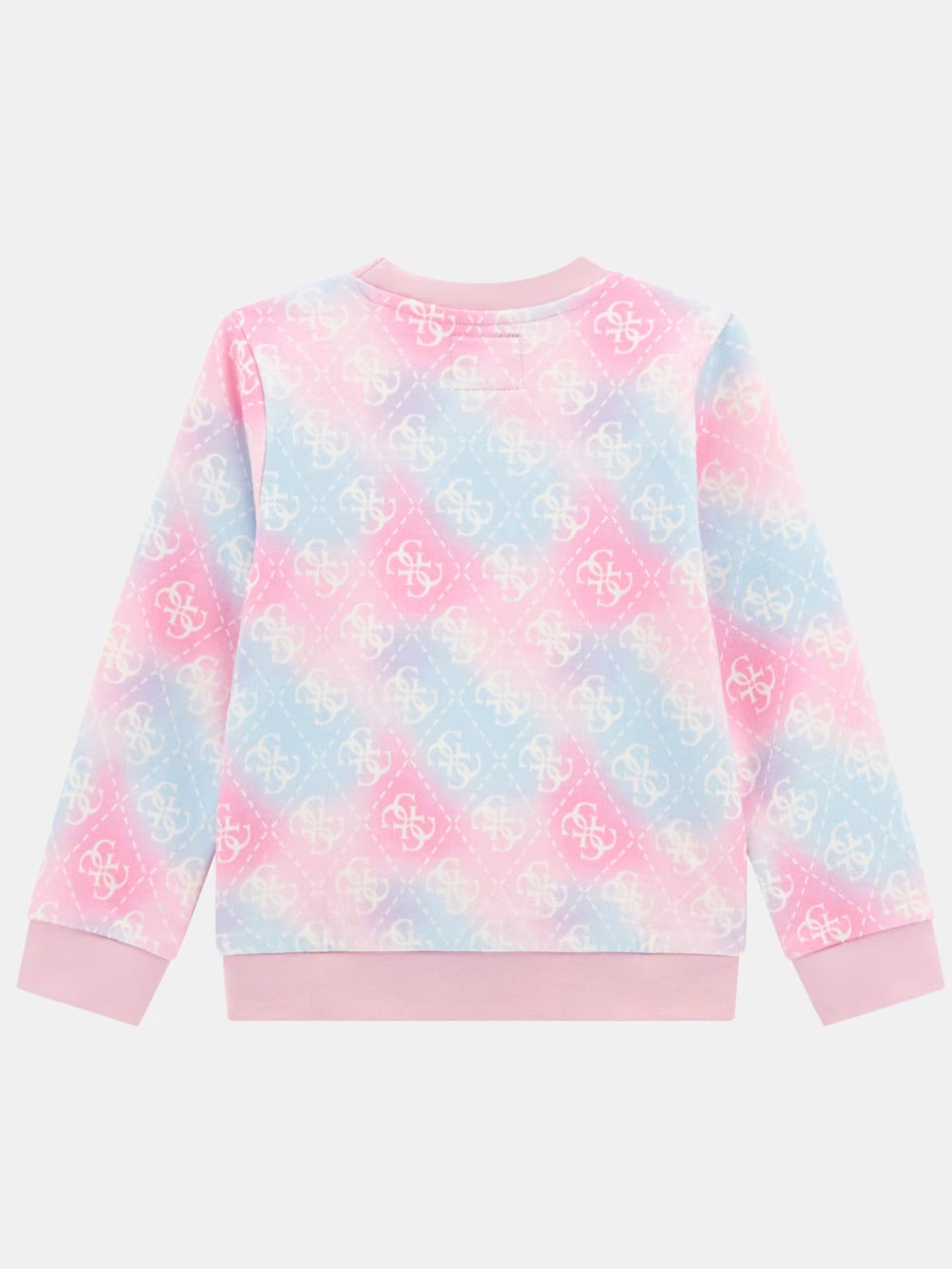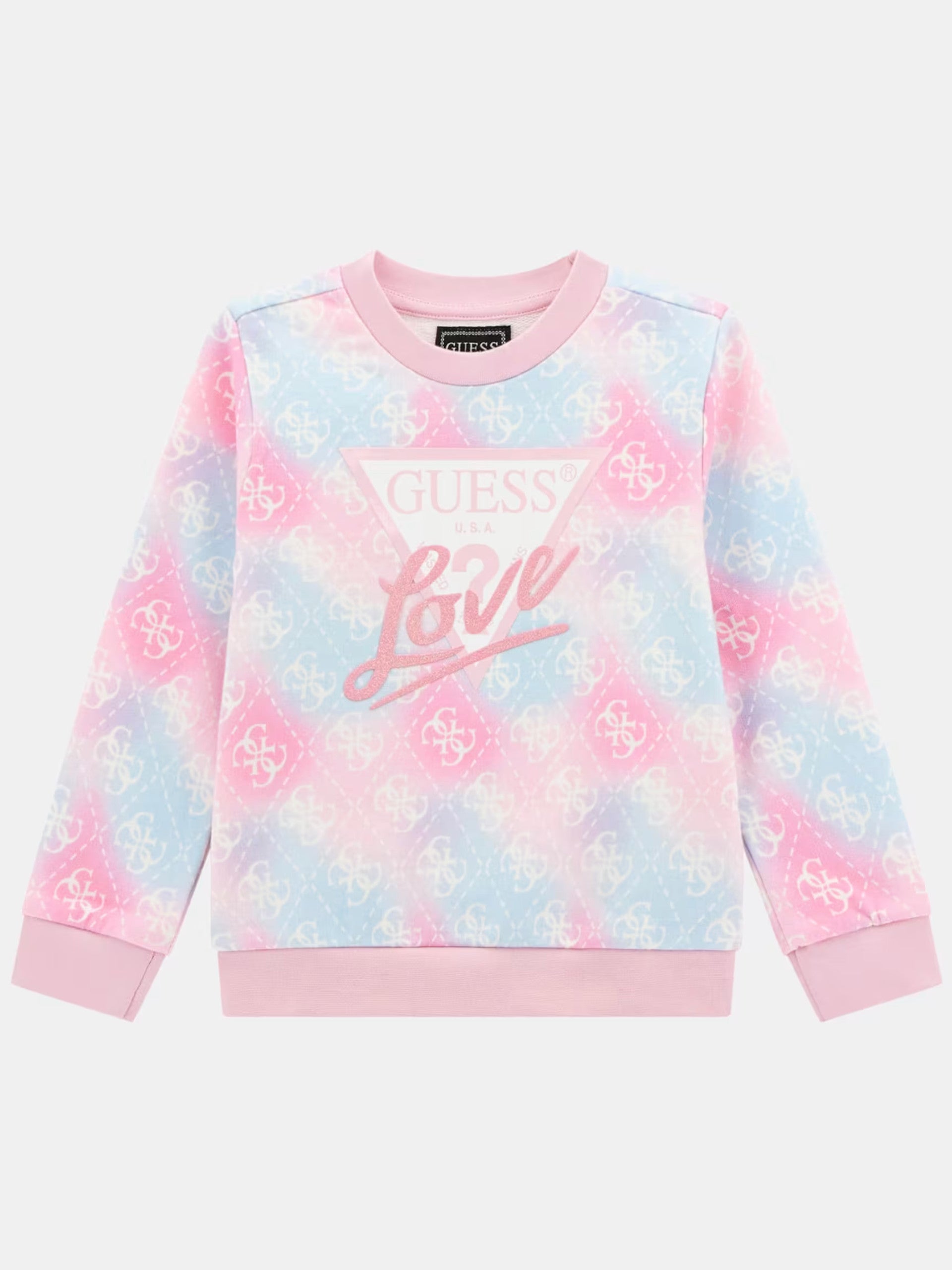 Felpa Guess rosa da bambina logo con patch e glitter K5YQ02KA6R4, realizzata in 100% puro cotone. Questa felpa Guess rosa girocollo ha le maniche lunghe con polsini elasticizzati e il logo Guess triangolo con glitter Love.