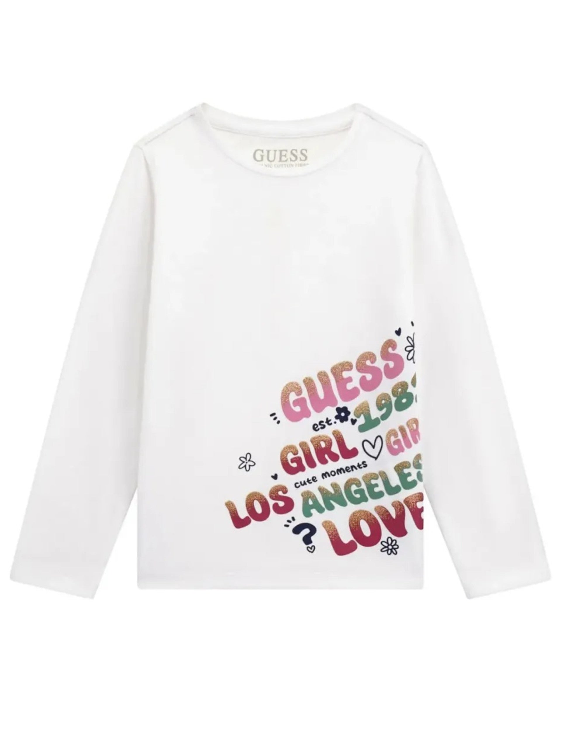 Maglia Guess bianca maniche lunghe da bambina stampa Guess con glitter K5YI22K6YW4, realizzata in cotone. Questa t-shirt Guess girocollo ha le maniche lunghe e la stampa Guess applicata sul fondo conglitter.