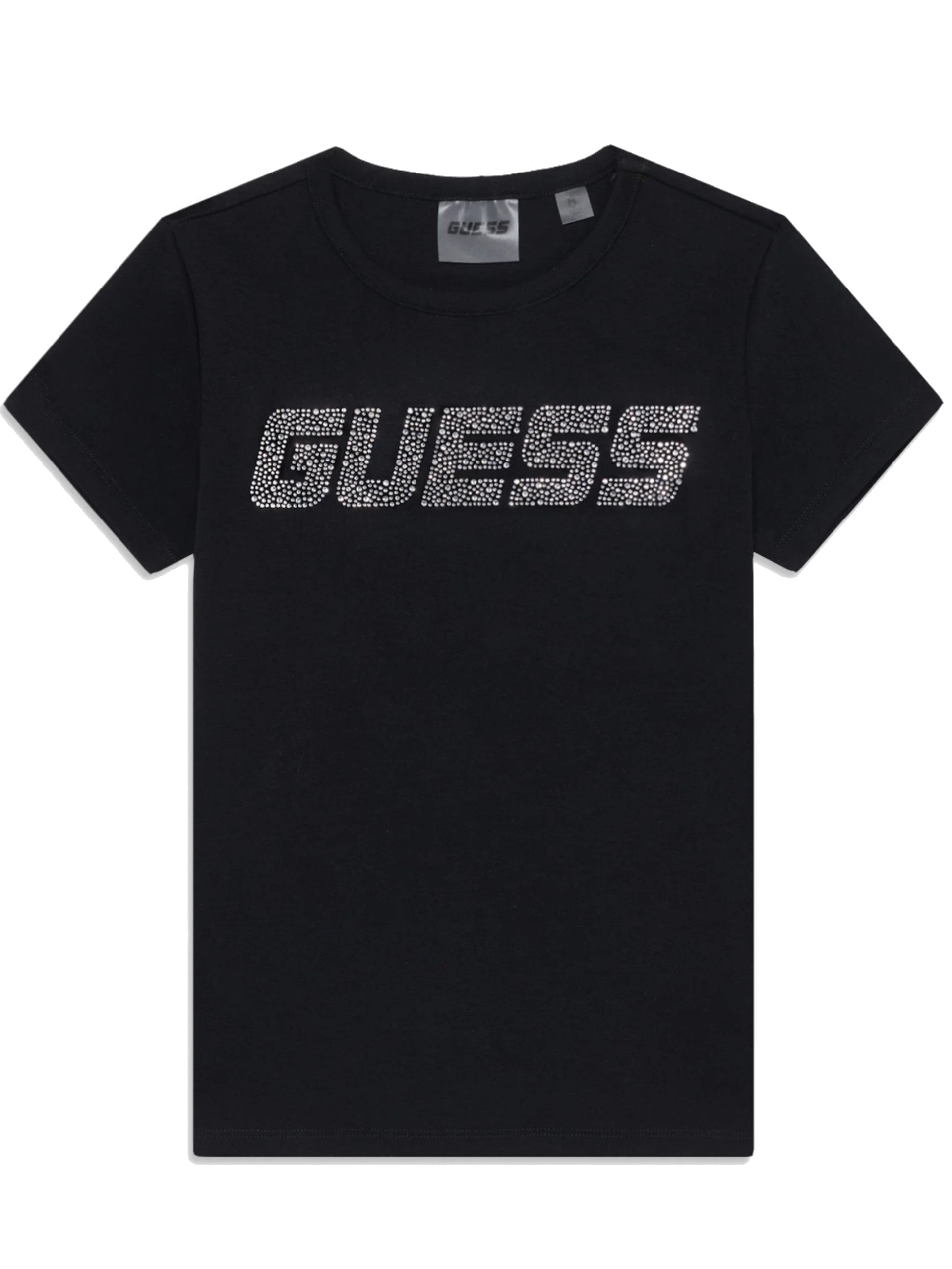 Maglia Guess nera da bambina logo Guess con strass Minime J5YI42KCIV1, realizzata in cotone. Questa t-shirt Guess girocollo ha le maniche corte e il logo Guess sul davanti con strass.