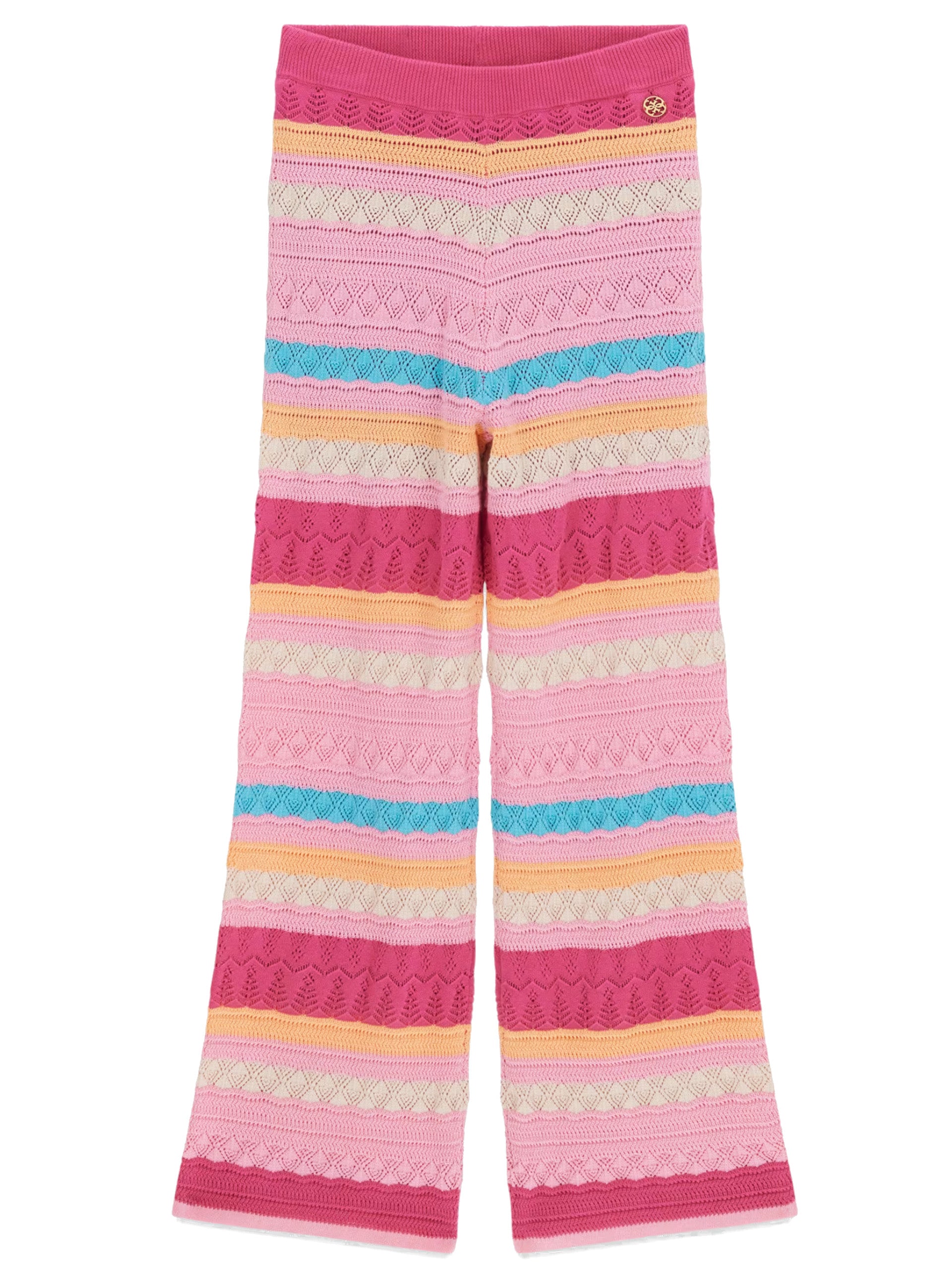 Pantaloni in maglia Guess rosa da bambina a palazzo. Questi pantaloni da bambina, realizzati 100% in puro cotone, perfetti per la stagione primavera-estate e perfetti per un outfit casual, hanno la banda elasticizzata sul punto vita, gamba larga e sono stati realizzati in maglia