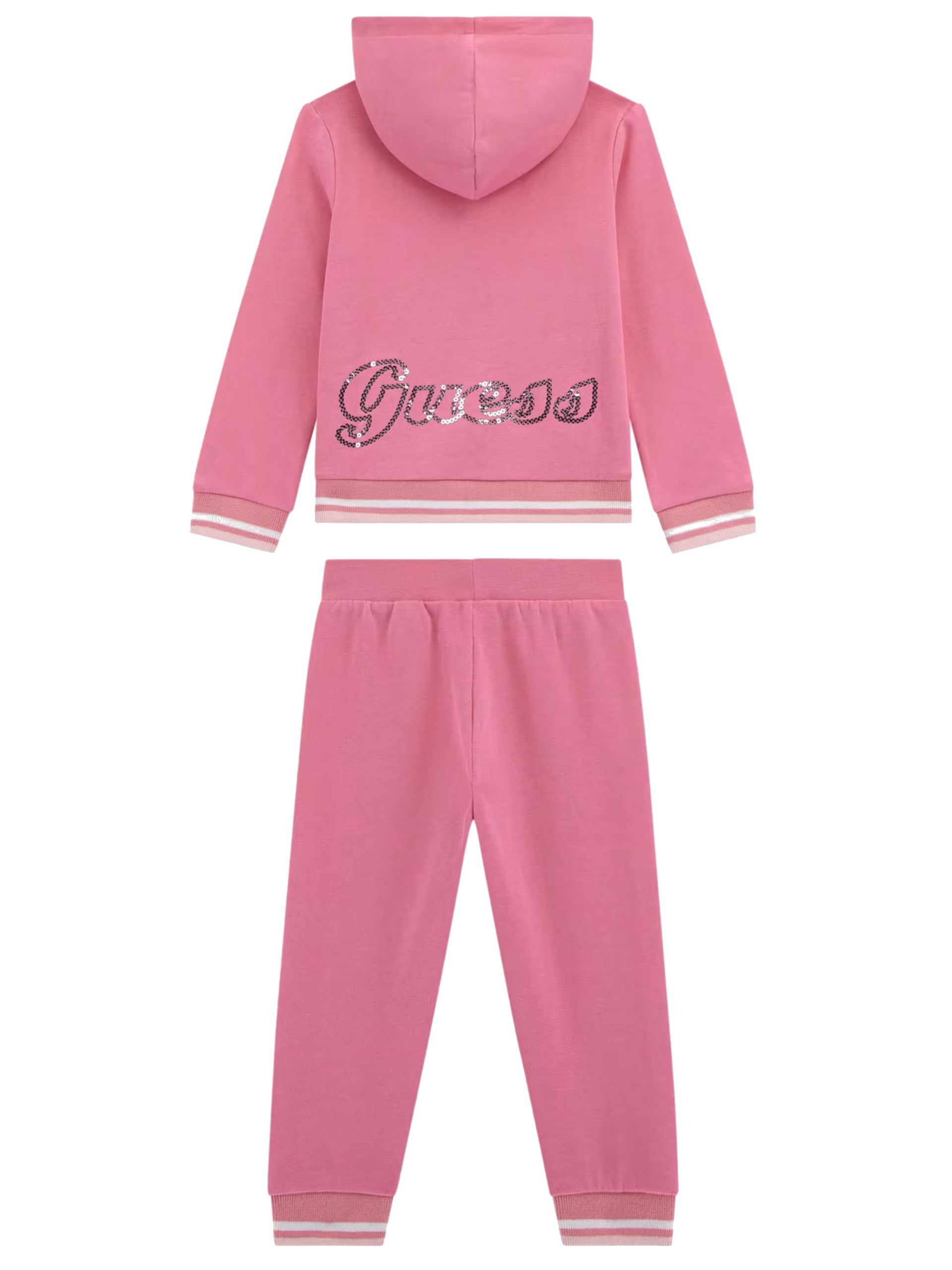 Tuta Guess rosa da bambina full zip logo con paillettes K5YG00KA6R4, realizzata in 100% puro cotone. La felpa di questa tuta Guess ha il cappuccio fisso, la chiusura full zip centrale, logo Guess ricamato lato cuore e logo posteriore con paillettes. I pantaloni di questa tuta Guess hanno la banda elastica sul punto vita, logo Guess con paillettes sul fondo e polsini elasticizzati.